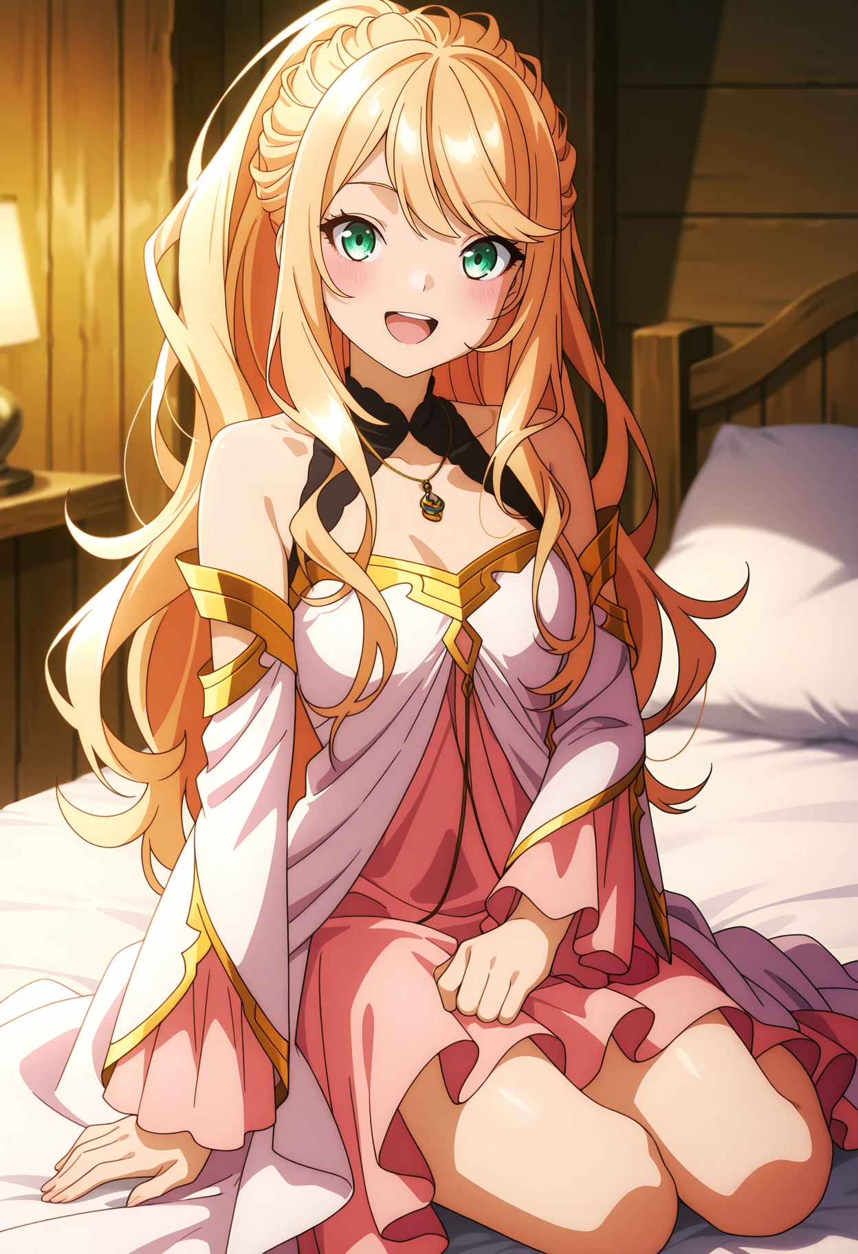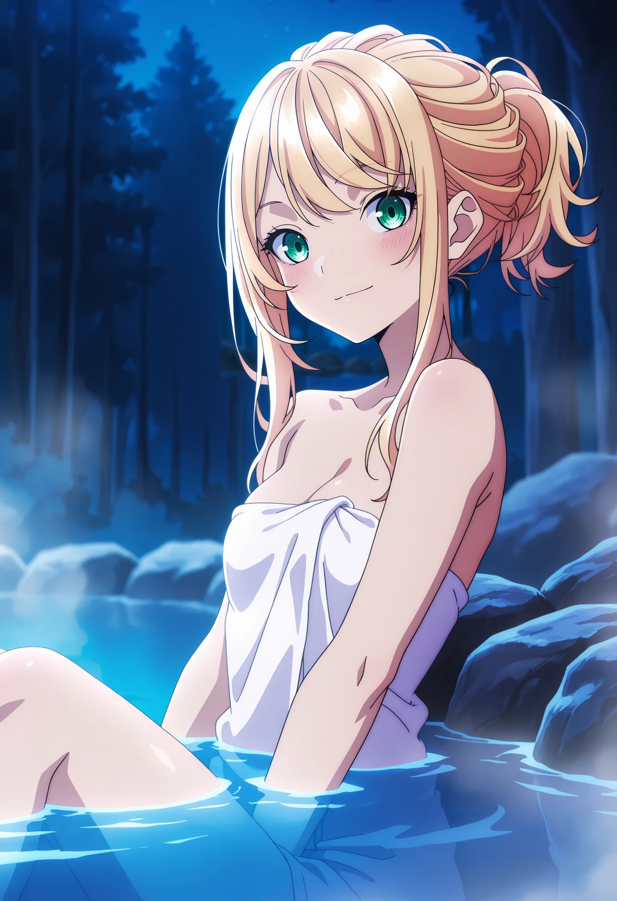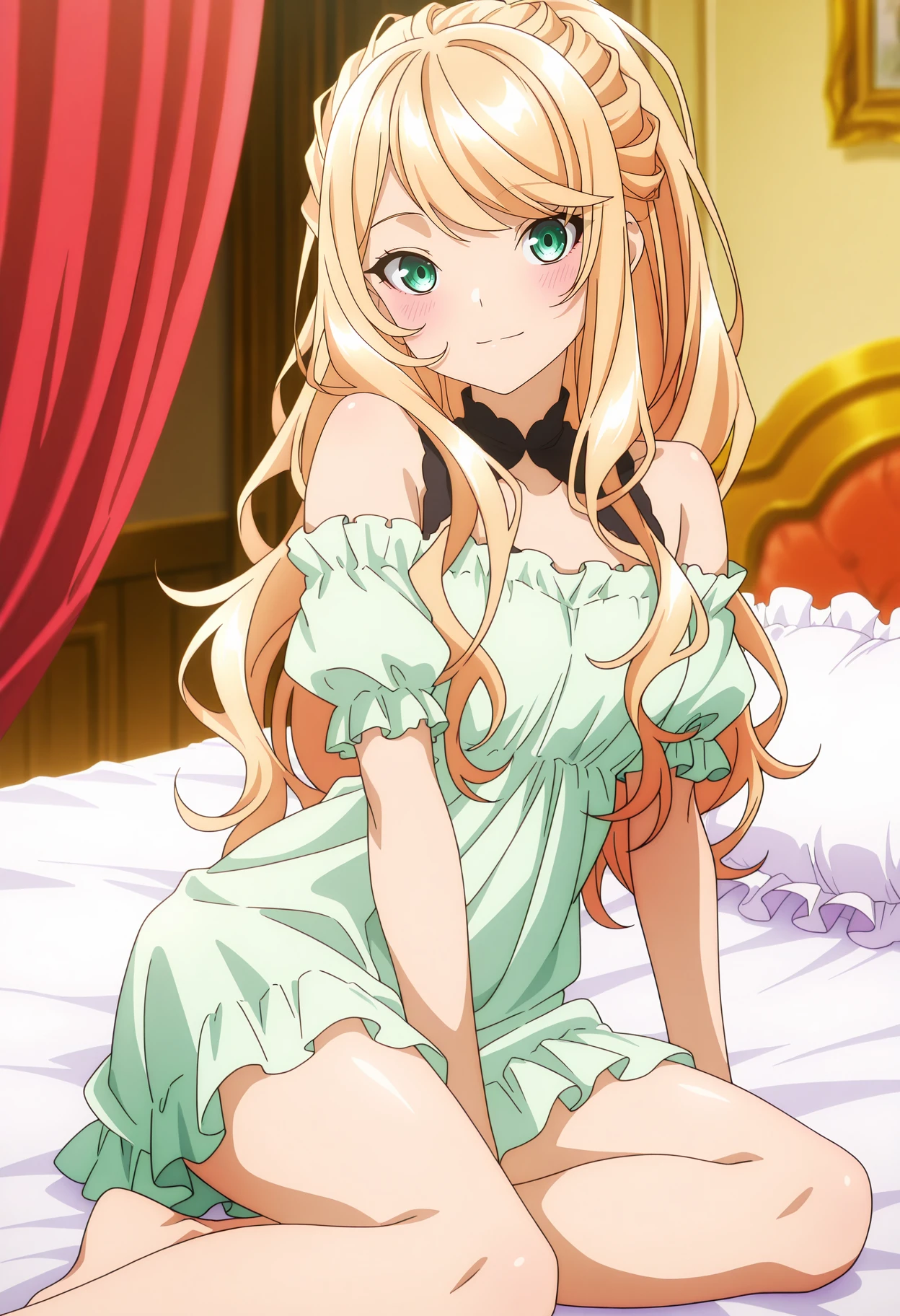 wide ponytail, long hair, swept bangs, blonde hair, green eyes