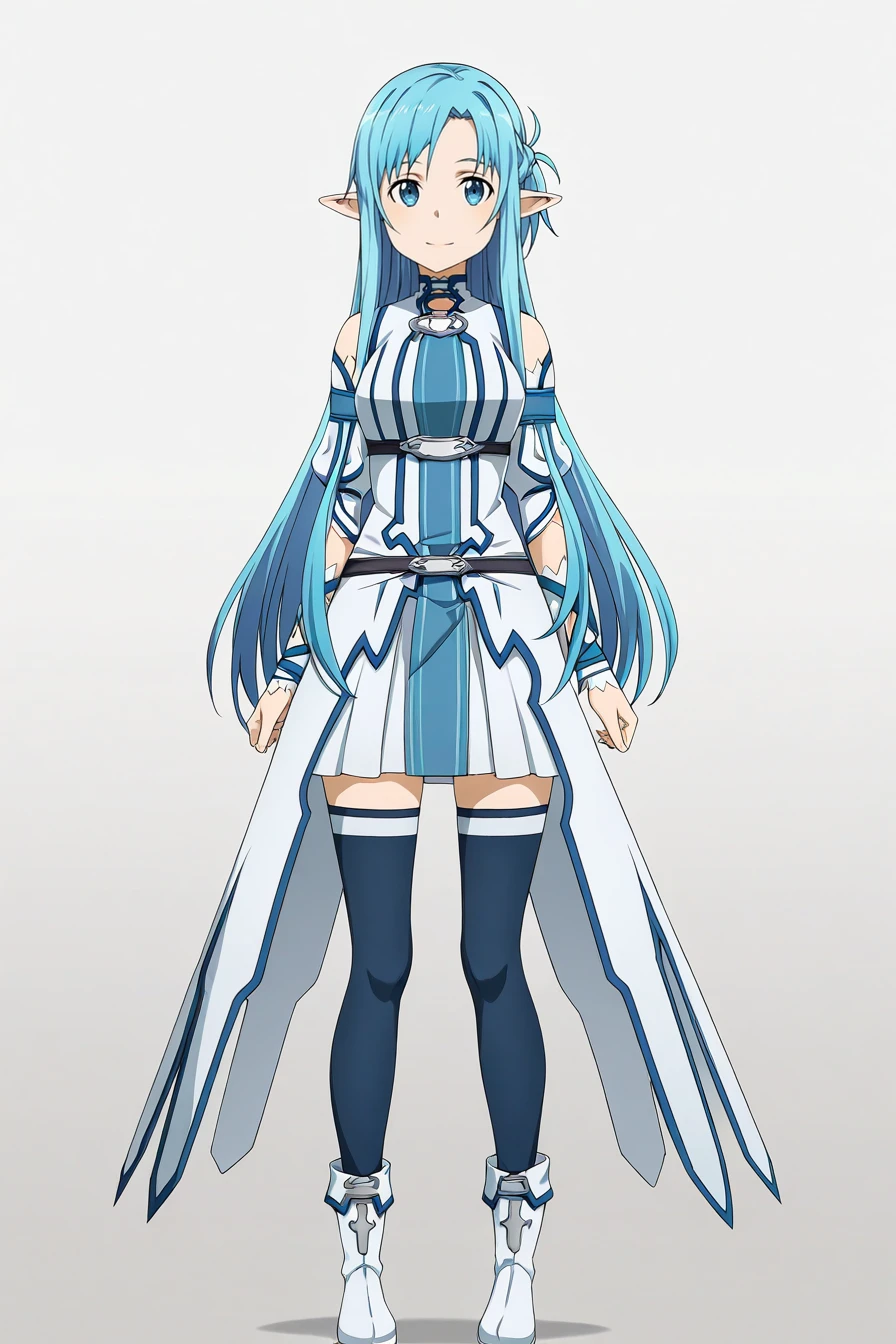 blue hair, sidelocks, pointy ears, blue eyes, pointy ears, undine outfit, white dress, detached sleeves, belt, white cape, blue thighhighs, white bootsAppearance & Outfit - SAO KOB
