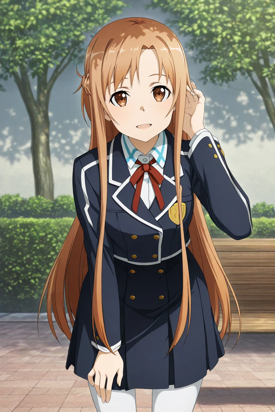 brown hair, sidelocks, brown eyes, school uniform, blue blazer, white collared shirt, red ribbon, school emblem, double-breasted, long sleeves, pleated skirt, white thighhighs, brown loafersAppearance & Outfit - ALO Titania