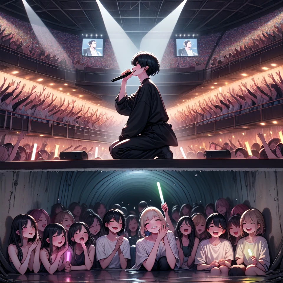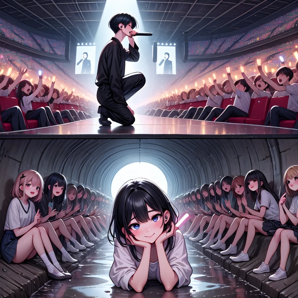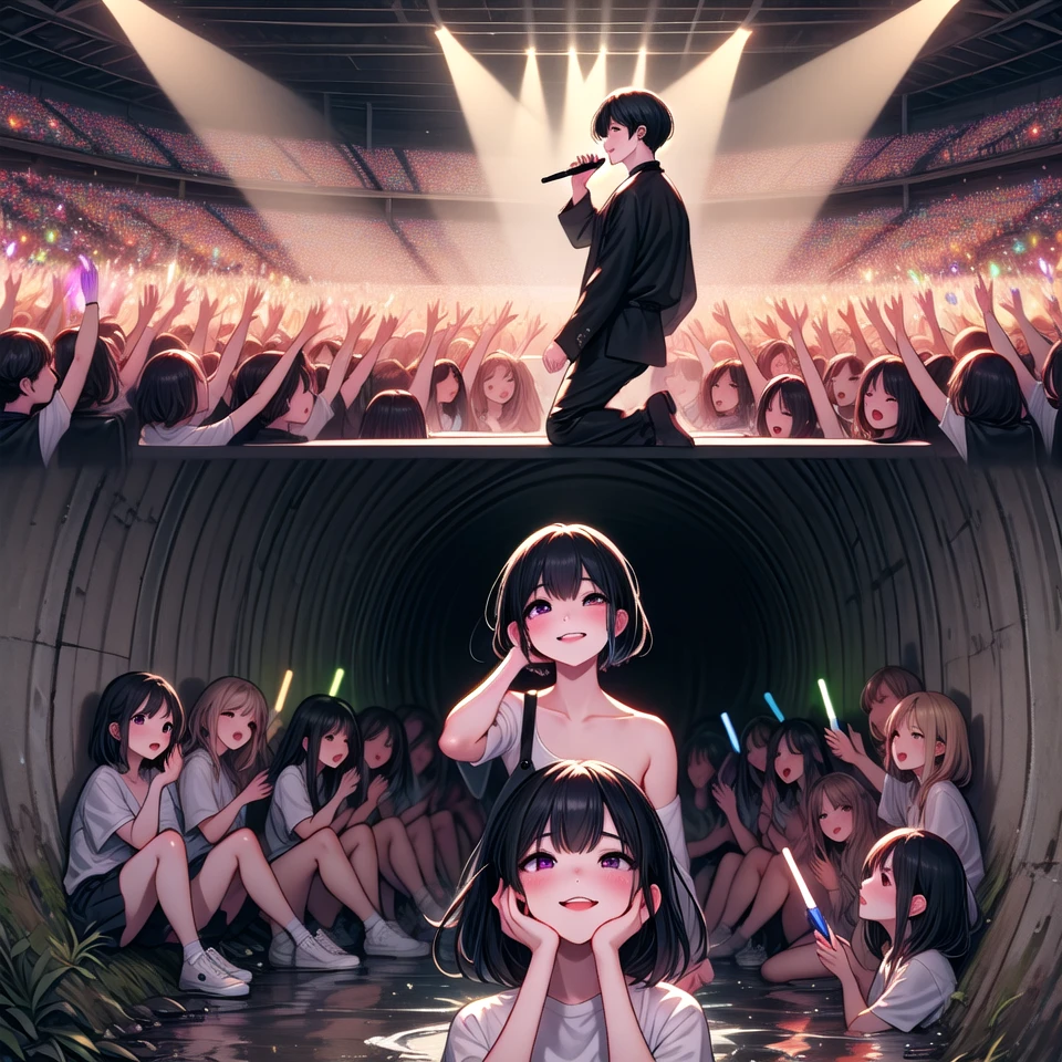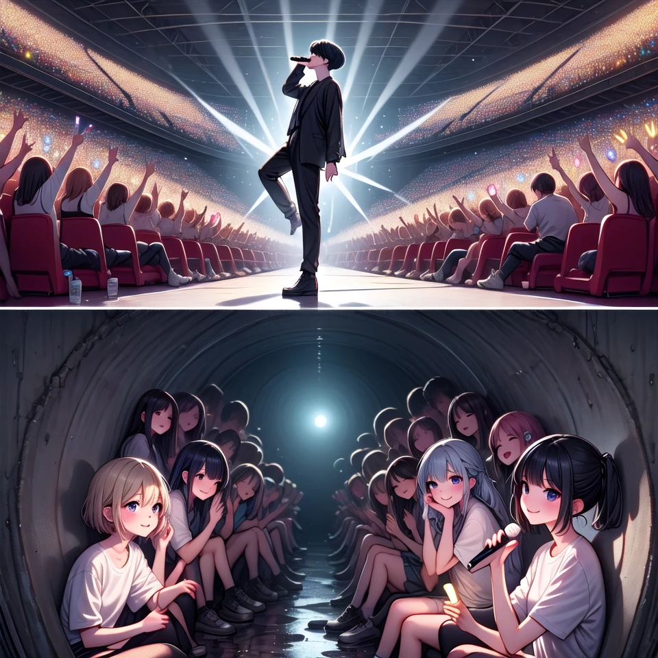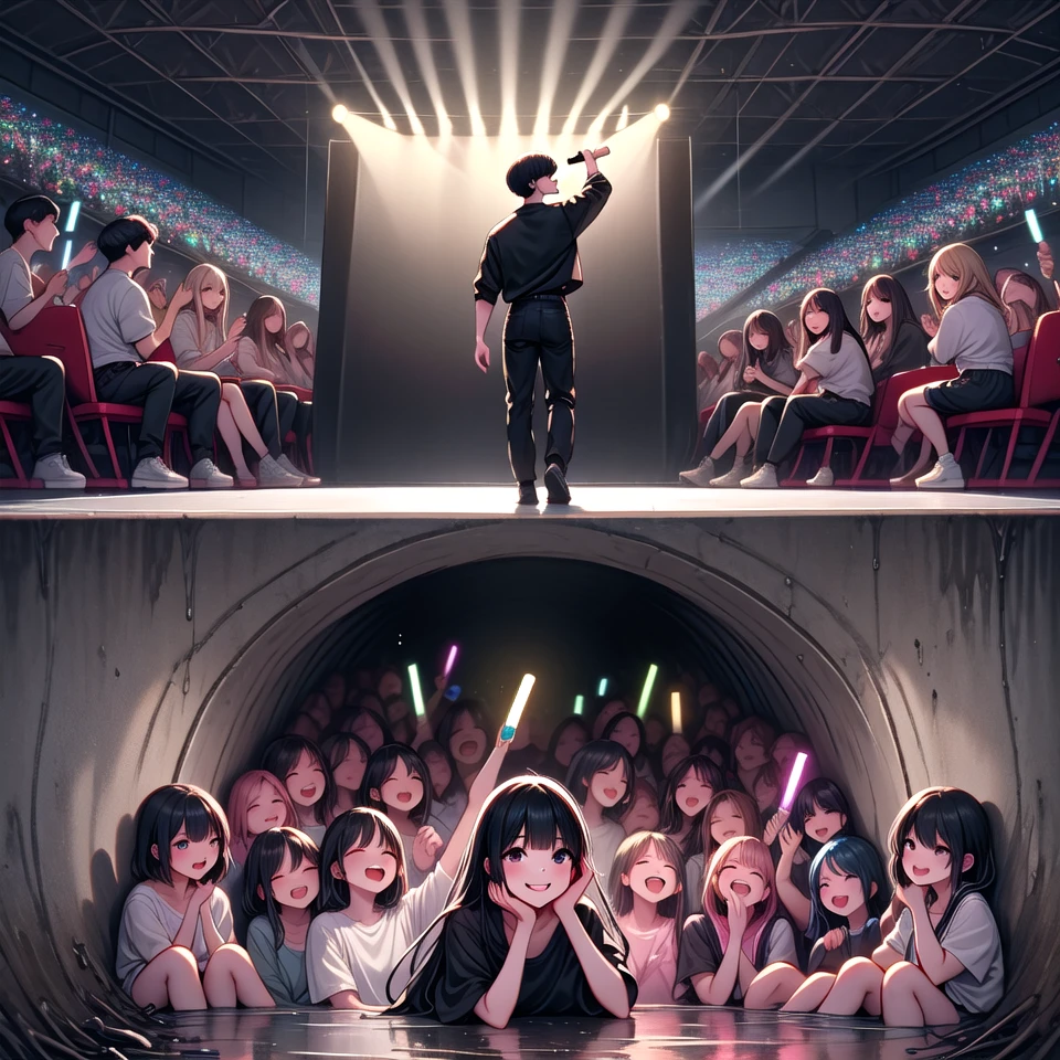 ((sewer concert)), ((stage)), ((solo)), 1boy, standing, arm up, glowstick, smile, close-up, 1girl, 6+girls, multiple girls in tunnel, crazy fans, music, night, cheering, partially submerged, junji ito artstyle,