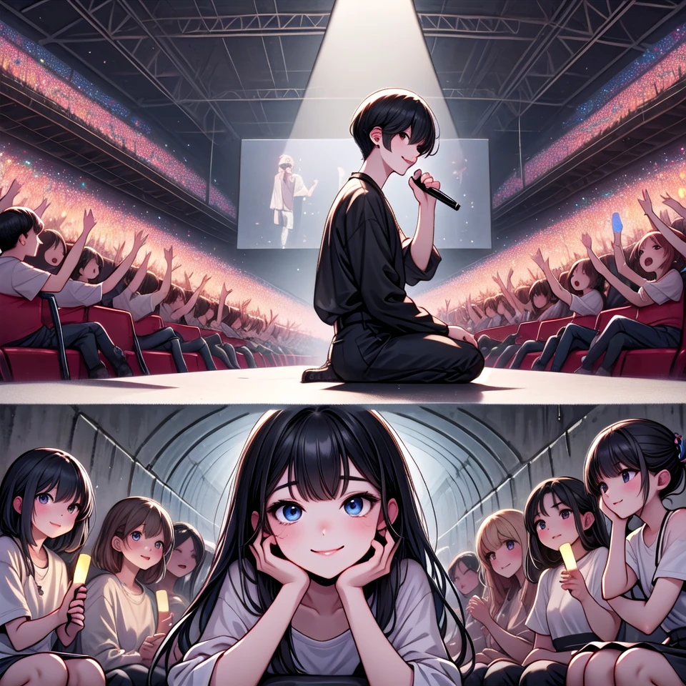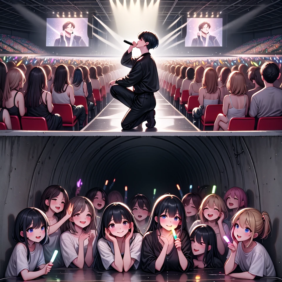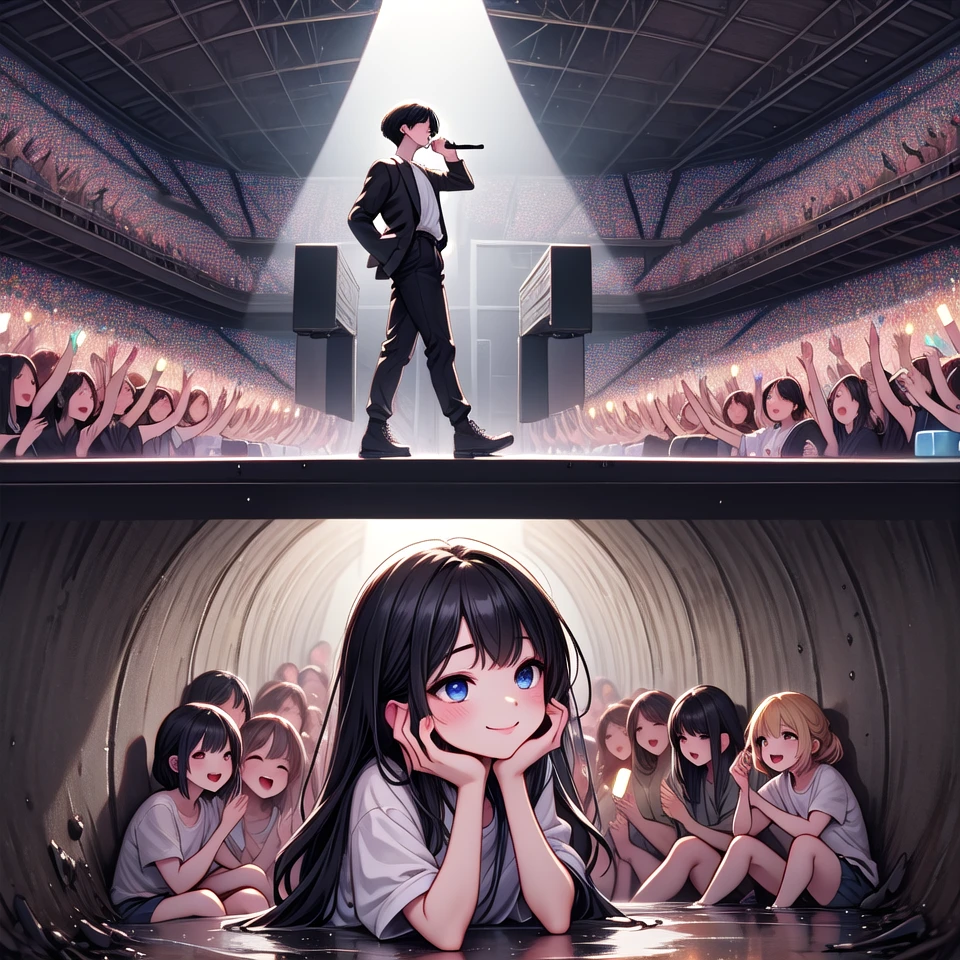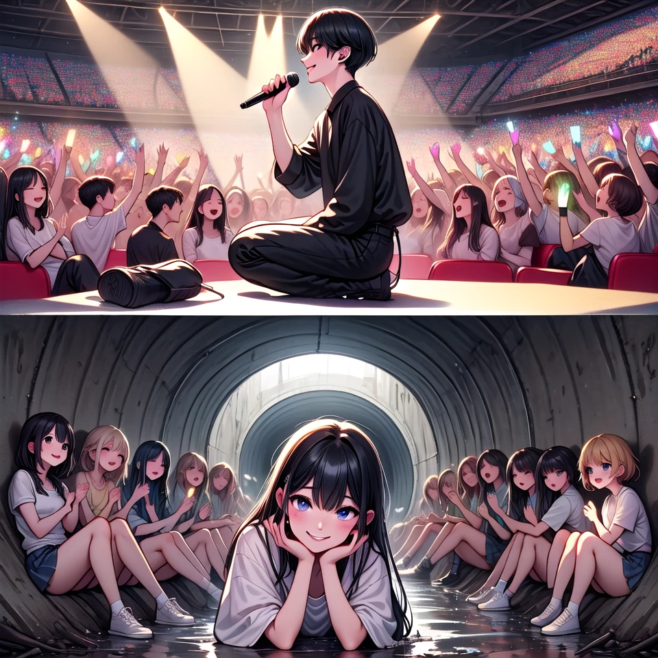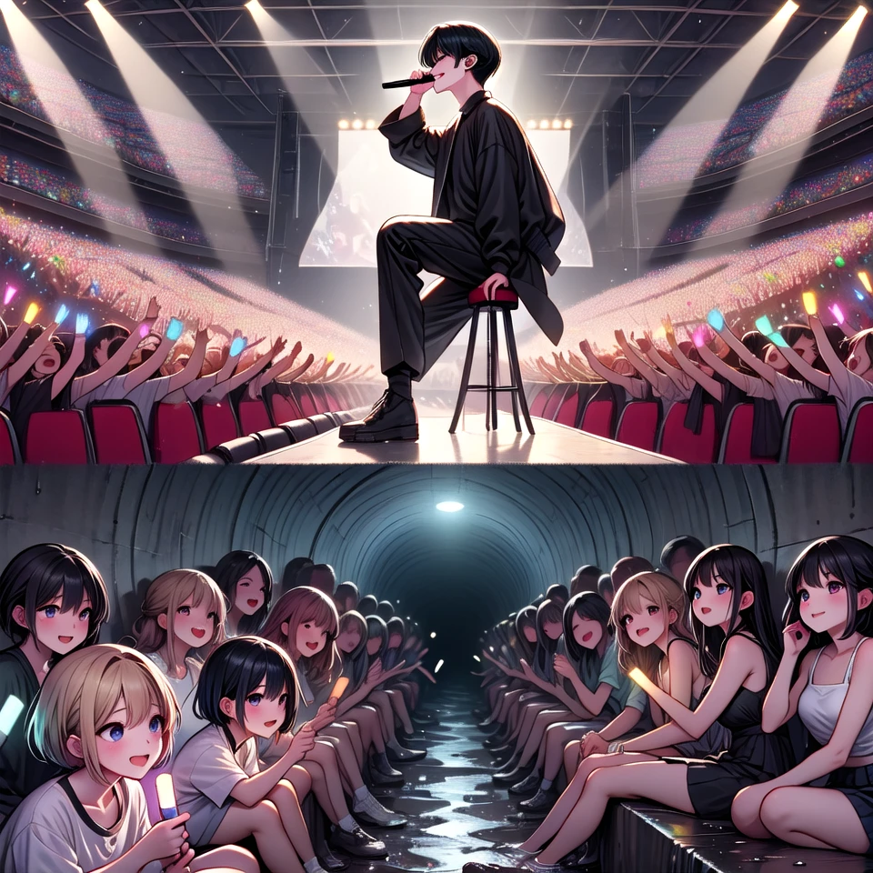 ((sewer concert)), ((stage)), ((solo)), 1boy, standing, arm up, glowstick, smile, close-up, 1girl, 6+girls, multiple girls in tunnel, crazy fans, music, night, cheering, partially submerged, junji ito artstyle,