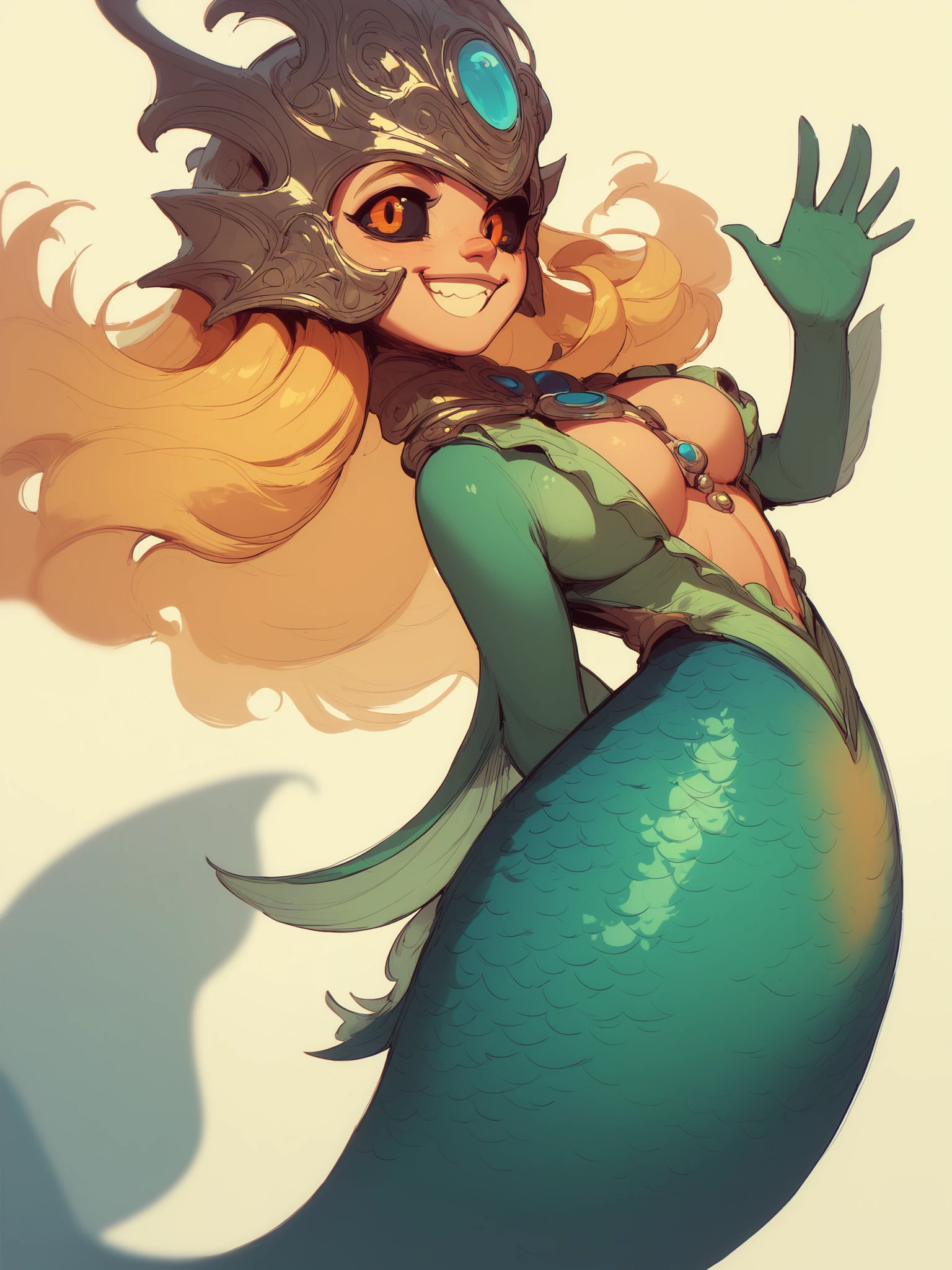Helpful tags include: mermaid, monster girl, blonde hair, colored sclera, black sclera, red eyes, orange eyes, helmet, jewelry