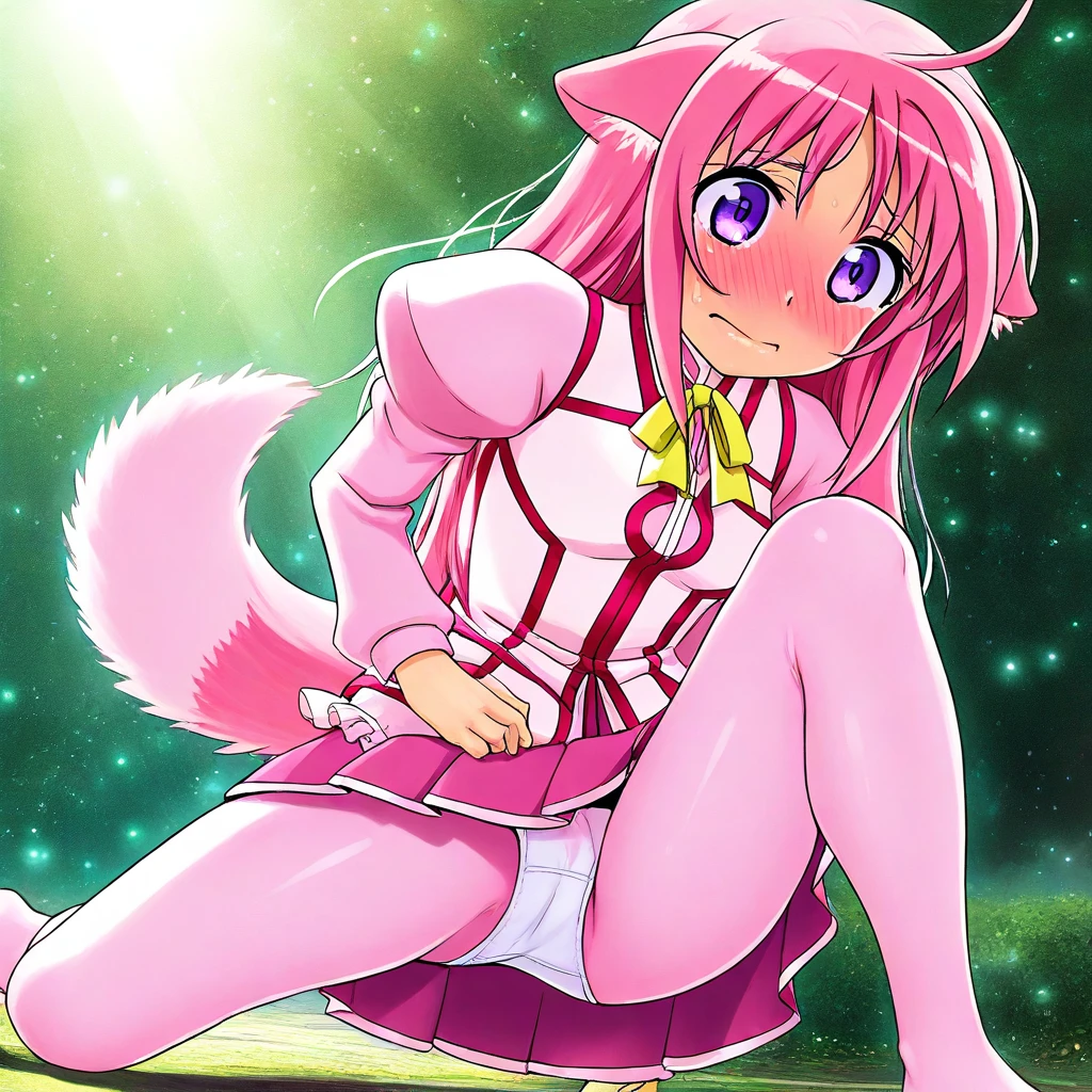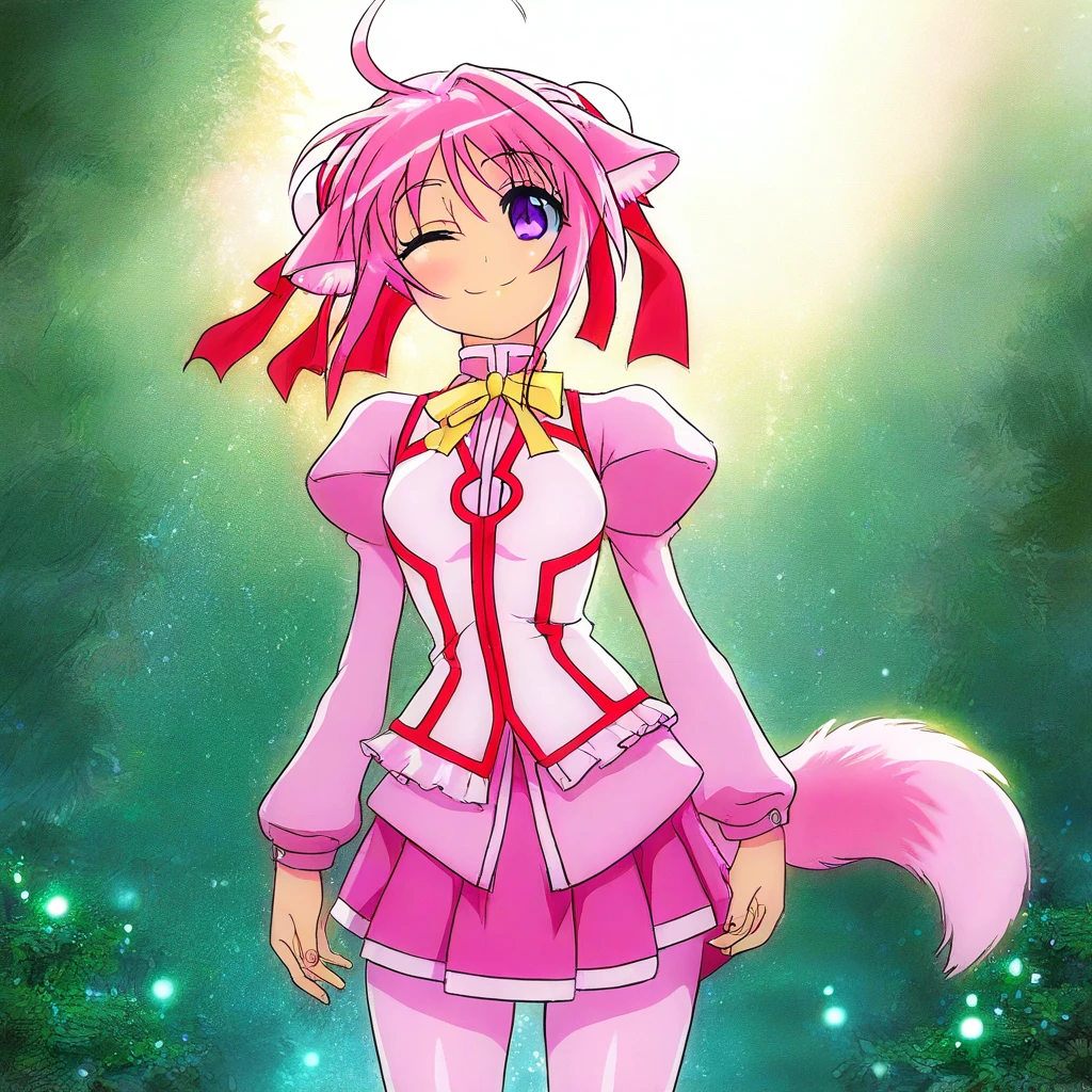 Outfit: MillhiFit, pink shirt, long sleeves, sleeveless light pink jacket with red trim, puffy sleeves, juliet sleeves, yellow ribbon, pink pleated skirt with light pink trim, fluffy pink tail, light pink pantyhose