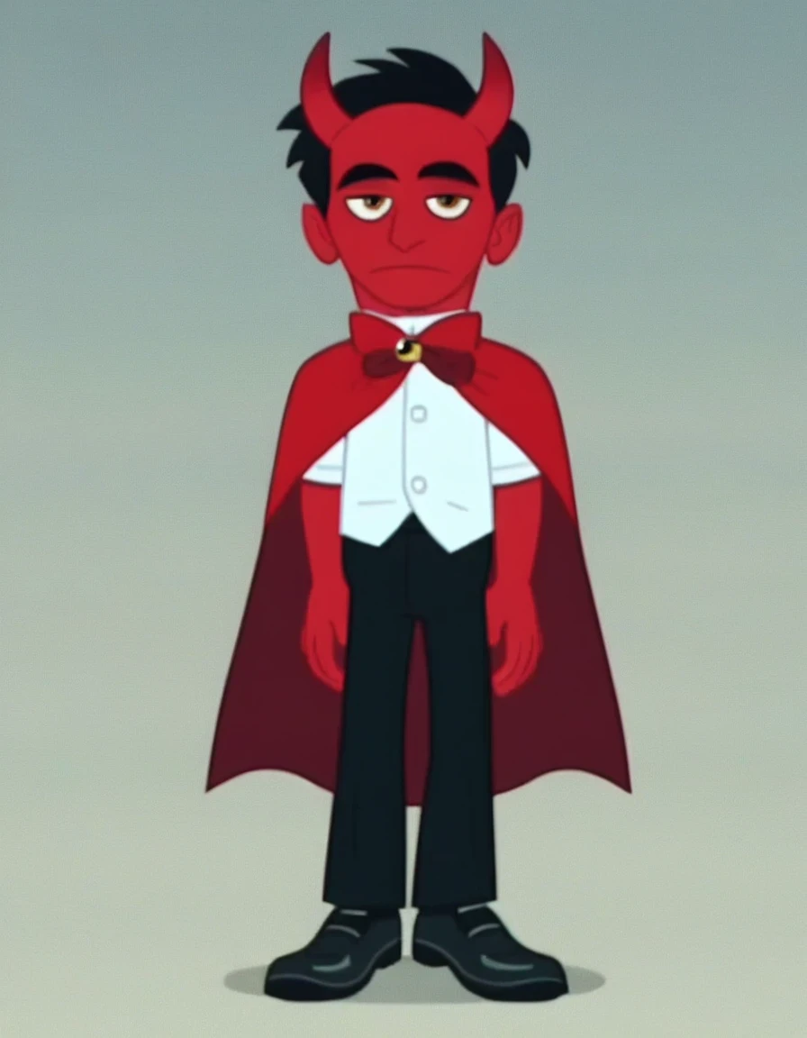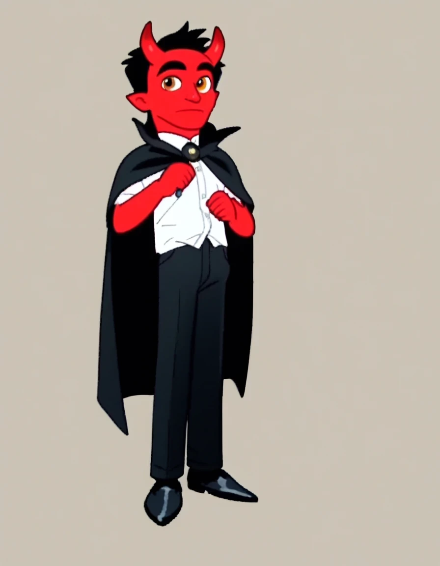 Craig_the_Devil, 1boy, shirt, white shirt, horns, pants, black cape, black pants, red skin, black hair, brown eyes, devil, black shoes,