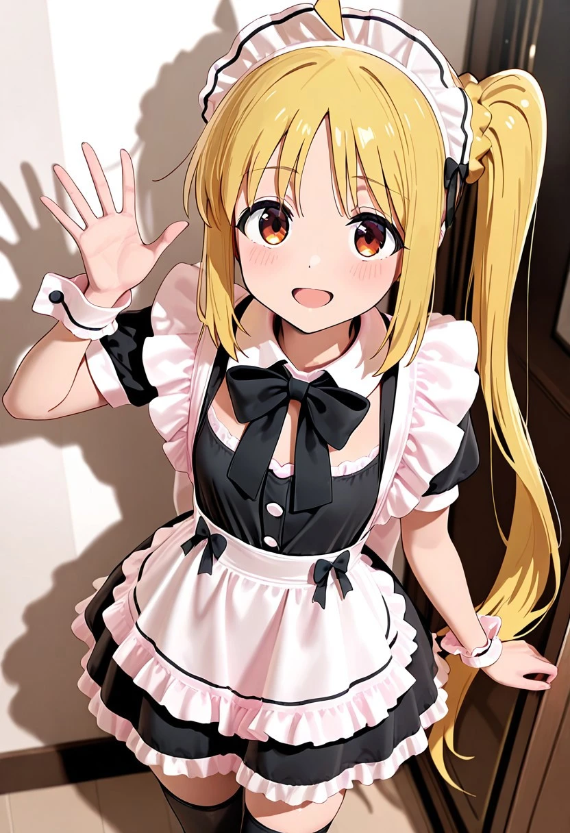ahoge,yellow hair,brown eyes, long hair, side ponytail,small breasts,