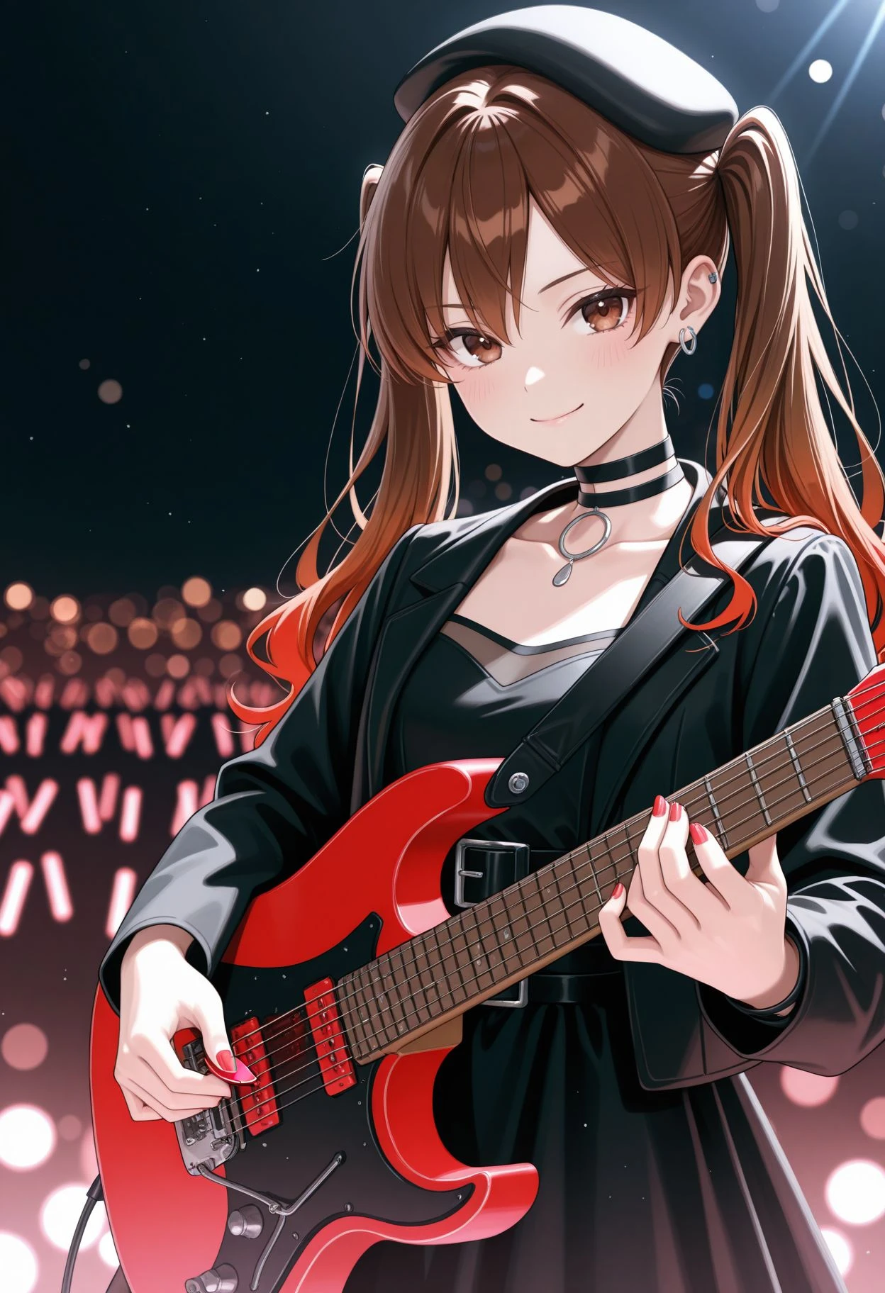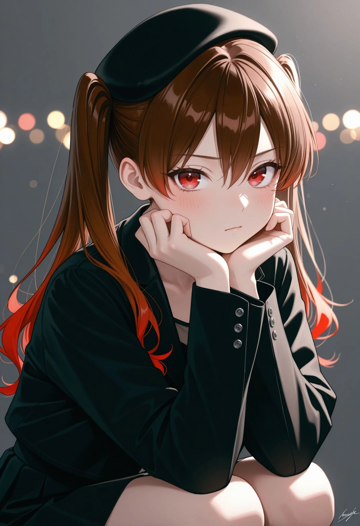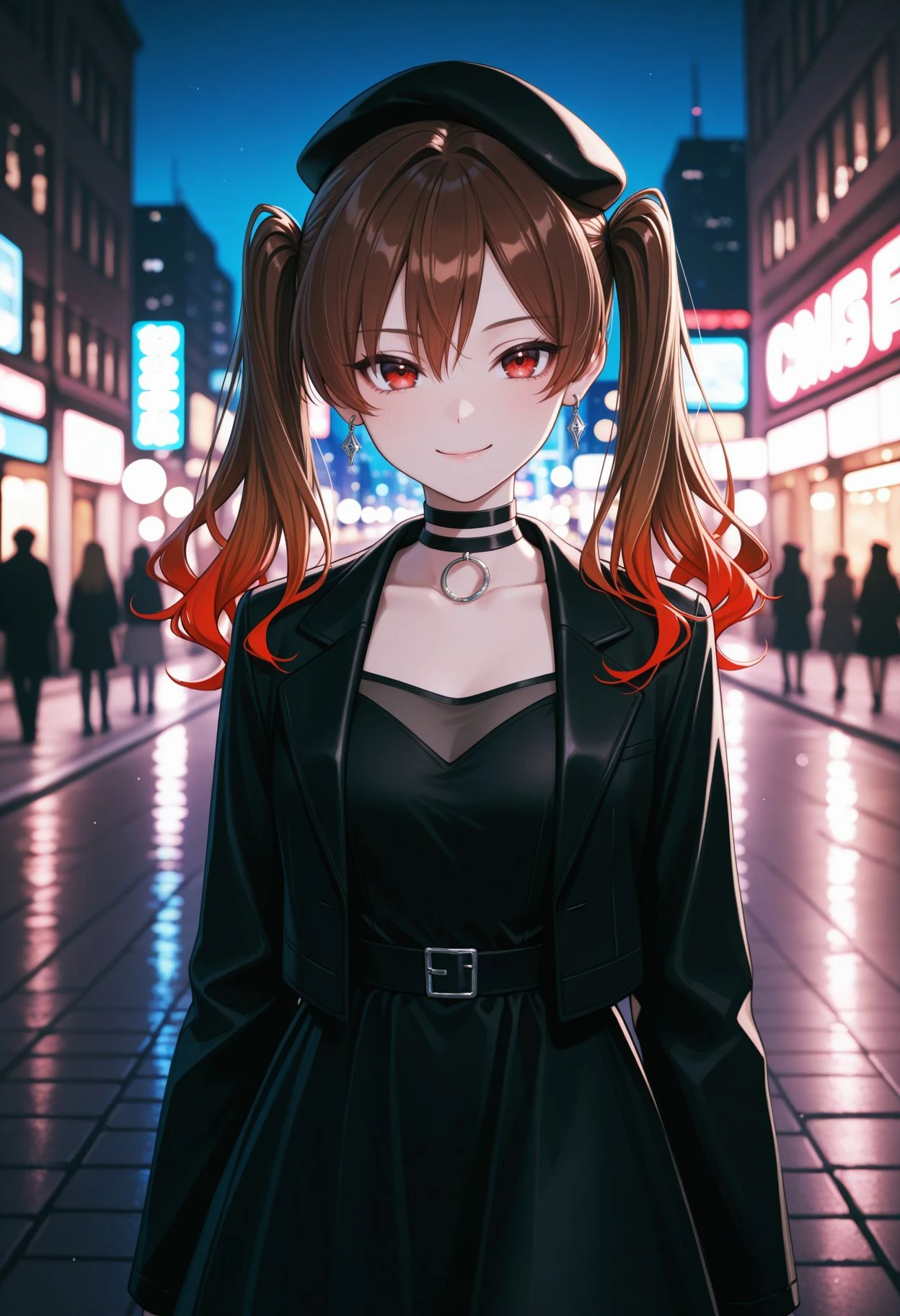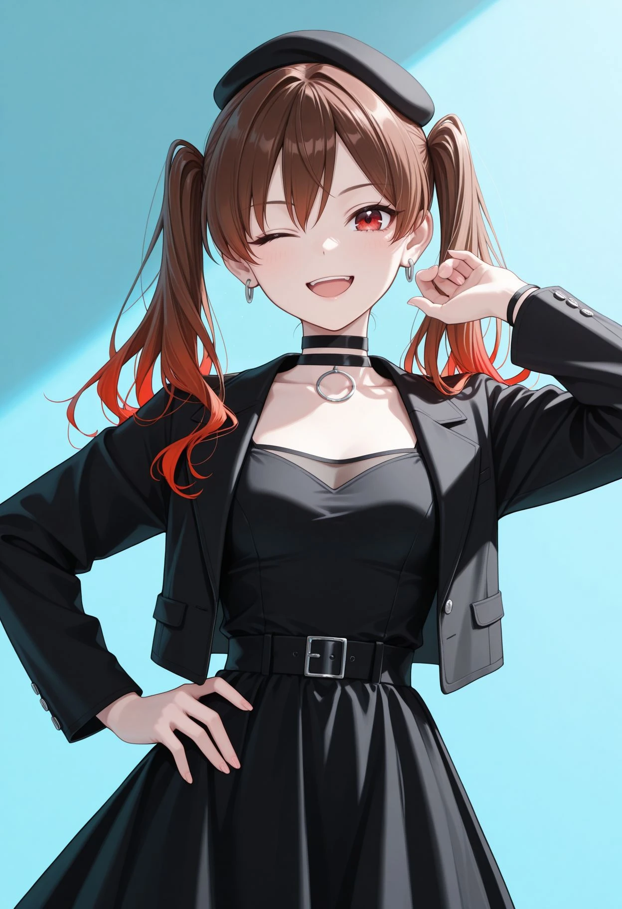 Trigger: 1girl, twintails, multicolored hair, gradient hair, brown hair, red hair, black headwear, beret, black choker, long sleeves, black dress, open jacket, jewelry, earrings, black jacket