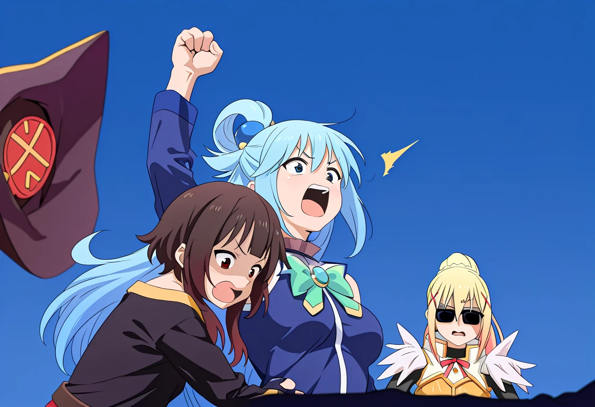 <character 2 + (character 3 - optional), arm up, clenched hand, (anger vein - optional), other description>