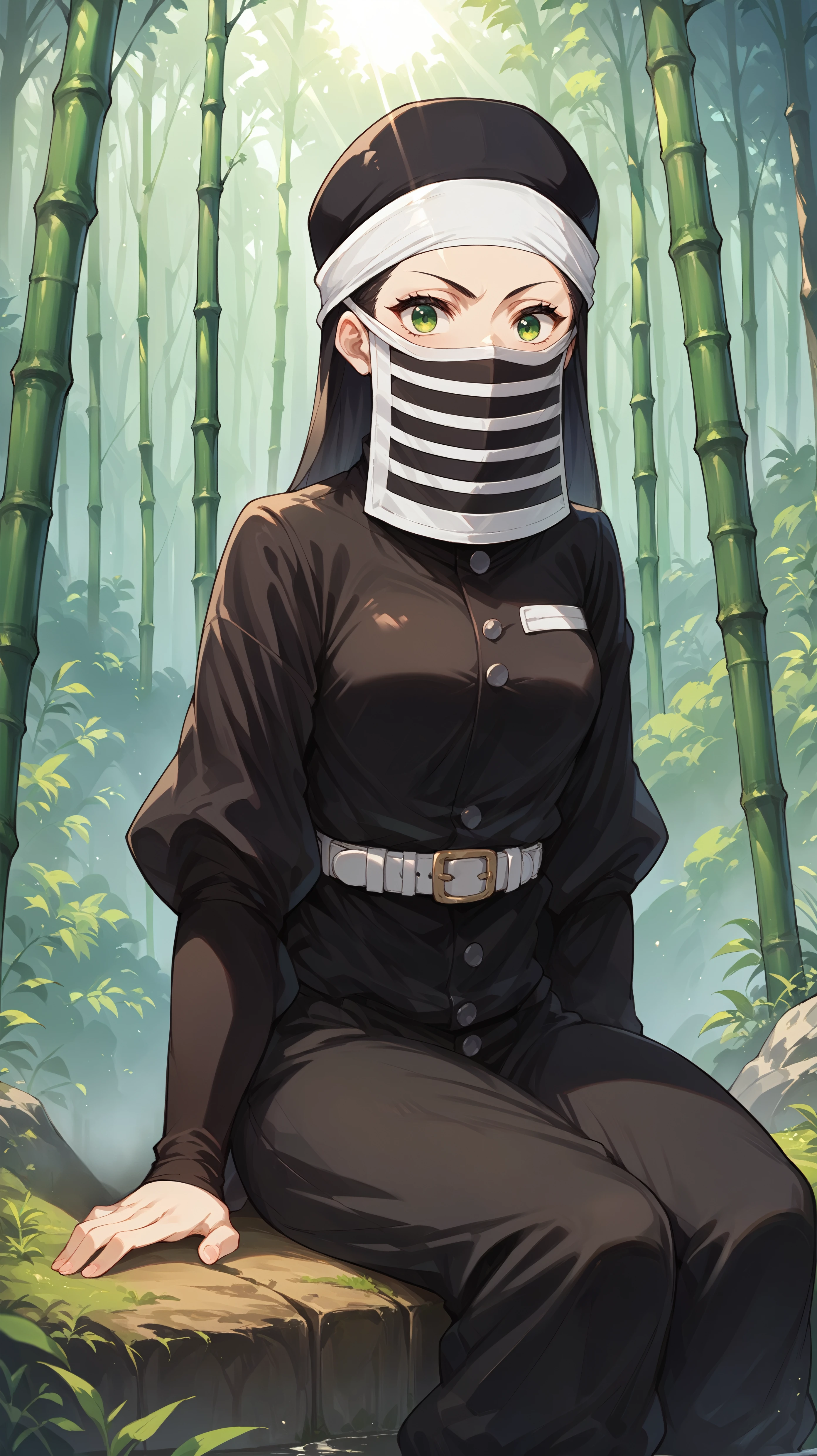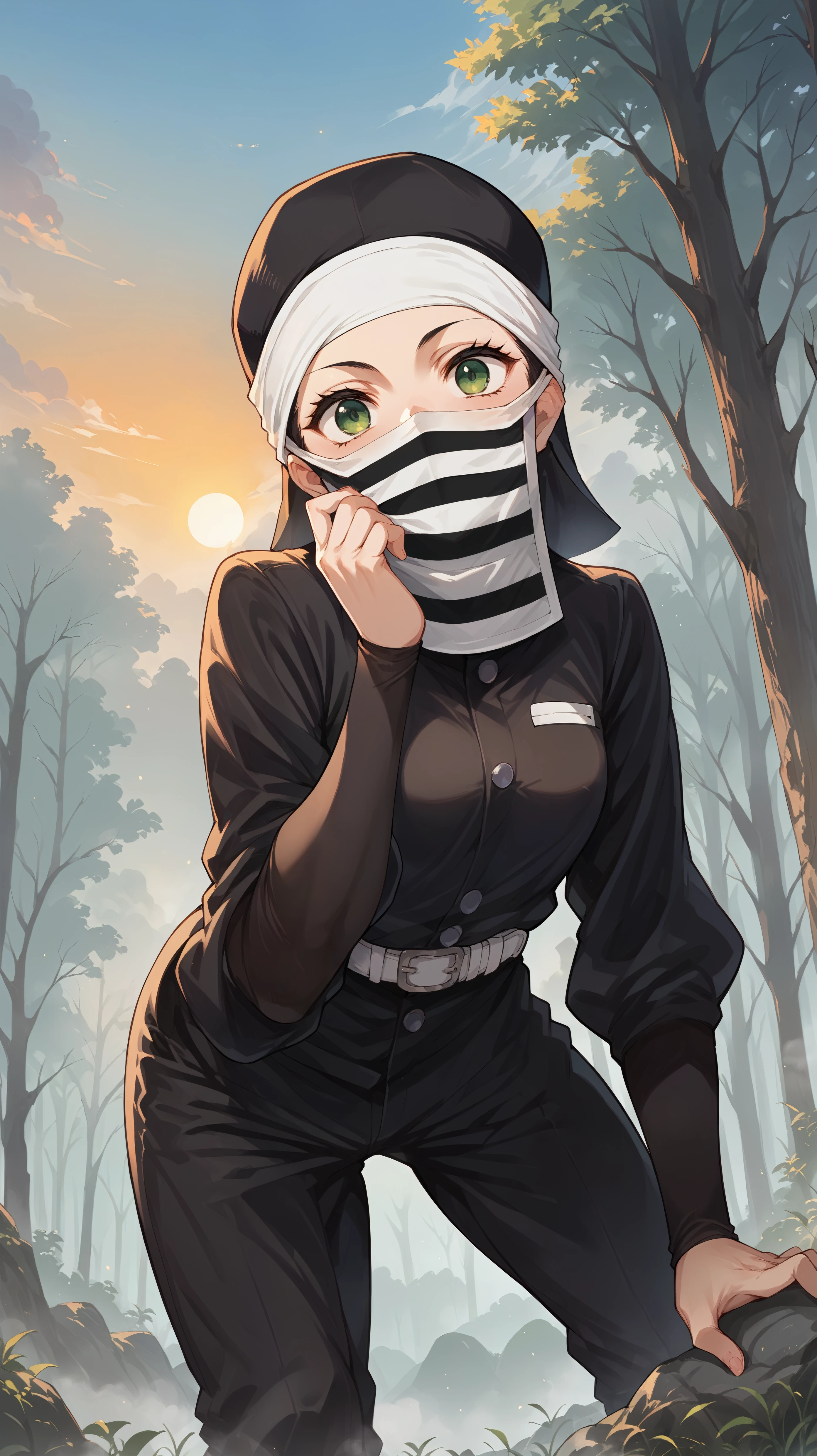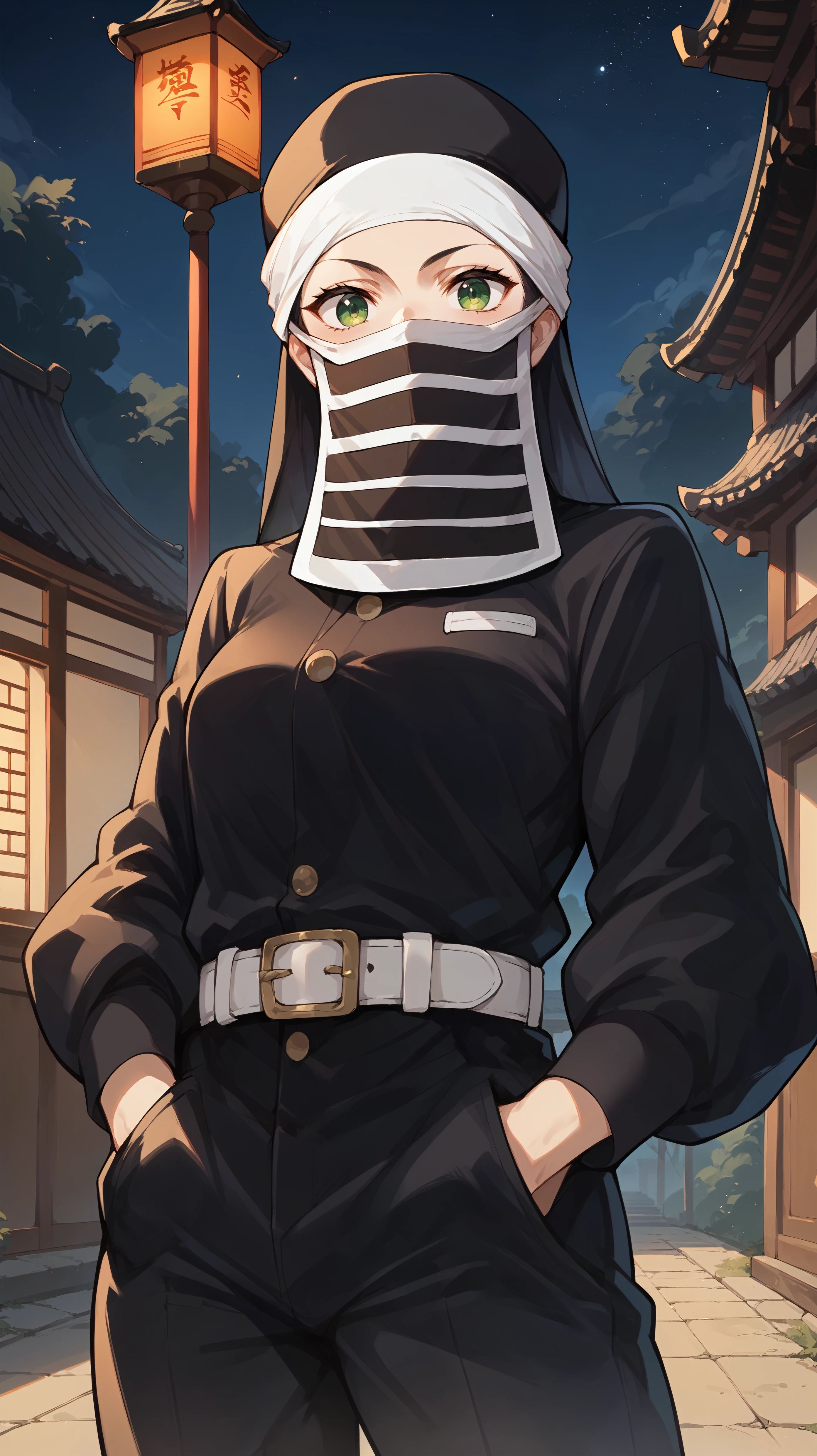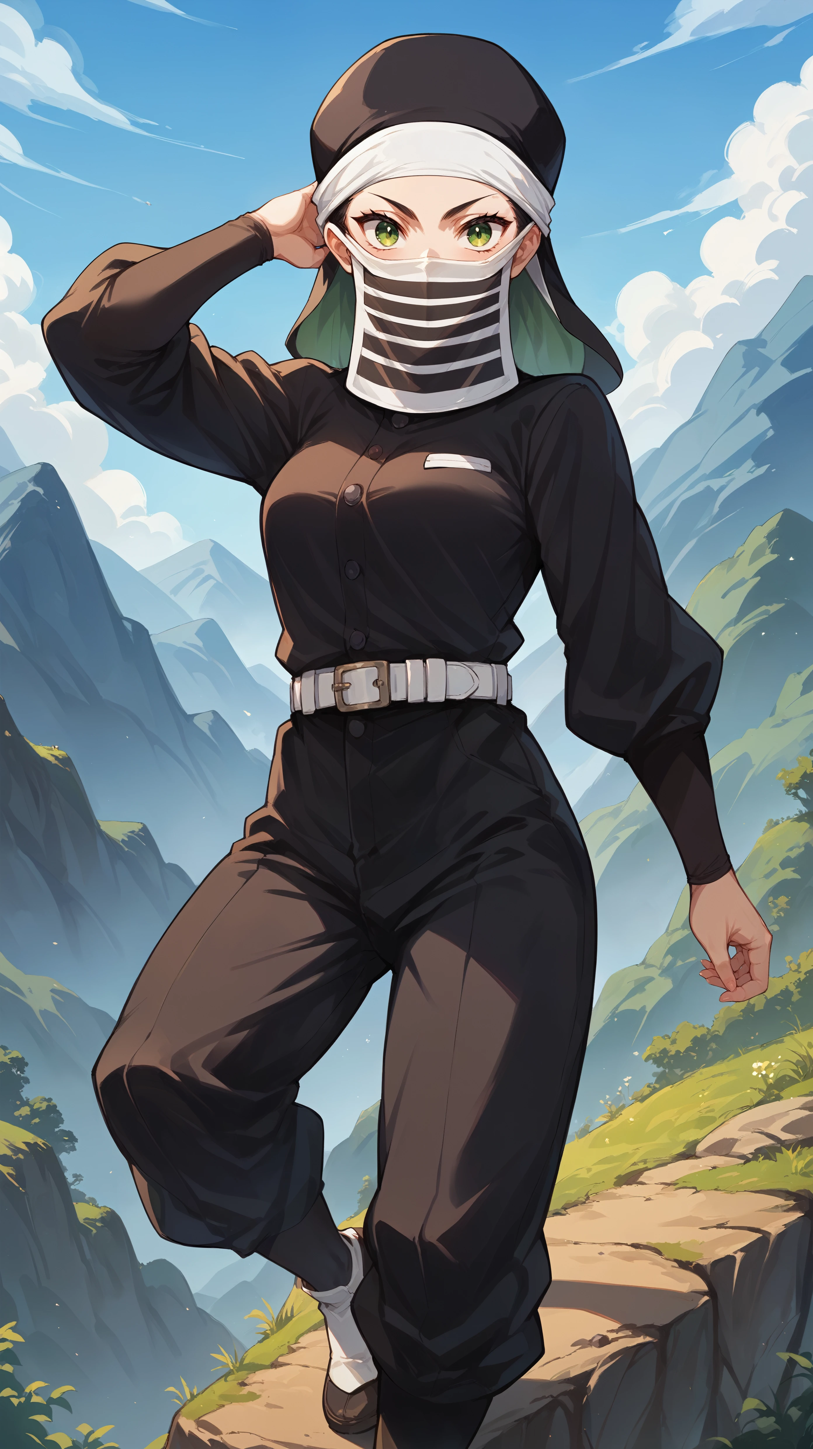 green eyes, black uniform, black headwear, white headband, striped face mask, long sleeves, white belt, black pantsDescription