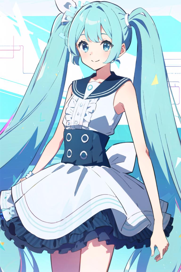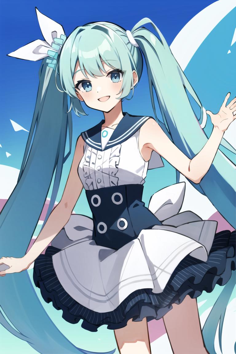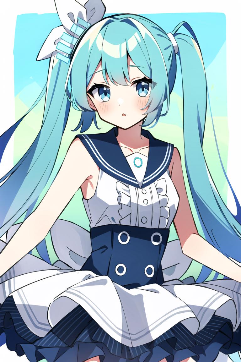 recommended prompt: buruaka miku, bangs, twintails, aqua hair, hair ornament, very long hair, blue eyes, frills, sleeveless, sailor collar, sleeveless shirt, skirt