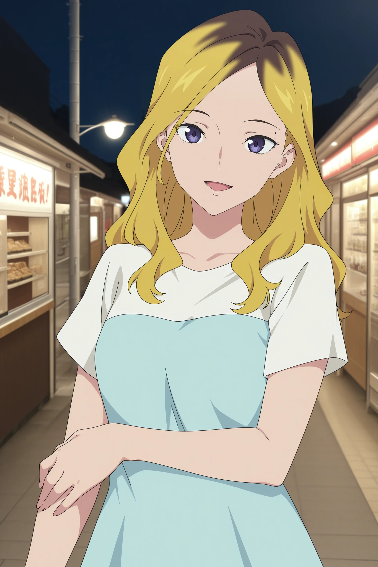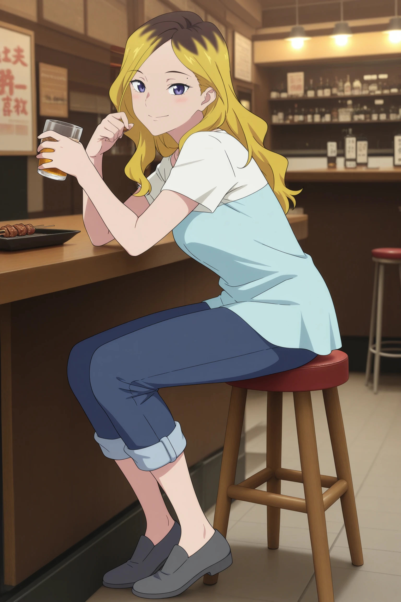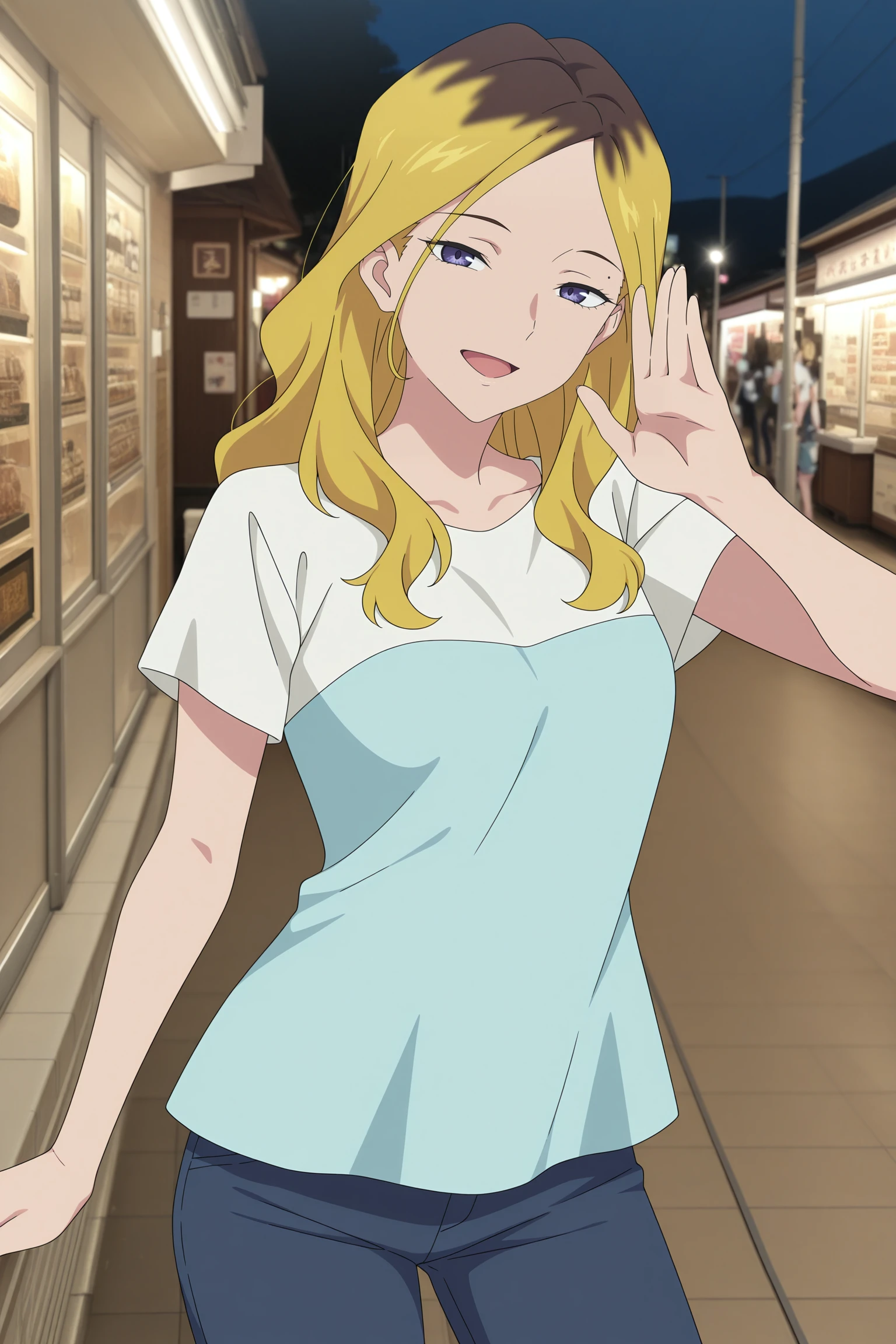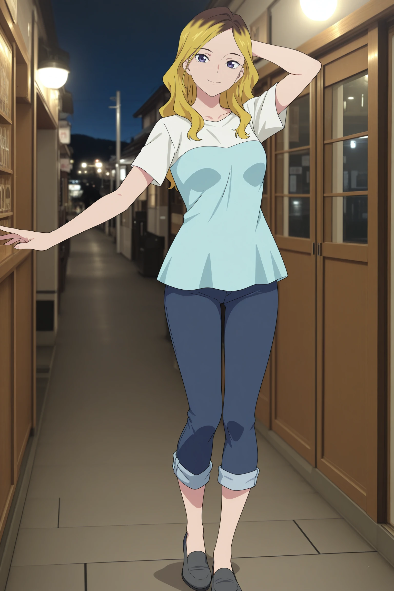 inamoto, long hair, blonde hair, wavy hair, parted bangs, purple eyes, mole above eye, short sleeves, two-tone shirt, white shirt, blue shirt, blue pants, pants rolled up, grey footwear