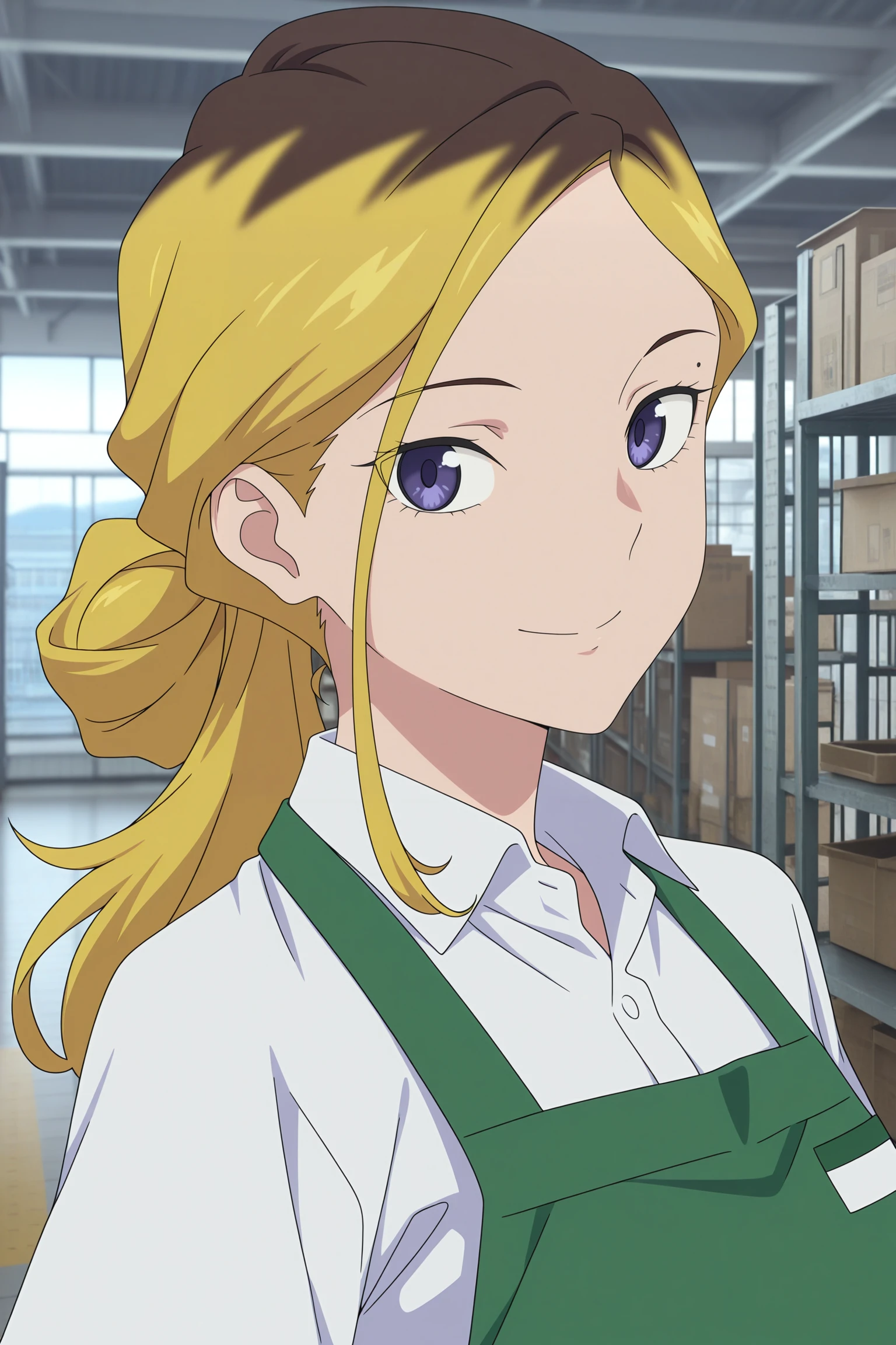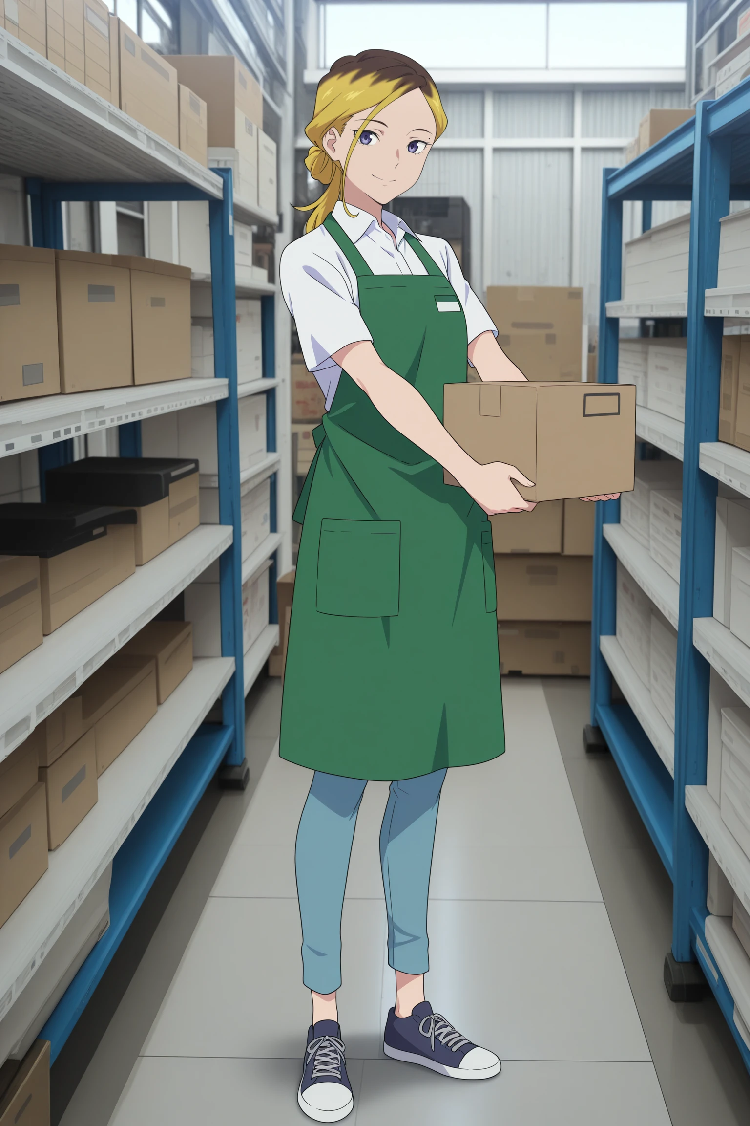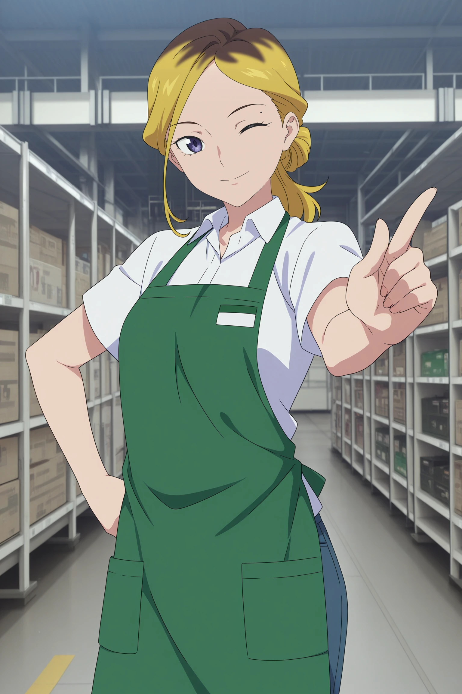inamoto, long hair, blonde hair, wavy hair, ponytail, single hair bun, parted bangs, single sidelock, purple eyes, mole above eye, short sleeves, white shirt, collared shirt, green apron, blue pants, sneakers