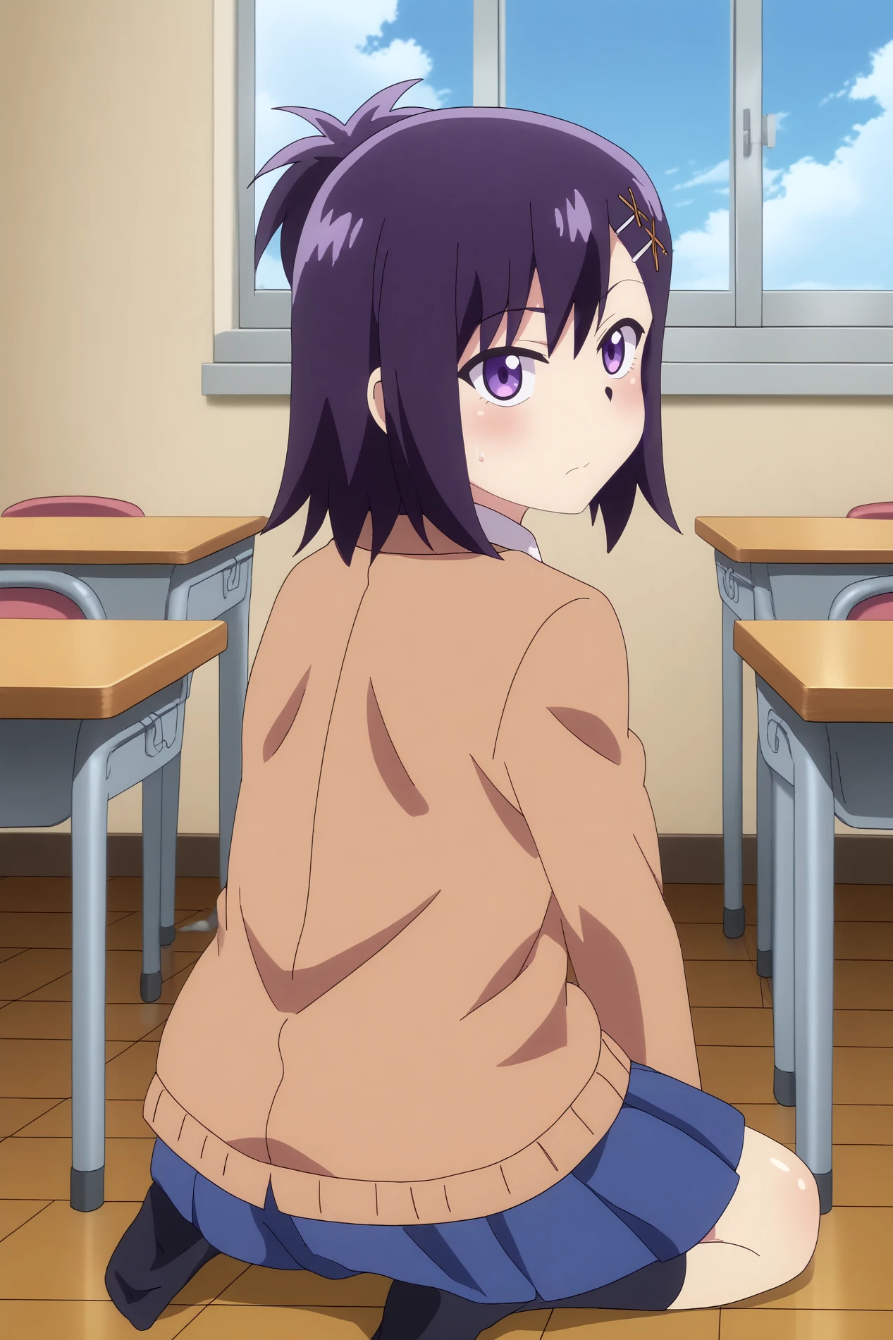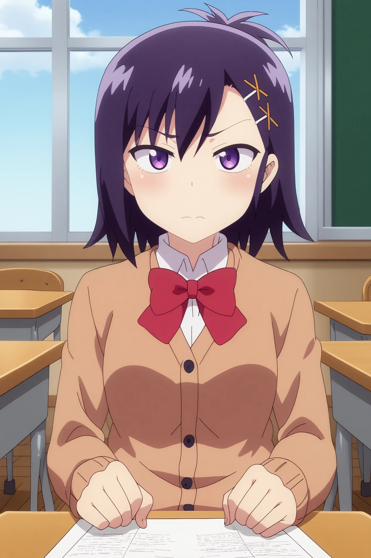 Triggers : vignette april tsukinose,1girl,solo,long hair,looking at viewer,hair ornament,x hair ornament,bow,school uniform,short hair,hairclip,cardigan