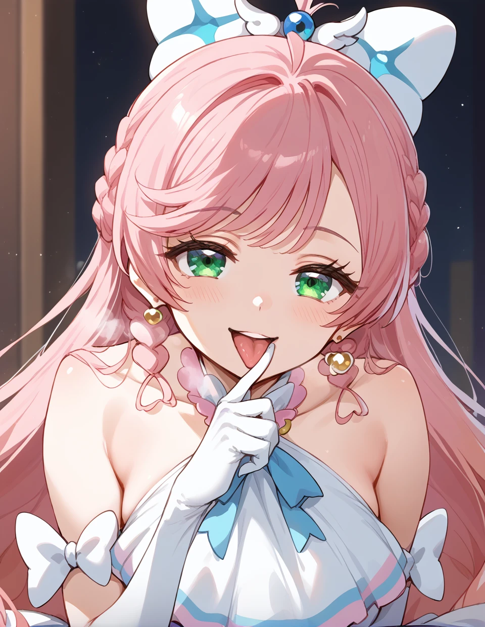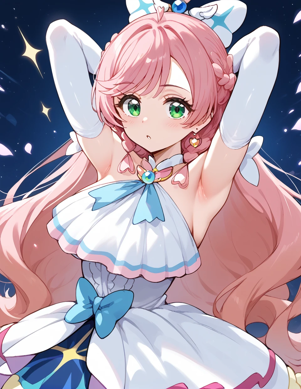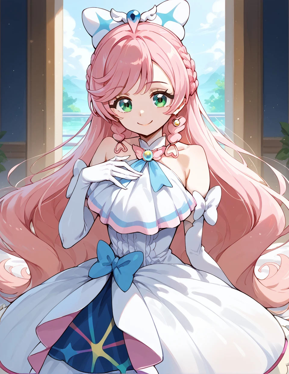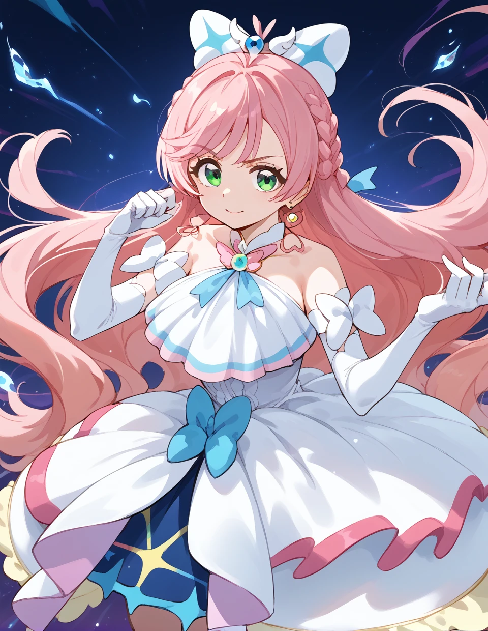 clothes:gloves,white gloves,magical girl,jewelry,hair ornament,earrings,dress,bare shoulders