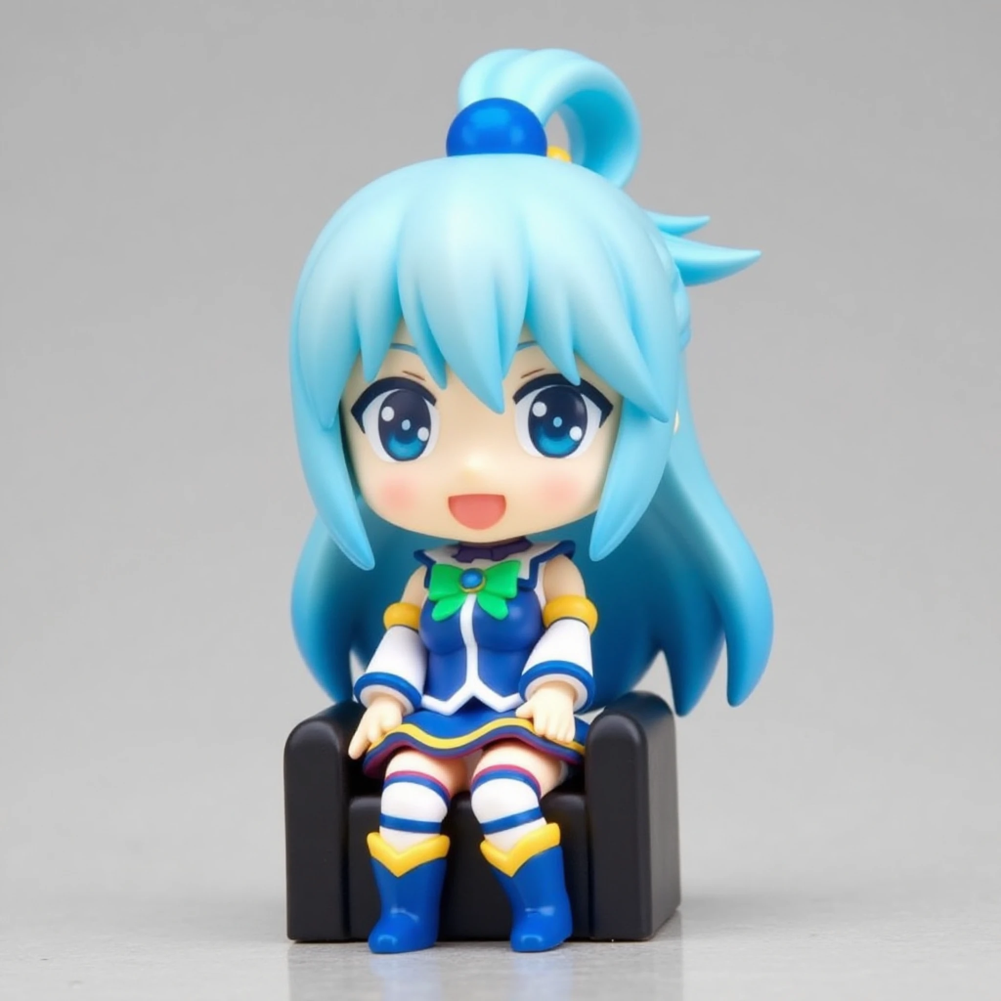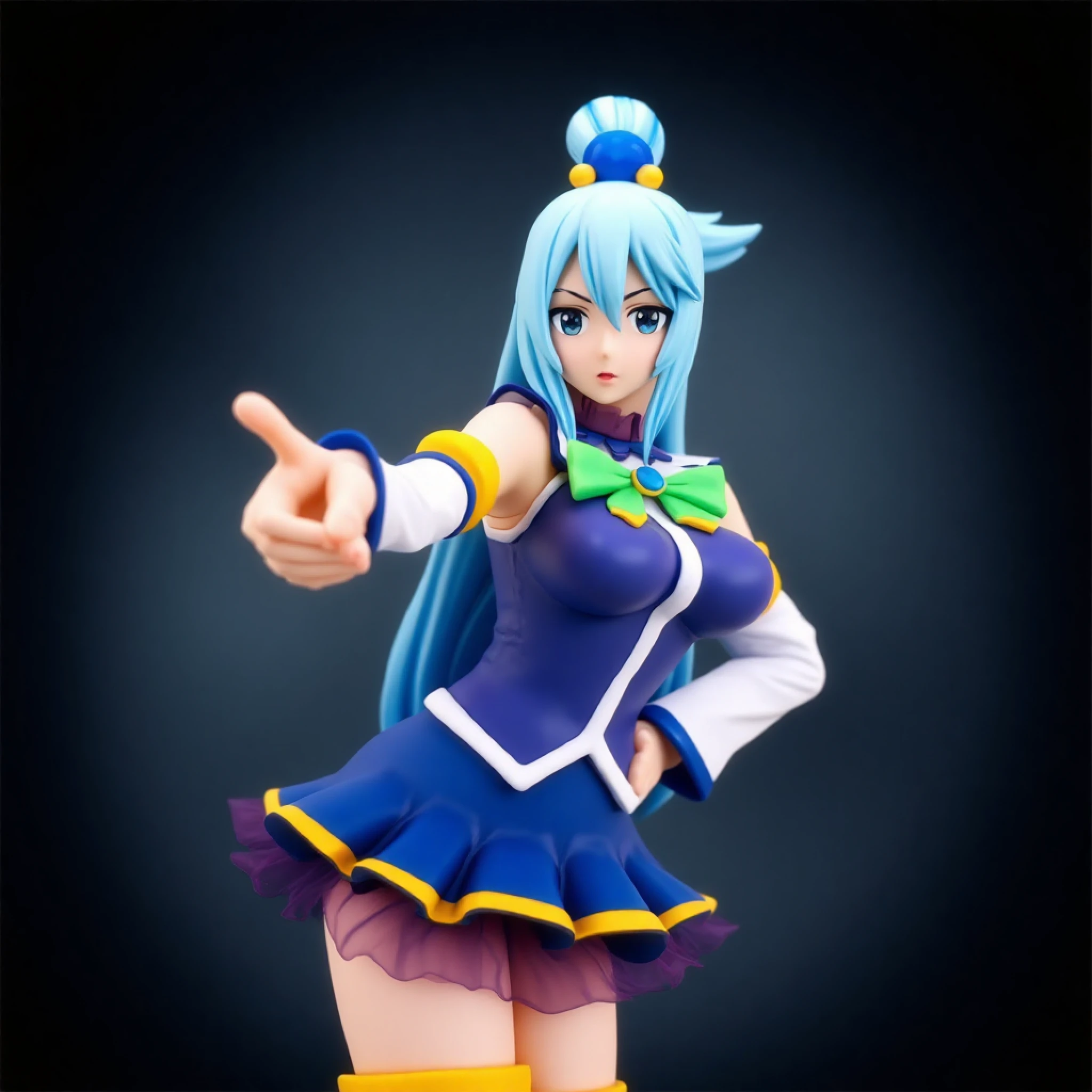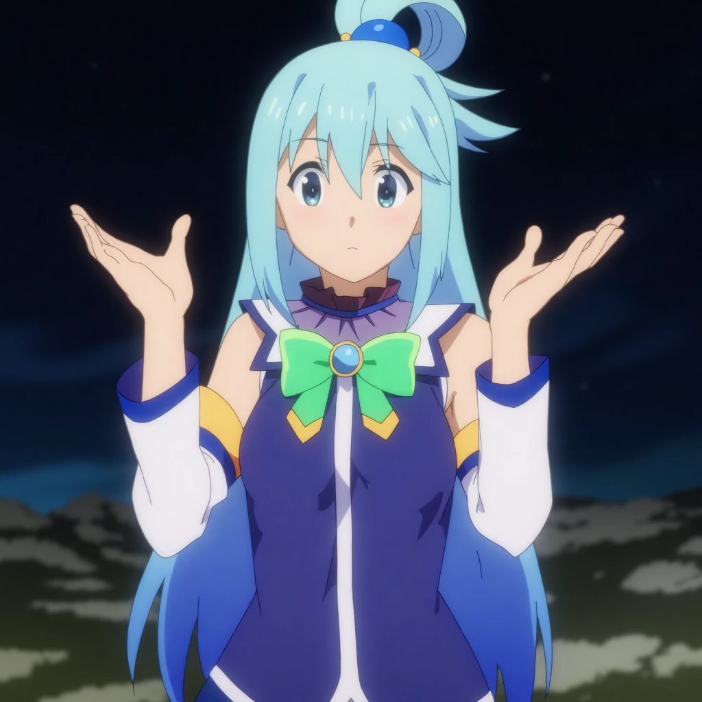 1girl,solo,long hair,breasts,blue eyes,skirt,hair ornament,thighhighs,bow,bare shoulders,medium breasts,very long hair,blue hair,detached sleeves,sky,white thighhighs,blue skirt,blue shirt,staff,hair rings,aqua (konosuba)Description