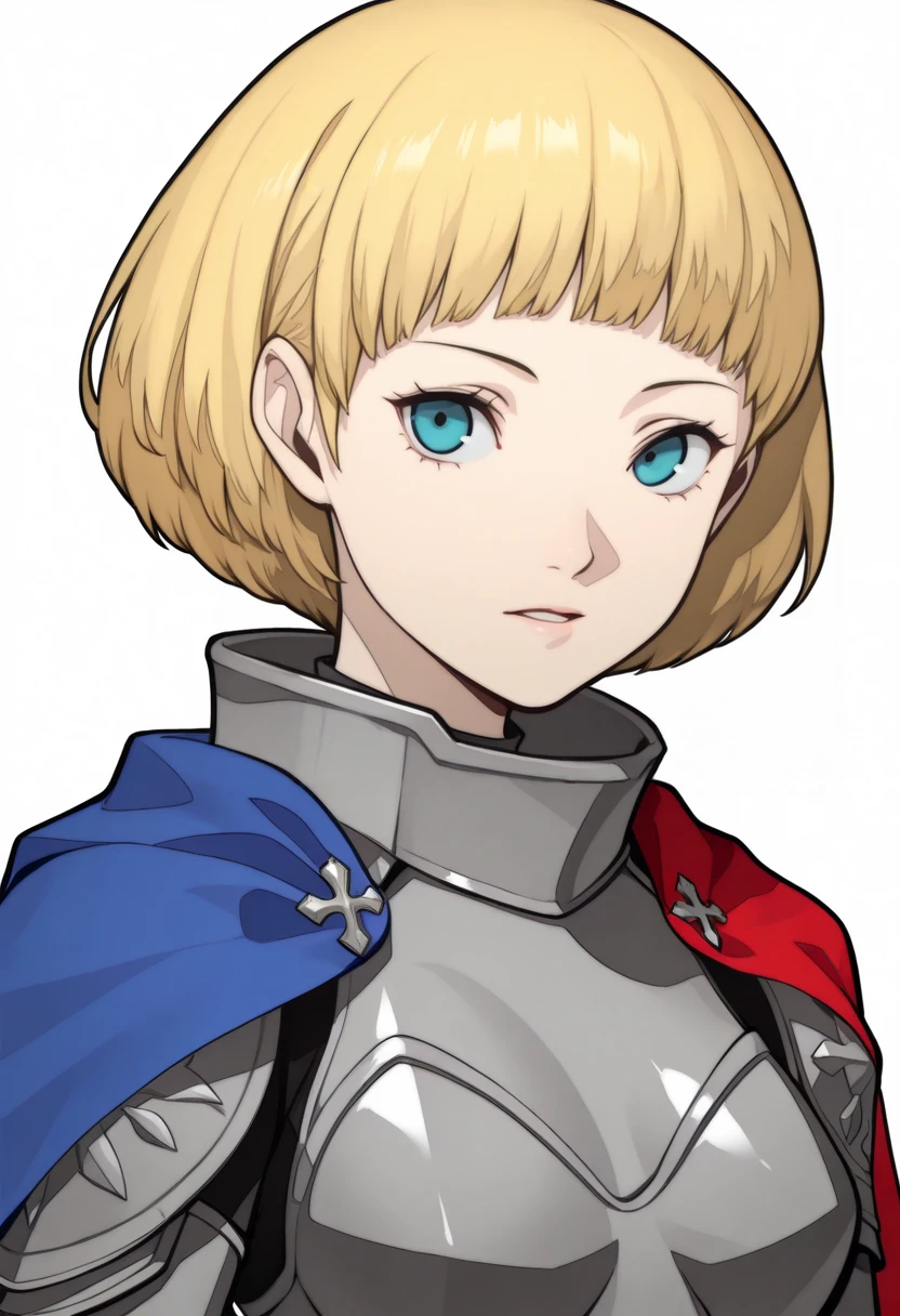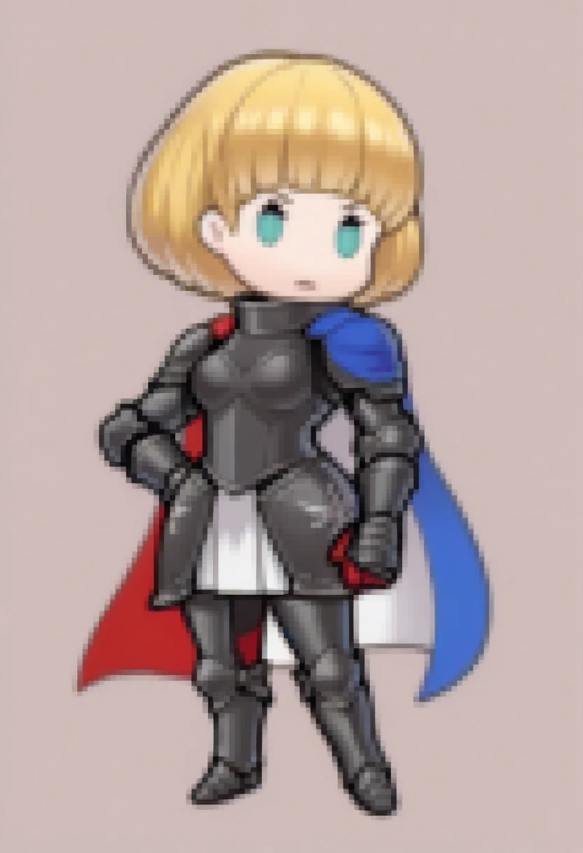 j34nnesmt, blonde hair, short hair, blue eyes, armor, knight, greaves, red cape, blue cape