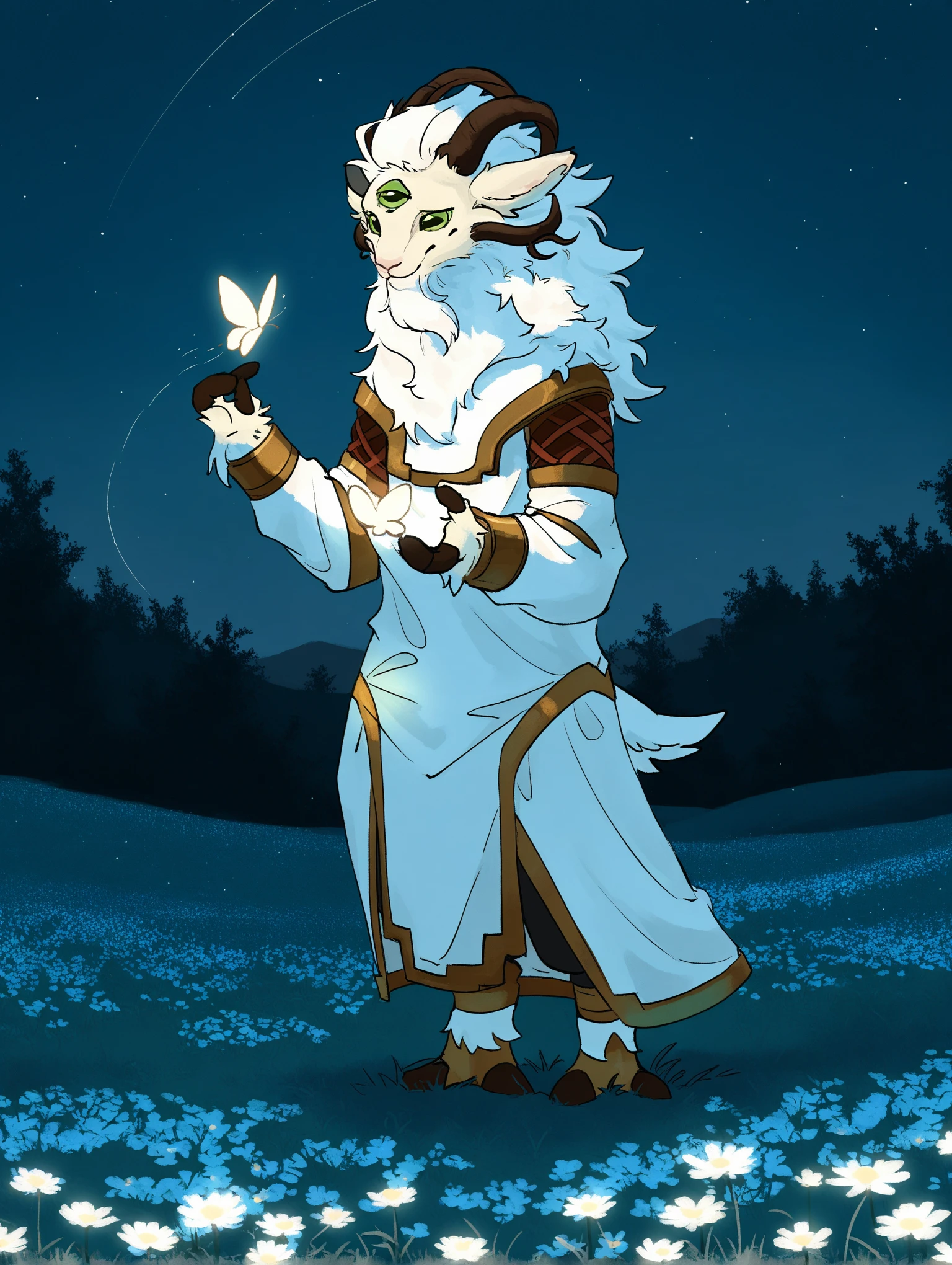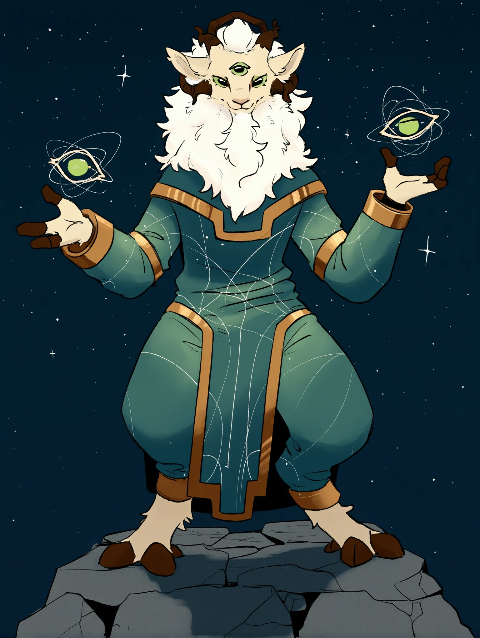 nomai, 3 eyes, beige skin, white mane, white beard, goat ears, 3 fingers, 3 toes