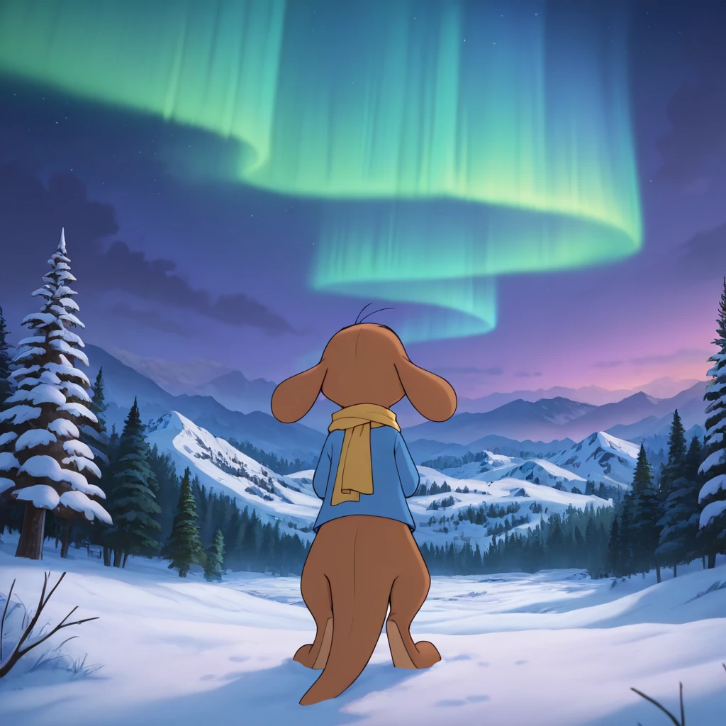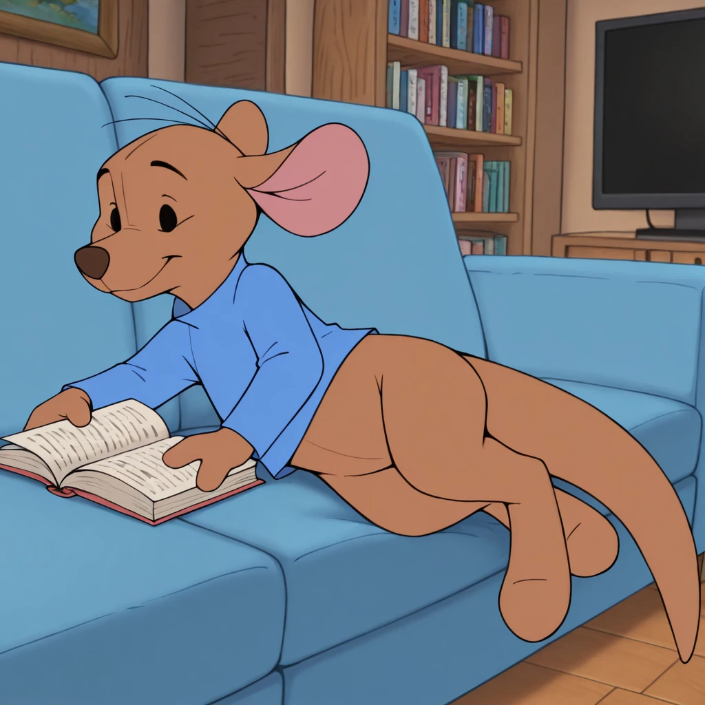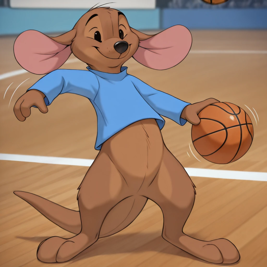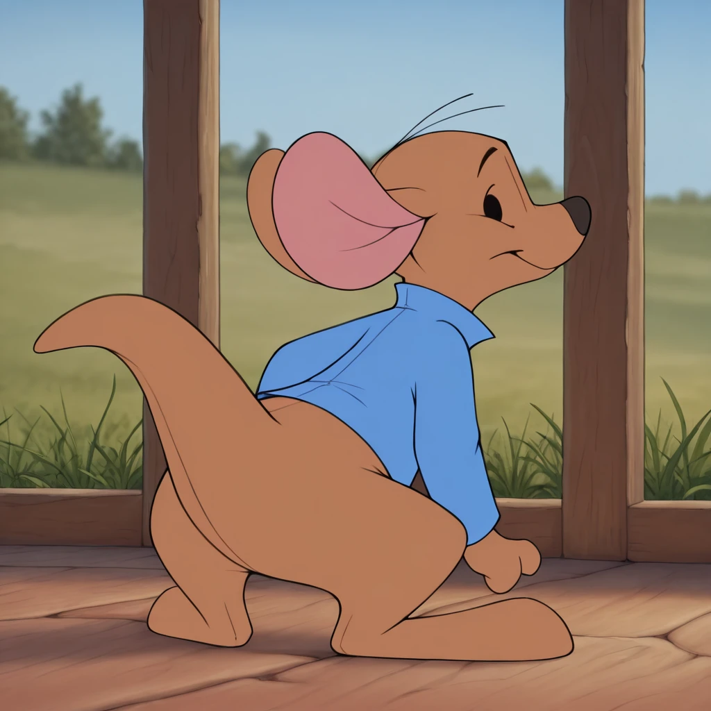 Suggested tags: brown fur, blue shirt, semi-anthro, young, full body, beady eyes,