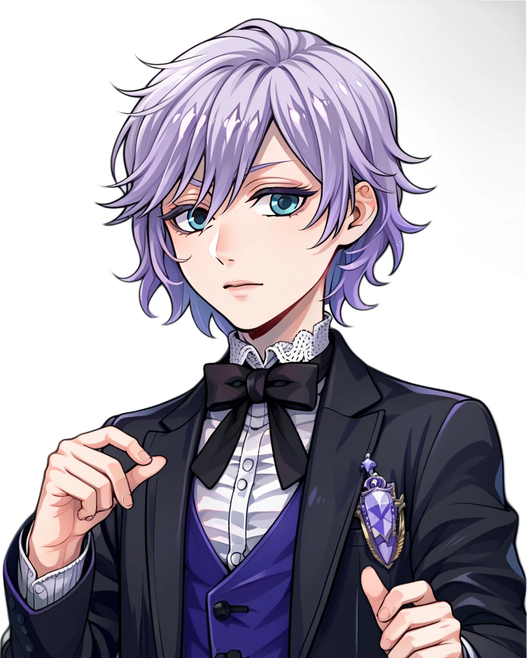 School uniform(制服) : school uniform, bowtie, necktie, black pants, (purple vest), jacket,