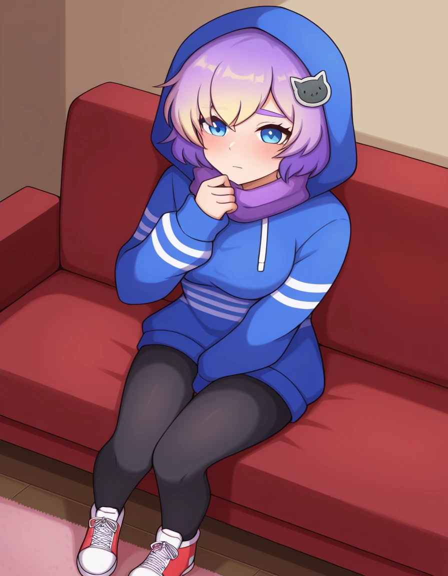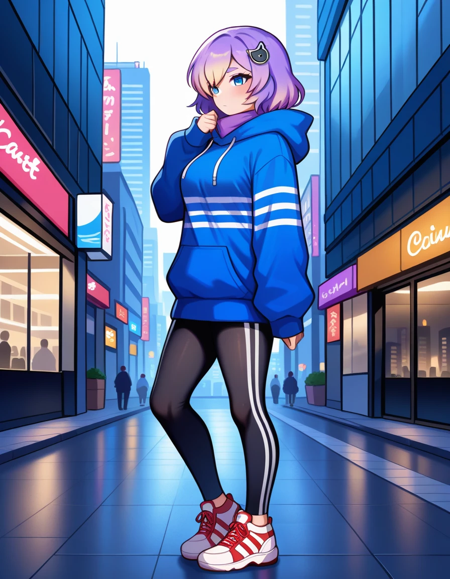 sneakers, red white sneakers, blue eyes, hoodie, blue hoodie, purple hair, two white stripes on belly, two white stripes on each arm, black legwear, leggings, purple scarf, hairpin, cat hairpin, sastri, purple eyebrows, multicolored hair, standing, medium breasts, hoodie up