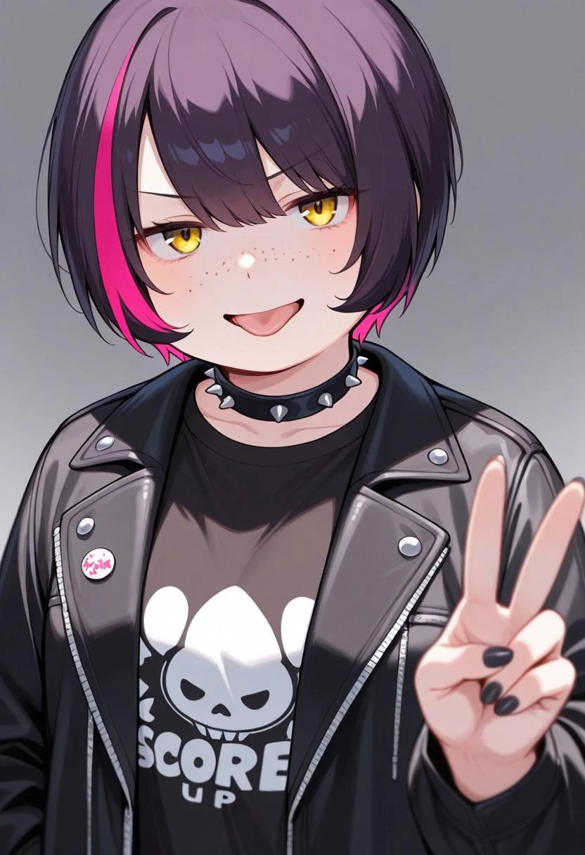 Hagtakky, yellow eyes, light eyes, dark purple hair, dark hair, pink hair, pink streaks, two-tone hair, colored inner hair, short hair, swept bangs, bangs, hair between eyes, freckles, plump,