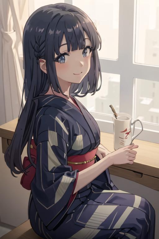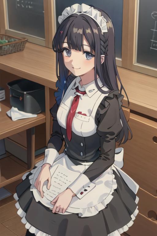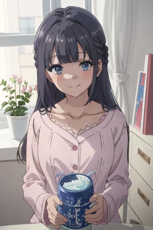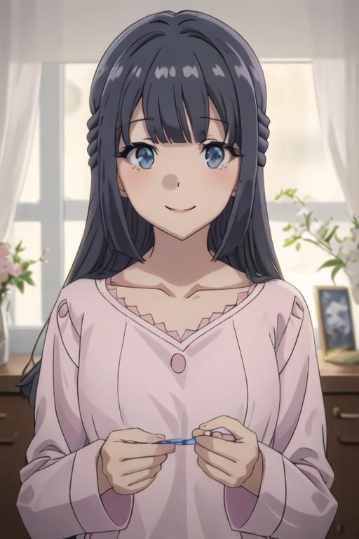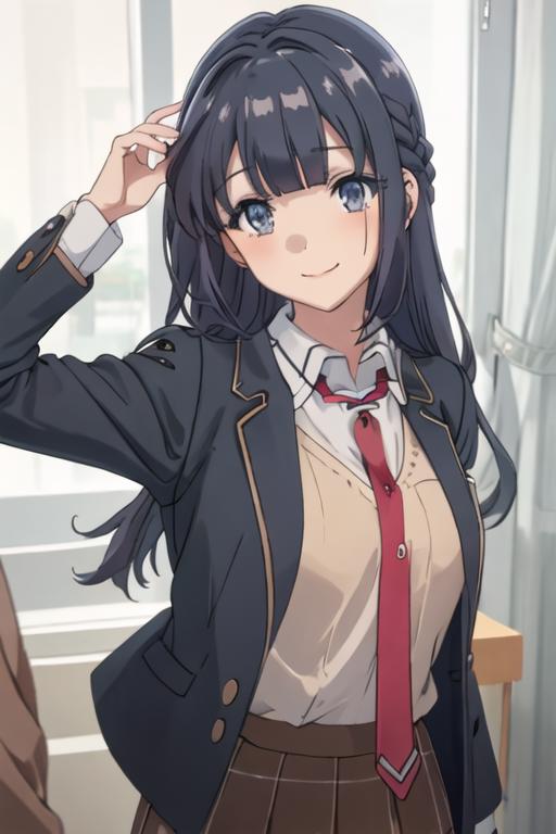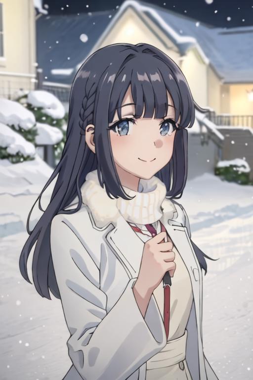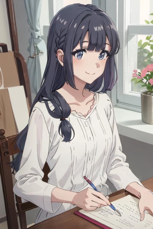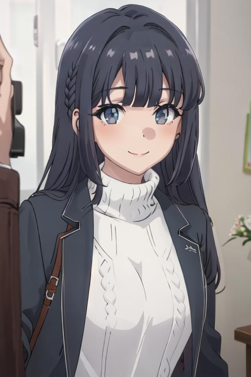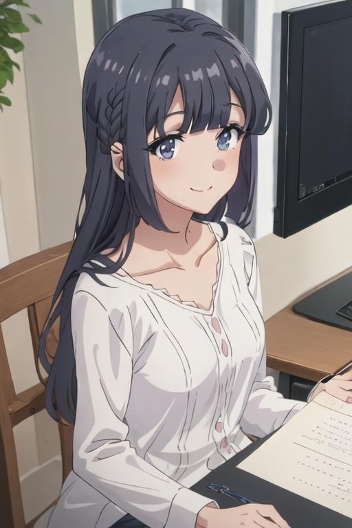 The trigger word is makinohara_shoko_seishunbutayarou, and the recommended tags are best quality, masterpiece, highres, solo, {makinohara_shoko_seishunbutayarou:1.15}, long_hair, bangs, black_hair, braid, blue_eyes, smile, closed_mouth, blue_hair.