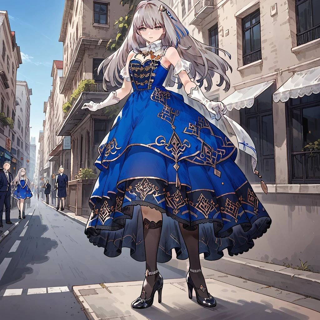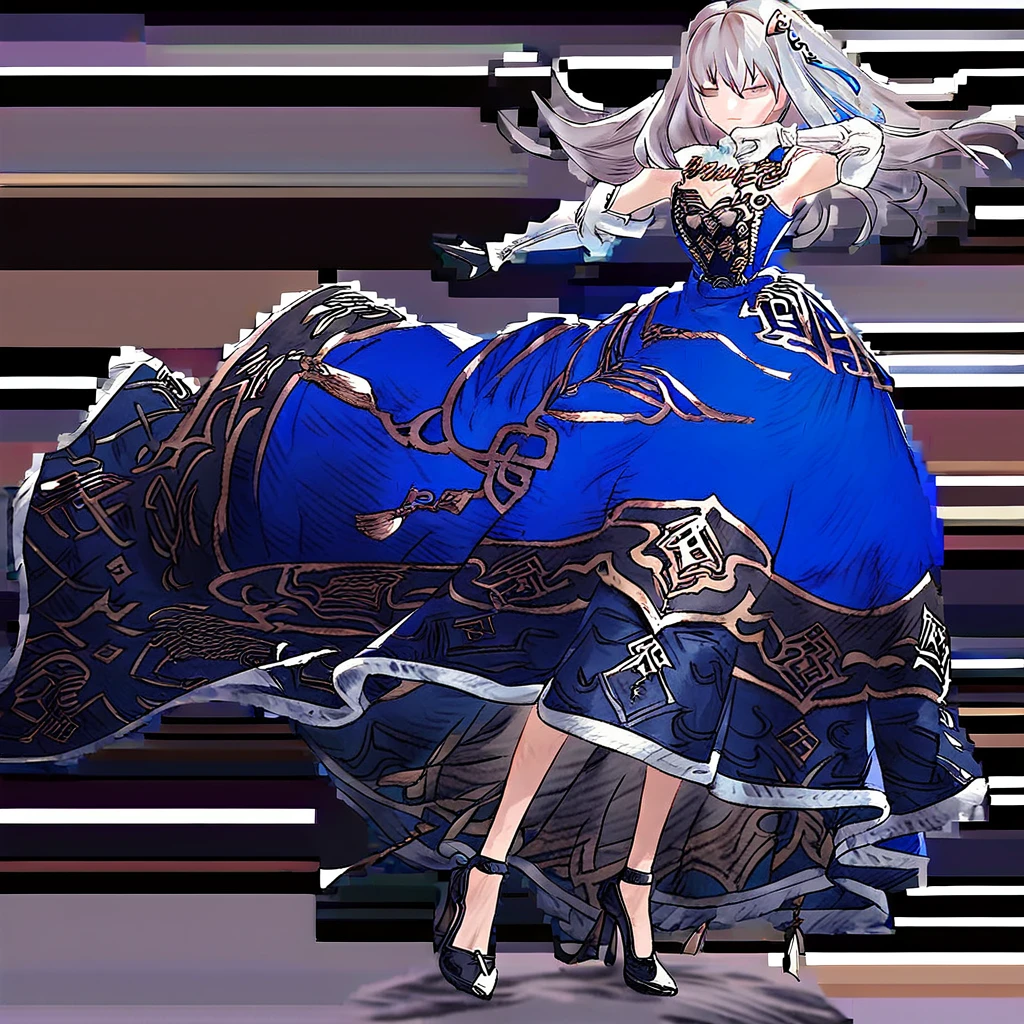 regaliaglaciela,1girl,solo,dress,high heels,black footwear,long hair,blue dress,regalia_gloves,grey hair,hair ornament,kneehighs