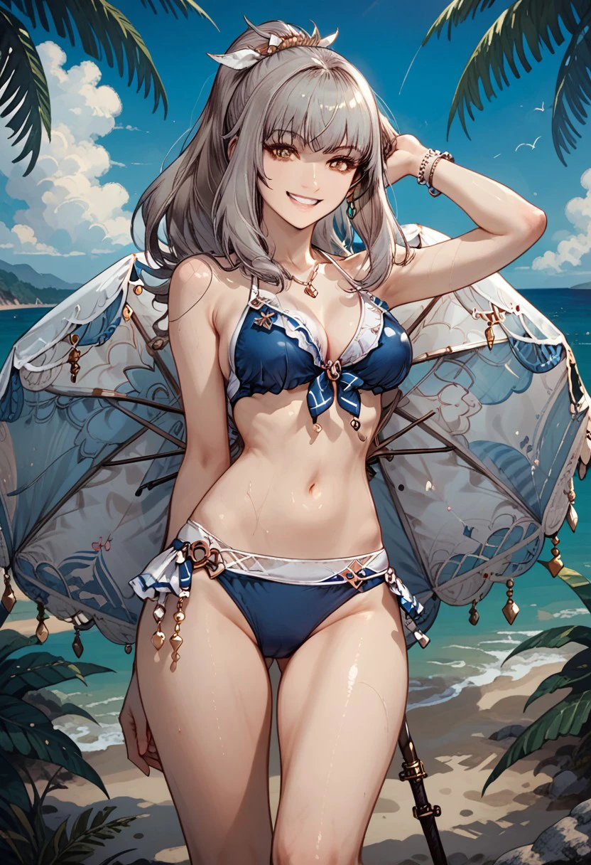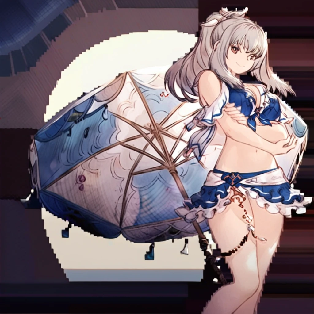 Summerglaciela, 1girl, swimsuit, solo, holding, umbrella, bikini, smile, long hair, ponytail, breasts, brown eyes, navel, grey hair