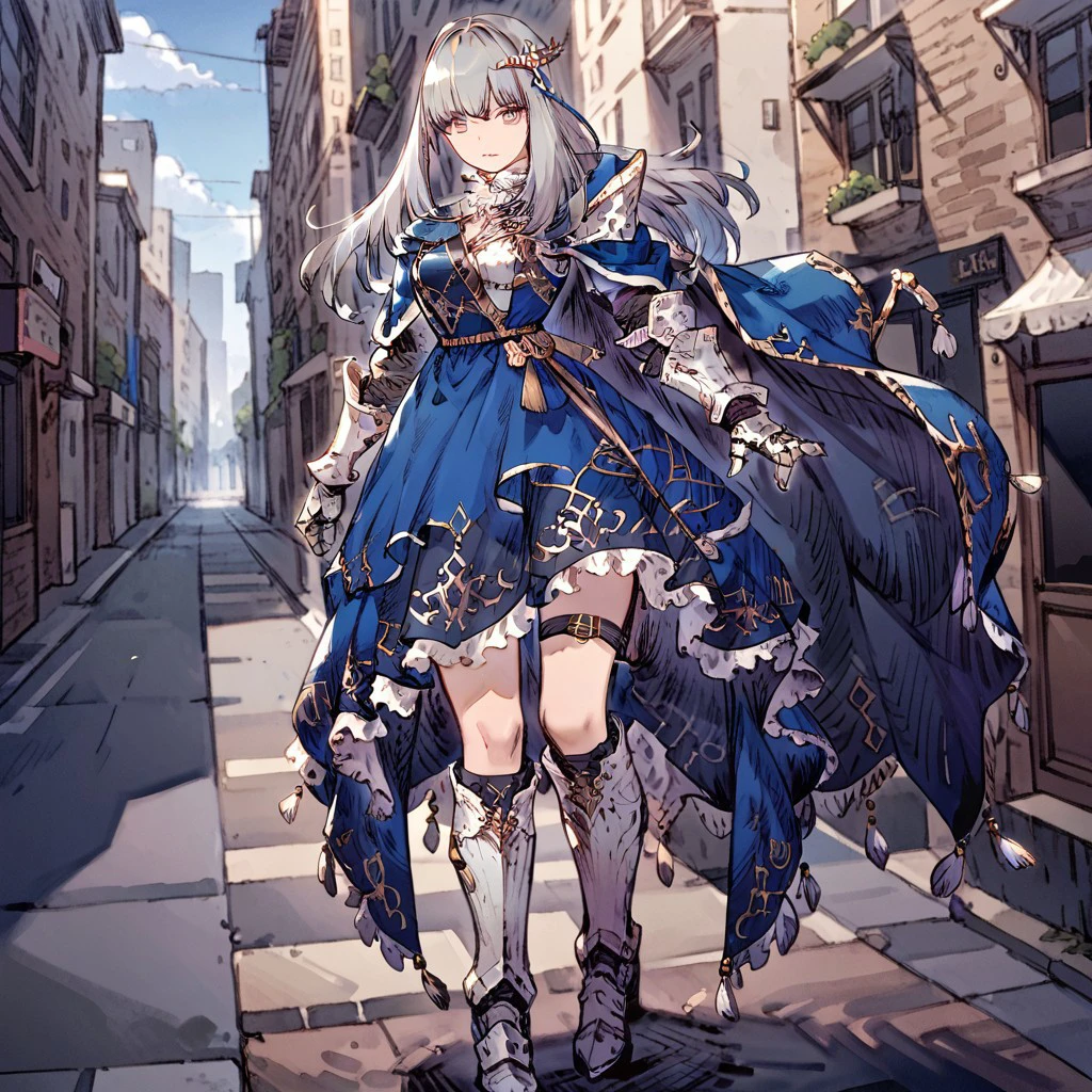 reformglaciela,1girl, solo,hair ornament,boots,long hair,gauntlets, looking at viewer,portrait, gauntlets, blue and white armored dress,50% white 50%blue dress, nose, breastplate,cape,knee strap,