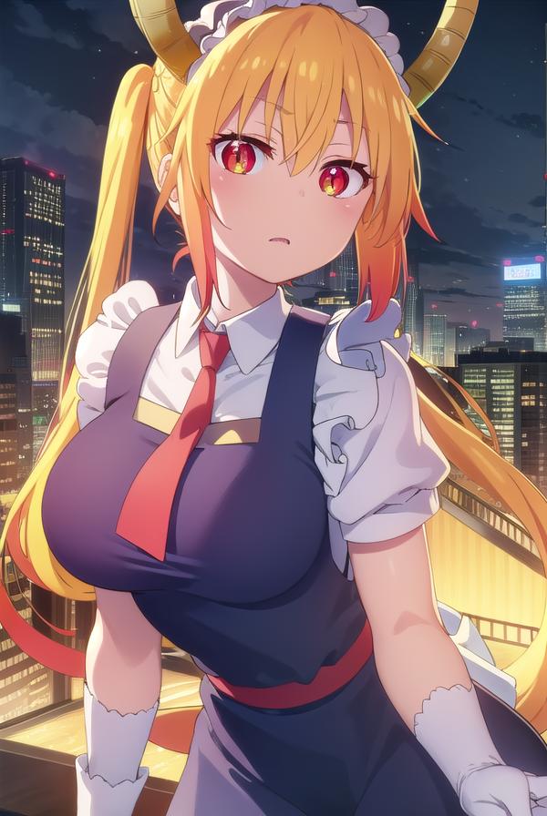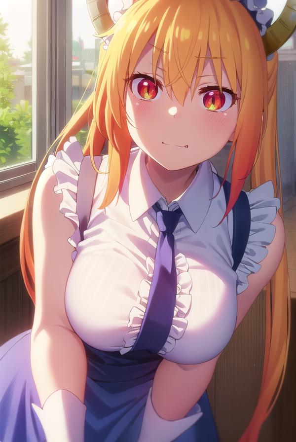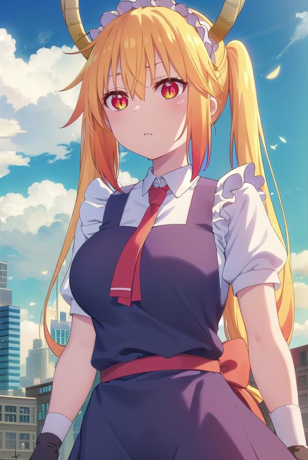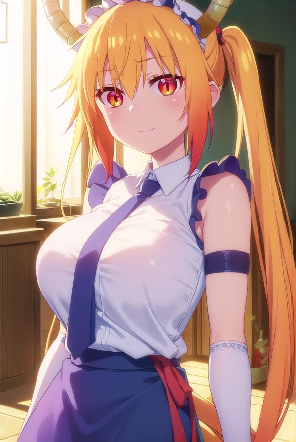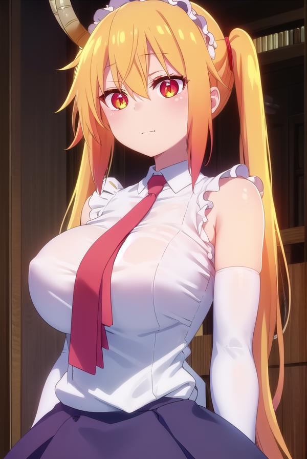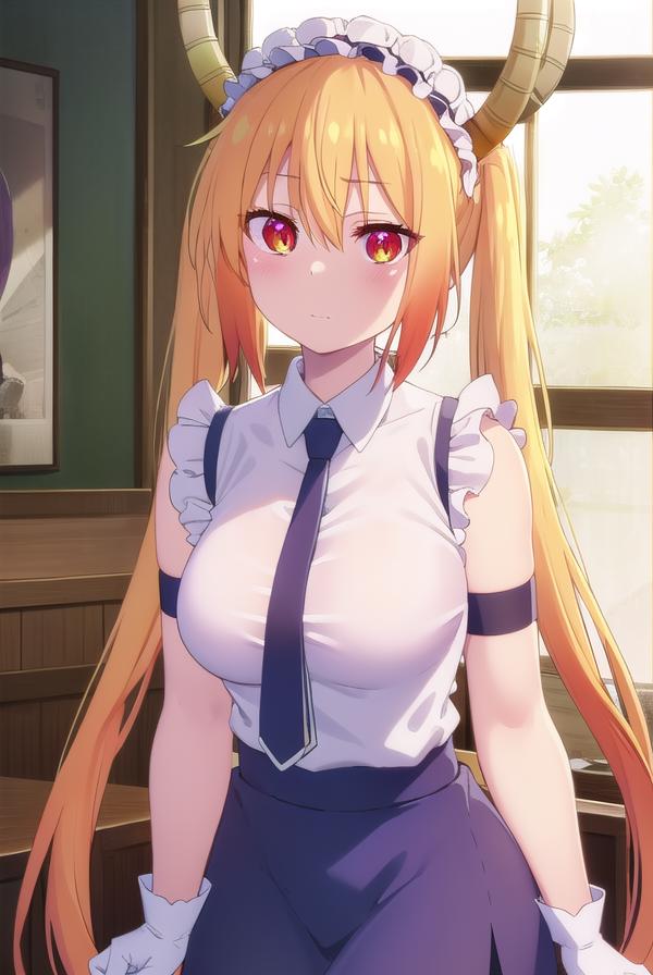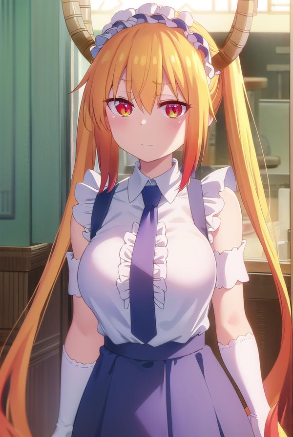 tohru, tohru \(maidragon\), long hair, bangs, blonde hair, hair between eyes, twintails, very long hair, multicolored hair, horns, fang, gradient hair, dragon horns, (red eyes:1.3), (slit pupils:1.5),