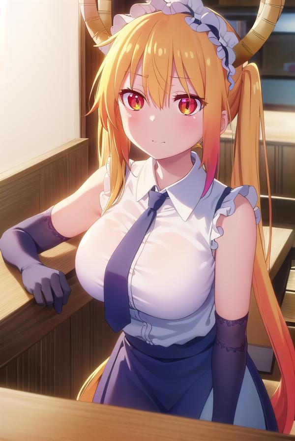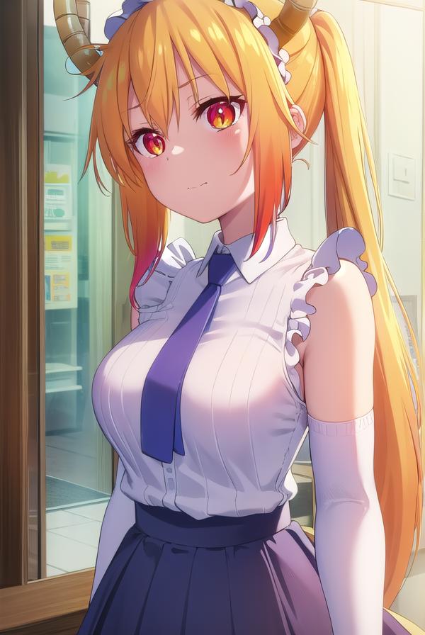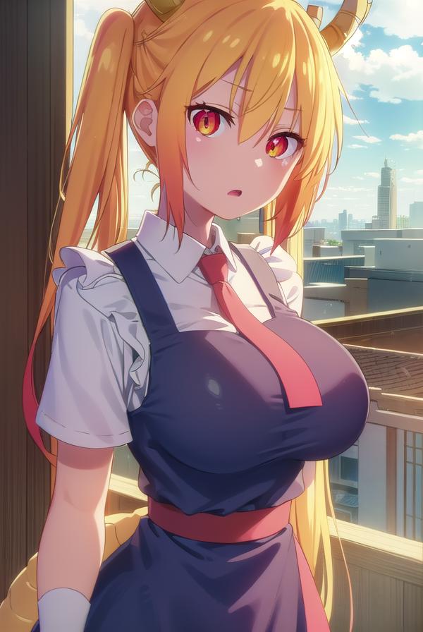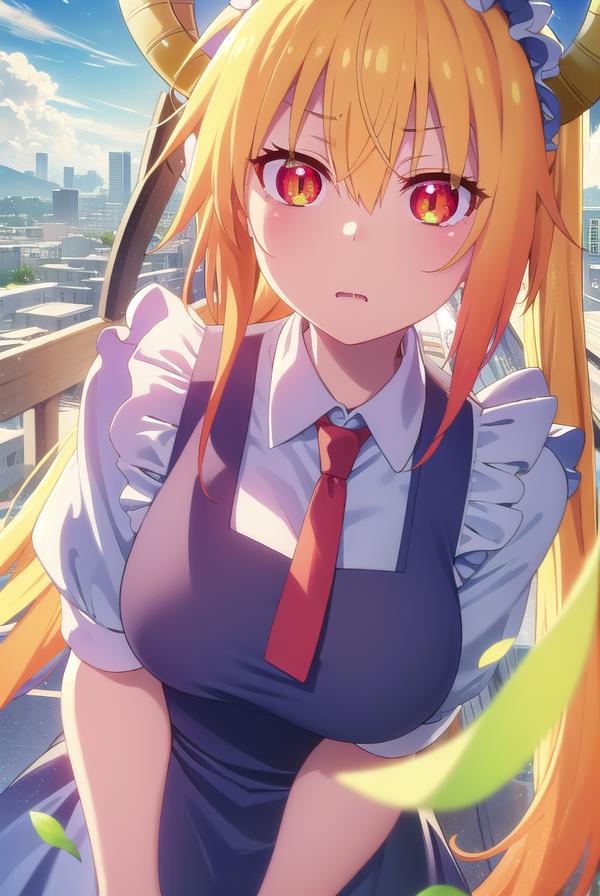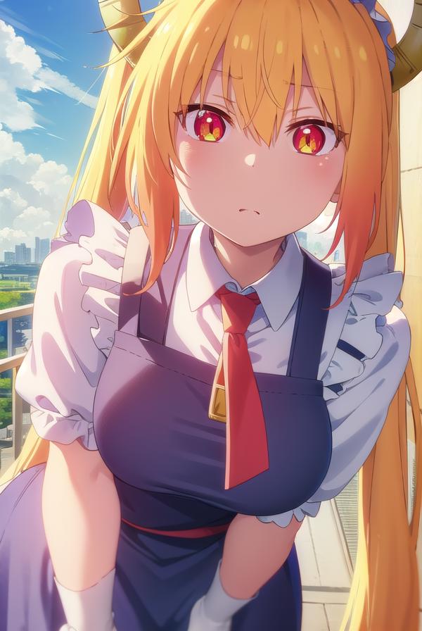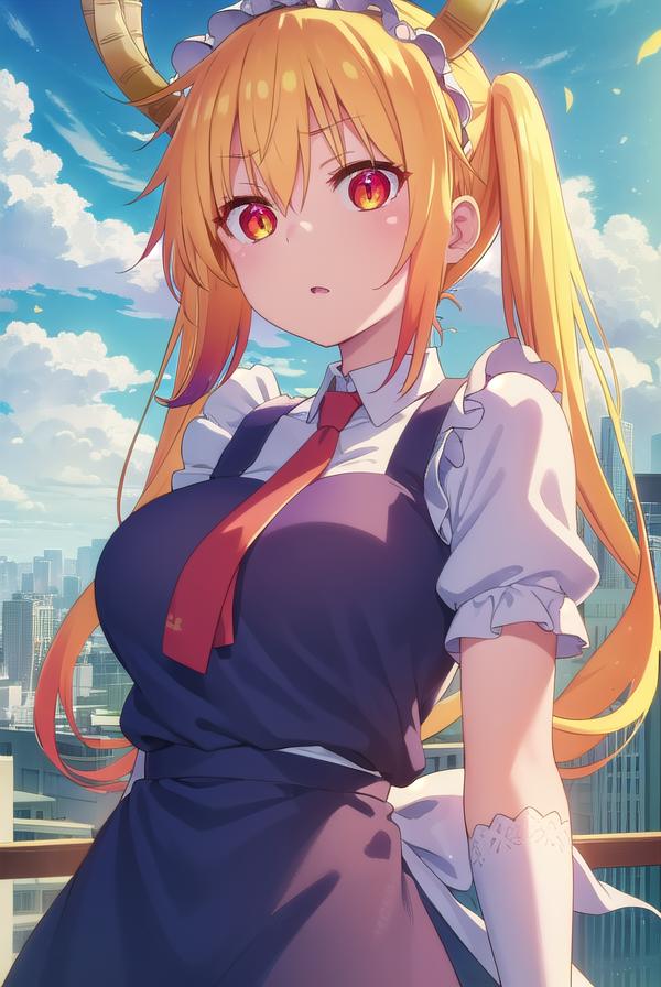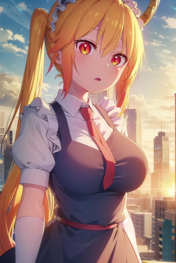 tohru, tohru \(maidragon\), long hair, bangs, blonde hair, hair between eyes, twintails, very long hair, multicolored hair, horns, fang, gradient hair, dragon horns, (red eyes:1.3), (slit pupils:1.5),