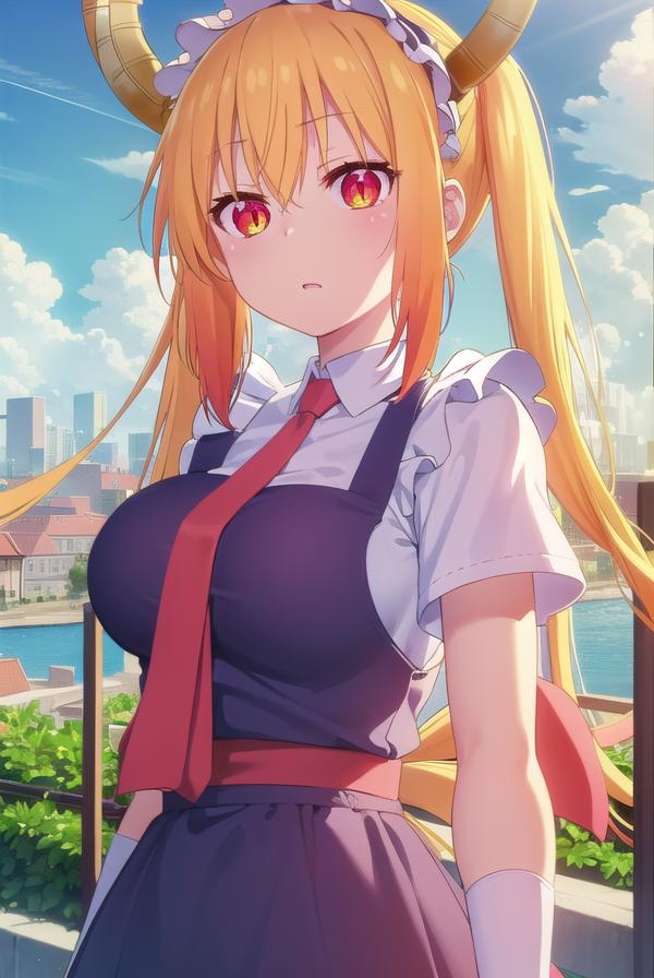 tohru, blonde hair, dragon girl, dragon tail, fang, hair between eyes, horns, large tail, long hair, scales, tail, twintails, (yellow eyes:1.5), slit pupils