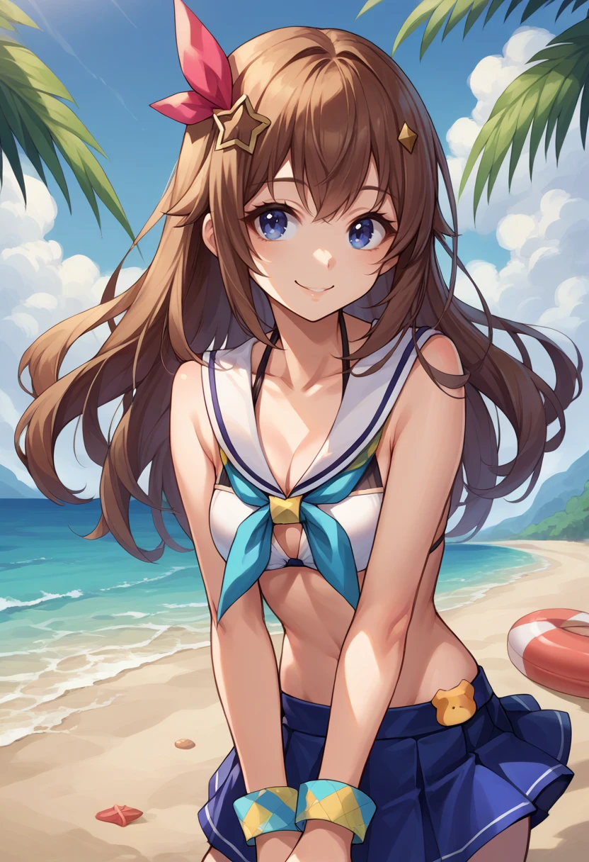 SoraSummer, long hair, star hair ornament, hair ribbon, blue eyes, sailor bikini, blue skirt, bikini skirt, wristbandCasual outfit: