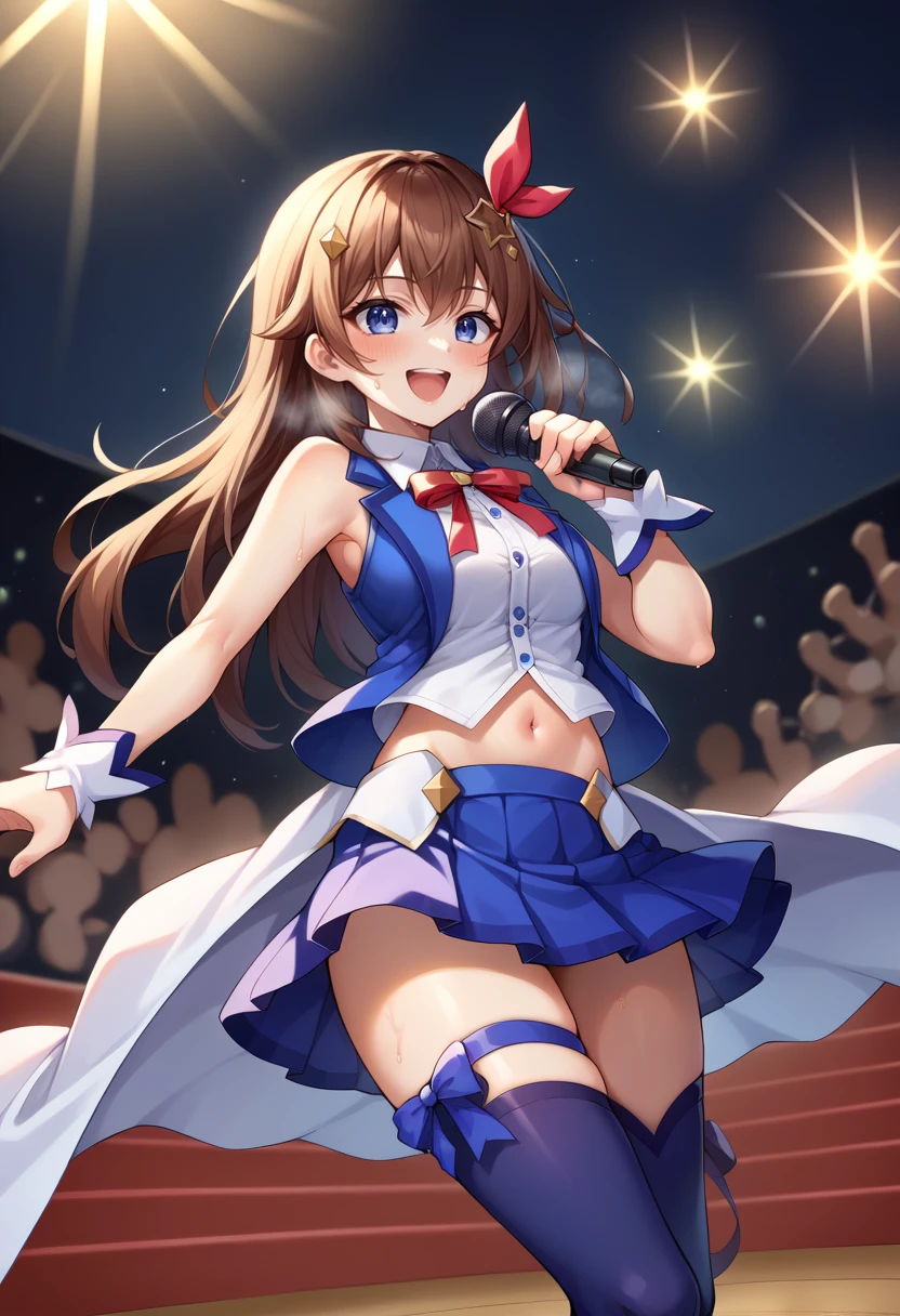 SoraBase, long hair, star hair ornament, hair ribbon, blue eyes, blue vest, sleeveless shirt, red ribbon, navel, wrist cuffs, blue skirt, blue thighhighs, thigh ribbon, waist cape