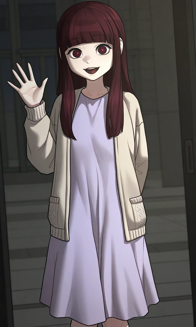 realityquestnewface, red hair, brown hair, long hair, blunt bangs, brown eyes, red eyes, dress, purple dress, cardigan, jacket