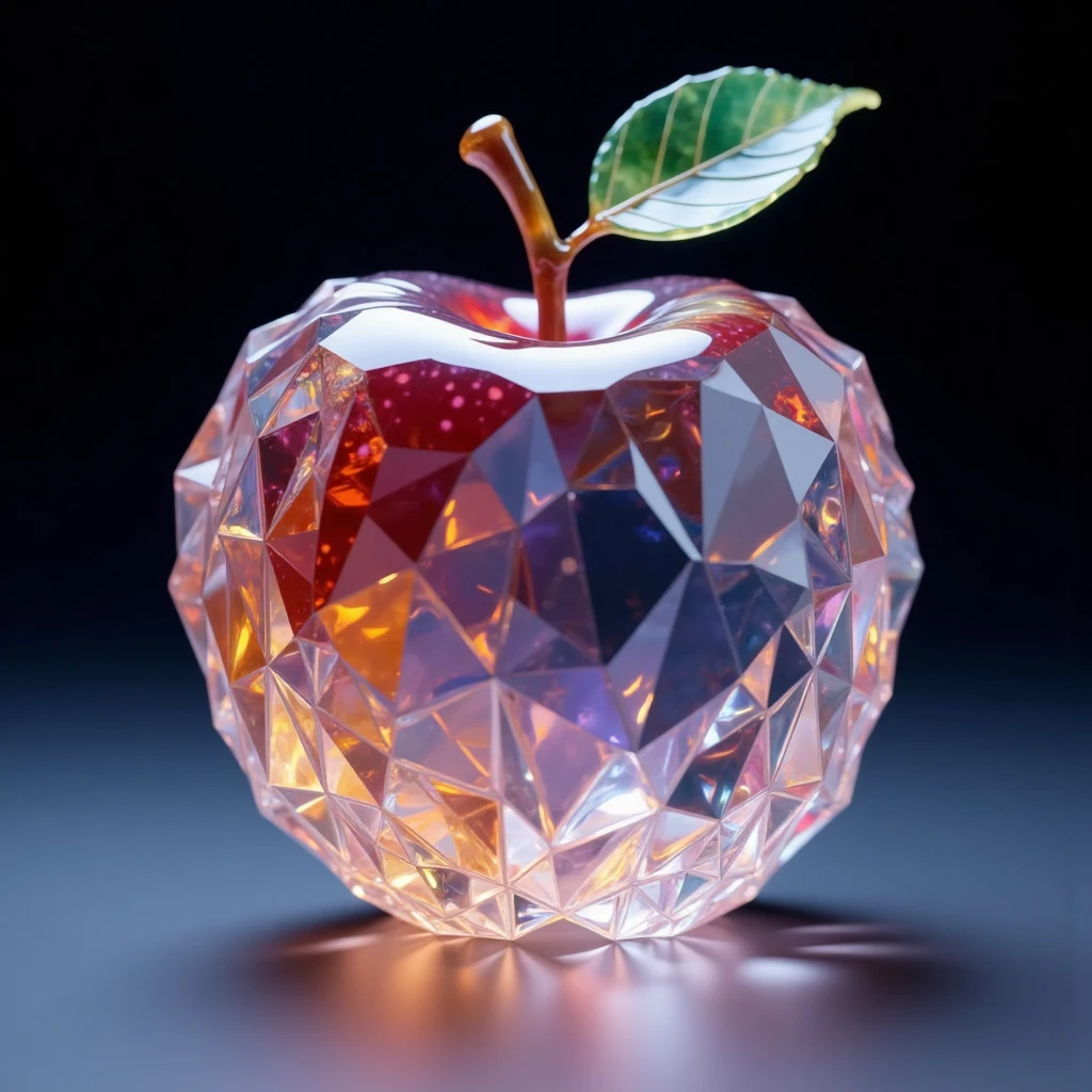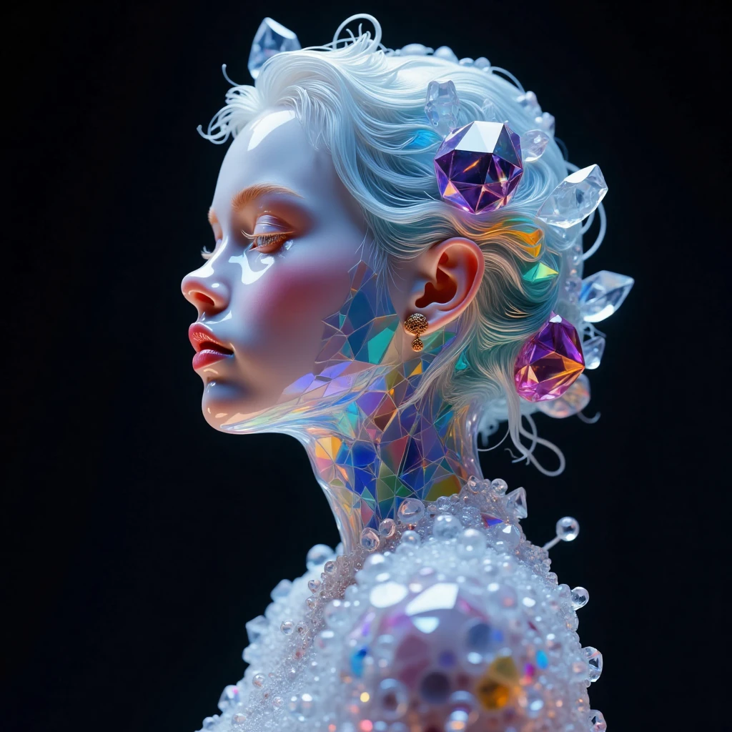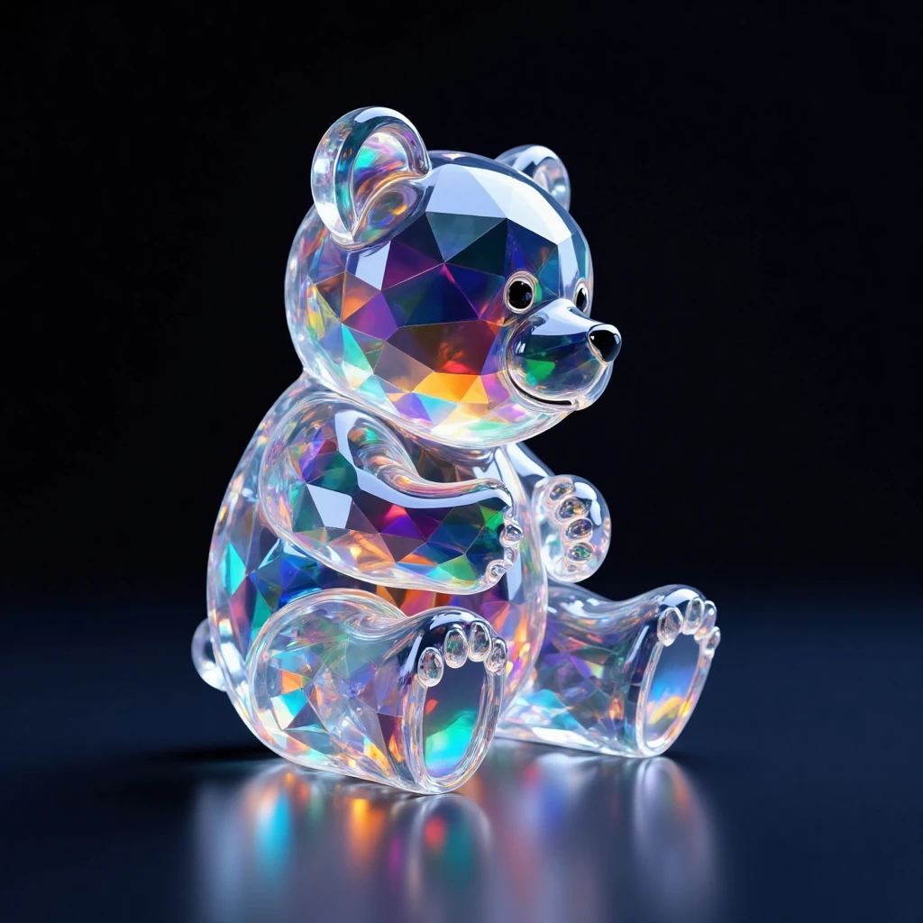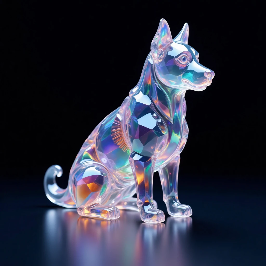 This is a very detailed digital artwork depicting a dog presented in a geometric and glass style. Composed of many multi-faceted semi transparent glass like surfaces that can capture and reflect light,creating a charming,almost ethereal effect. The overall piece is made of glass that is glass clear,emitting a colorful glow under the refraction of light,adding depth and richness to this work.,The sharp serrated edges contrast sharply with the smooth reflective surface. The background is a gradient of cool blue and purple,black background,