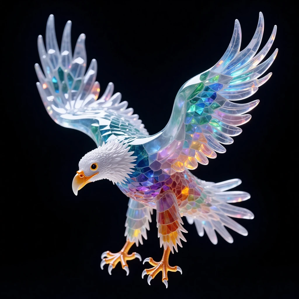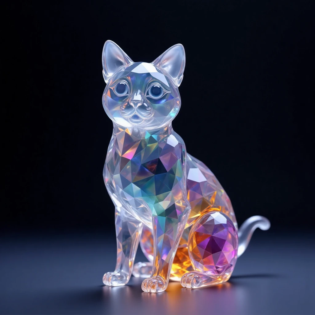 This is a very detailed digital artwork depicting a cat presented in a geometric and glass style. Composed of many multi-faceted semi transparent glass like surfaces that can capture and reflect light,creating a charming,almost ethereal effect. The overall piece is made of glass that is glass clear,emitting a colorful glow under the refraction of light,adding depth and richness to this work.,The sharp serrated edges contrast sharply with the smooth reflective surface. The background is a gradient of cool blue and purple,black background,