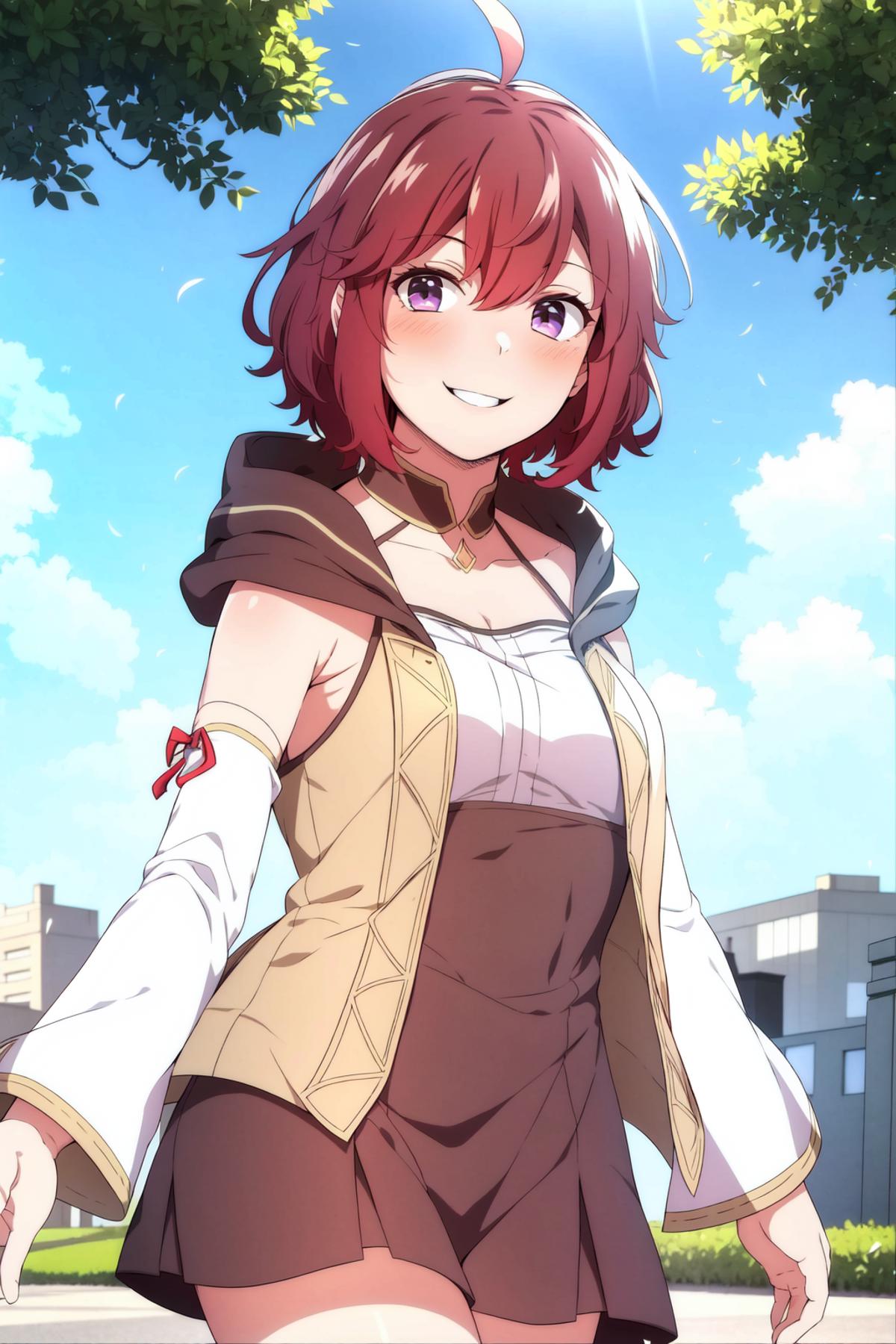 Triggers: malori, 1girl, red hair, purple eyes, bangs, short hair,