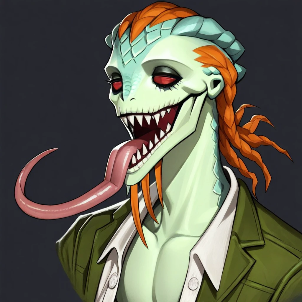 Evil Reptilian, orange hair, blue scales, green scales, red eyes, green jacket, white button shirt, open shirt, anthro lizard