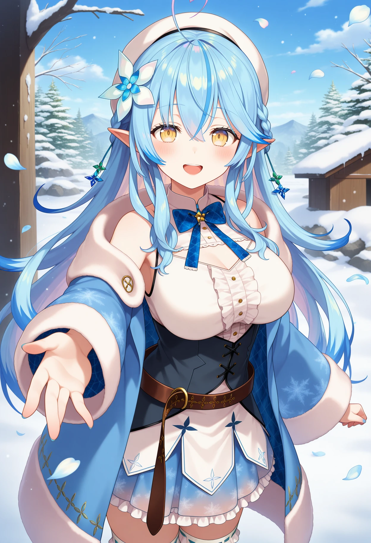 outfit1-1aalamy, long hair, blue hair, ahoge, braid, beret, white headwear, hair flower, hair ornament, pointy ears, yellow eyes, blue bowtie, clothing cutout, white shirt, sleeveless, off shoulder, blue coat, corset, brown belt, blue skirt, white thighhighs
