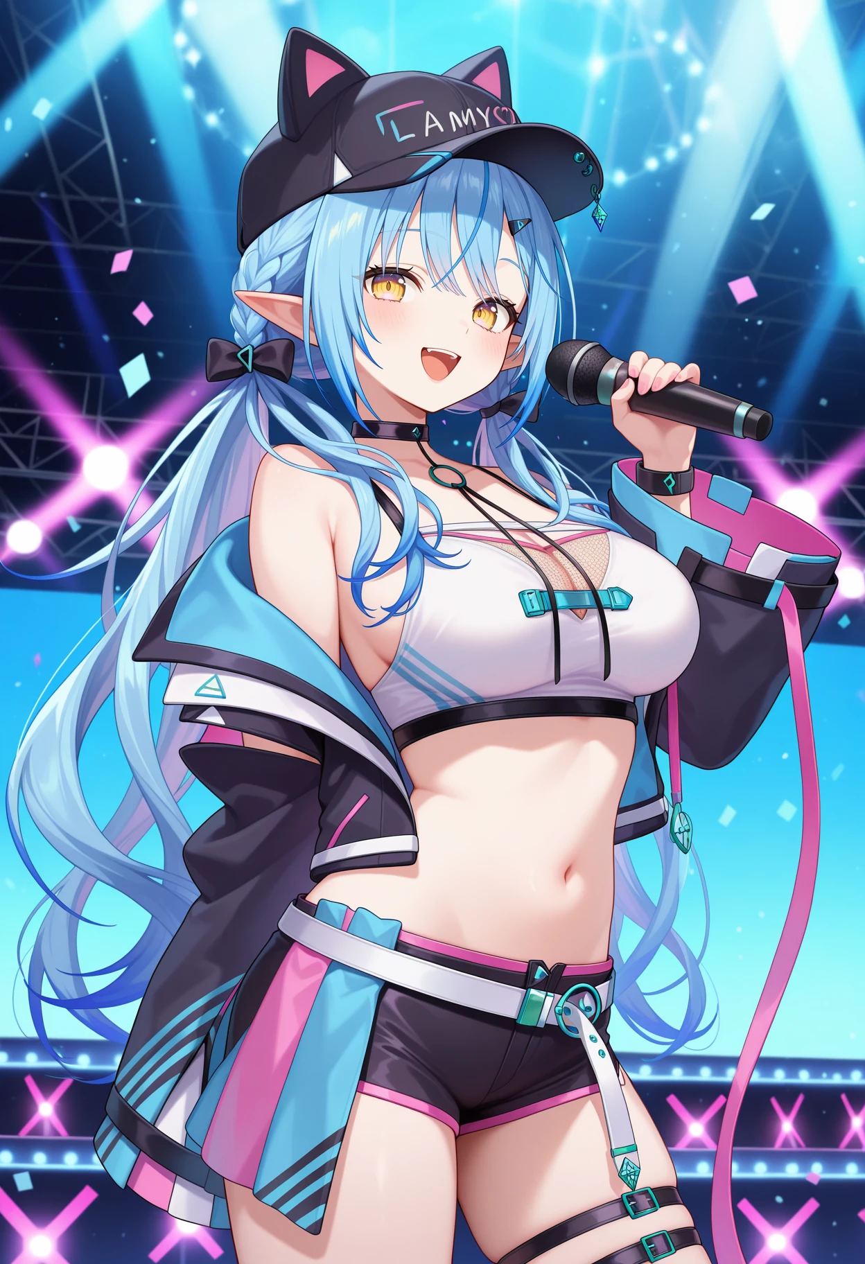outfit7gglamy, long hair, blue hair, yellow eyes, black shorts, pointy ears, fishnets, choker, black jacket, thigh strap, baseball cap, midriff, black headwear, long sleeves, crop top, off shoulder, hair ornament, hair bow, braid, low twintails, fake animal ears, white shirt, o-ring, white belt