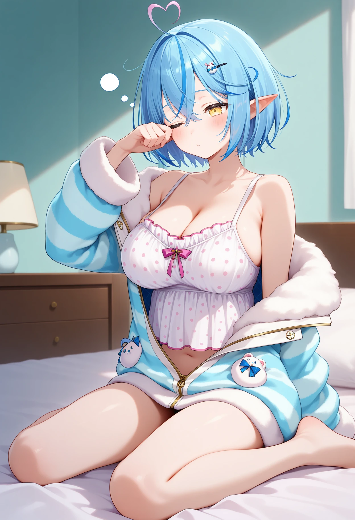 outfit5-1eelamy, short hair, blue hair, ahoge, hairclip, pointy ears, yellow eyes, bare shoulders, cleavage, polka dot, white camisole, off shoulder, fur trim, striped jacket, blue jacket, long sleeves, midriff