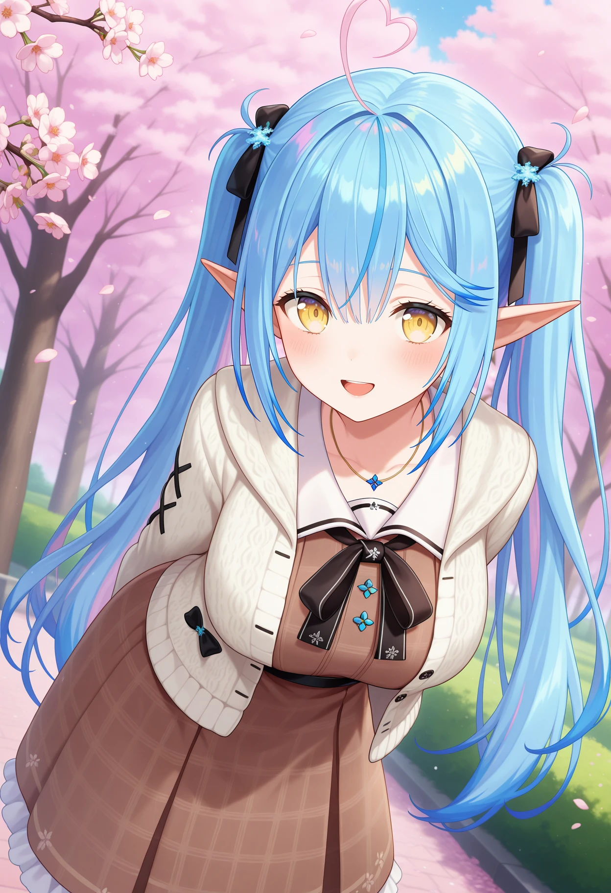 outfit4-1ddlamy, long hair, blue hair, twintails, ahoge, hair ribbon, pointy ears, yellow eyes, necklace, white sailor collar, neck ribbon, plaid dress, brown dress, white cardigan, long sleeves