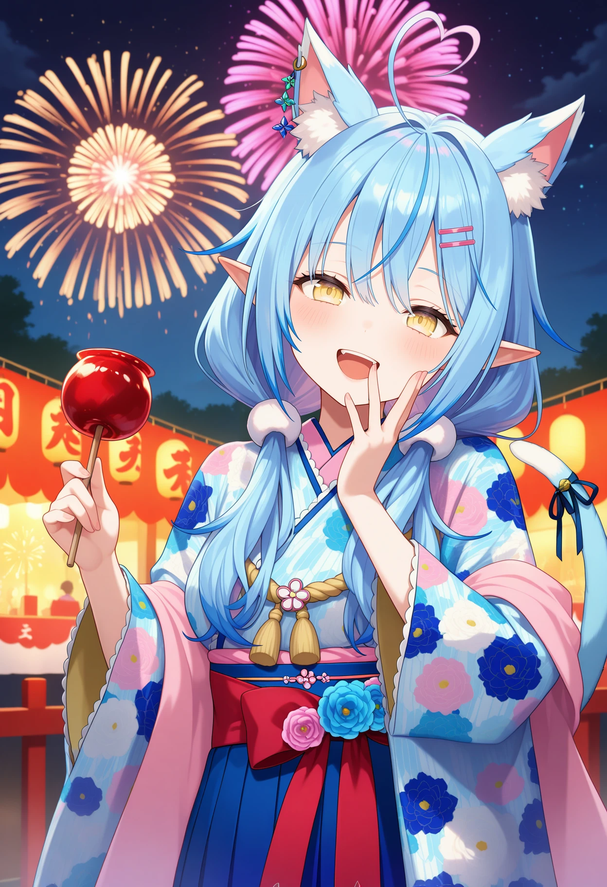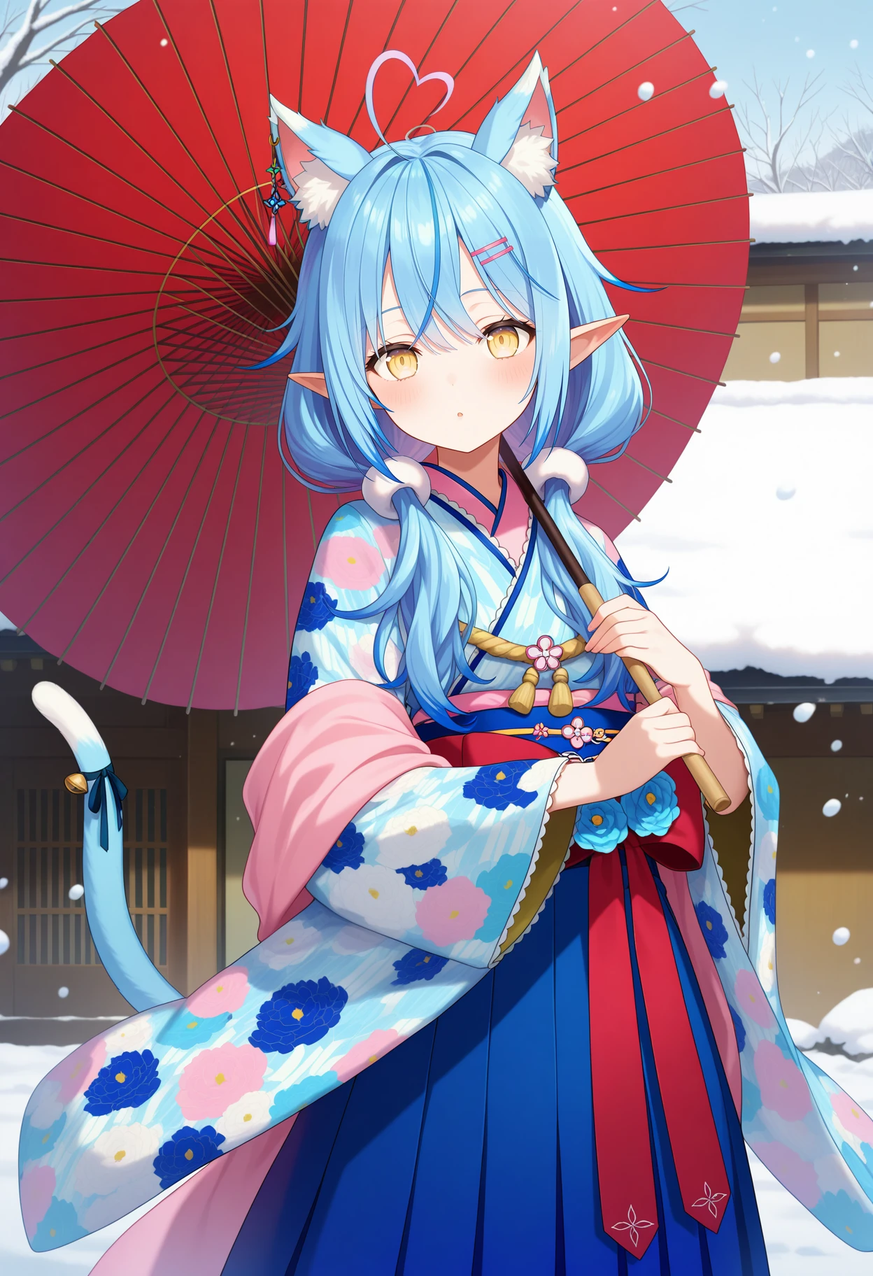 outfit2bblamy, long hair, blue hair, low twintails, ahoge, animal ears, piercing, hairclip, pointy ears, yellow eyes, tail, tail ribbon, print kimono, blue kimono, pink shawl, long sleeves, wide sleeves, sash, obi, hakama skirt, blue hakama