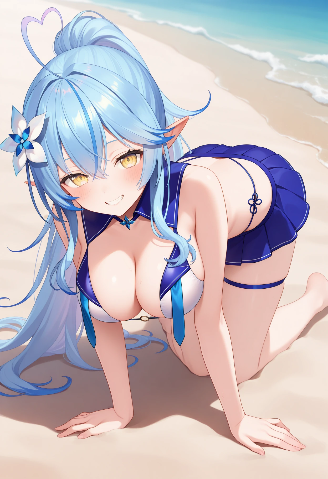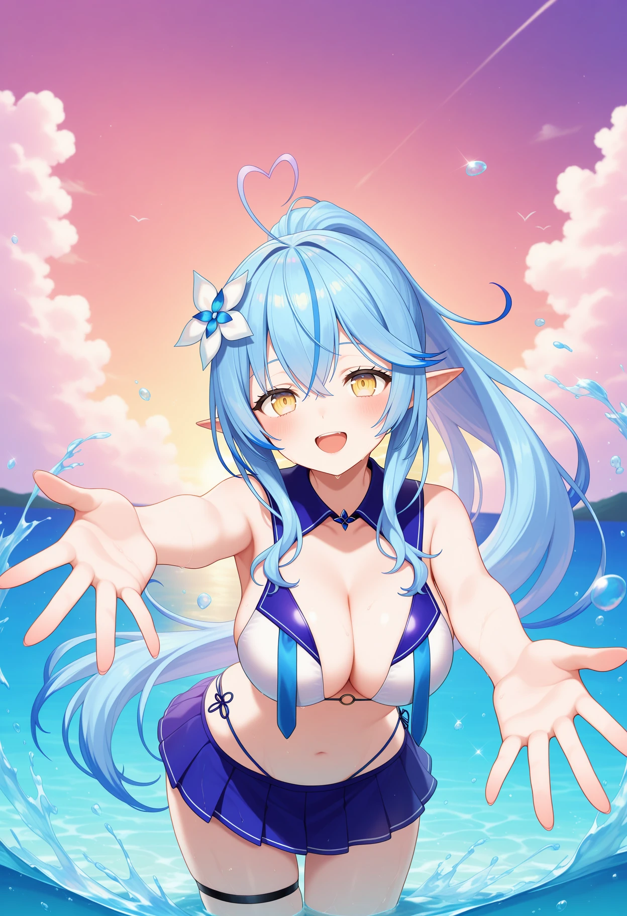outfit3cclamy, long hair, blue hair, ponytail, ahoge, hair flower, pointy ears, yellow eyes, sailor collar, cleavage, o-ring bikini, sailor bikini, side-tie bikini bottom, bikini skirt, microskirt, blue skirt, thigh strap