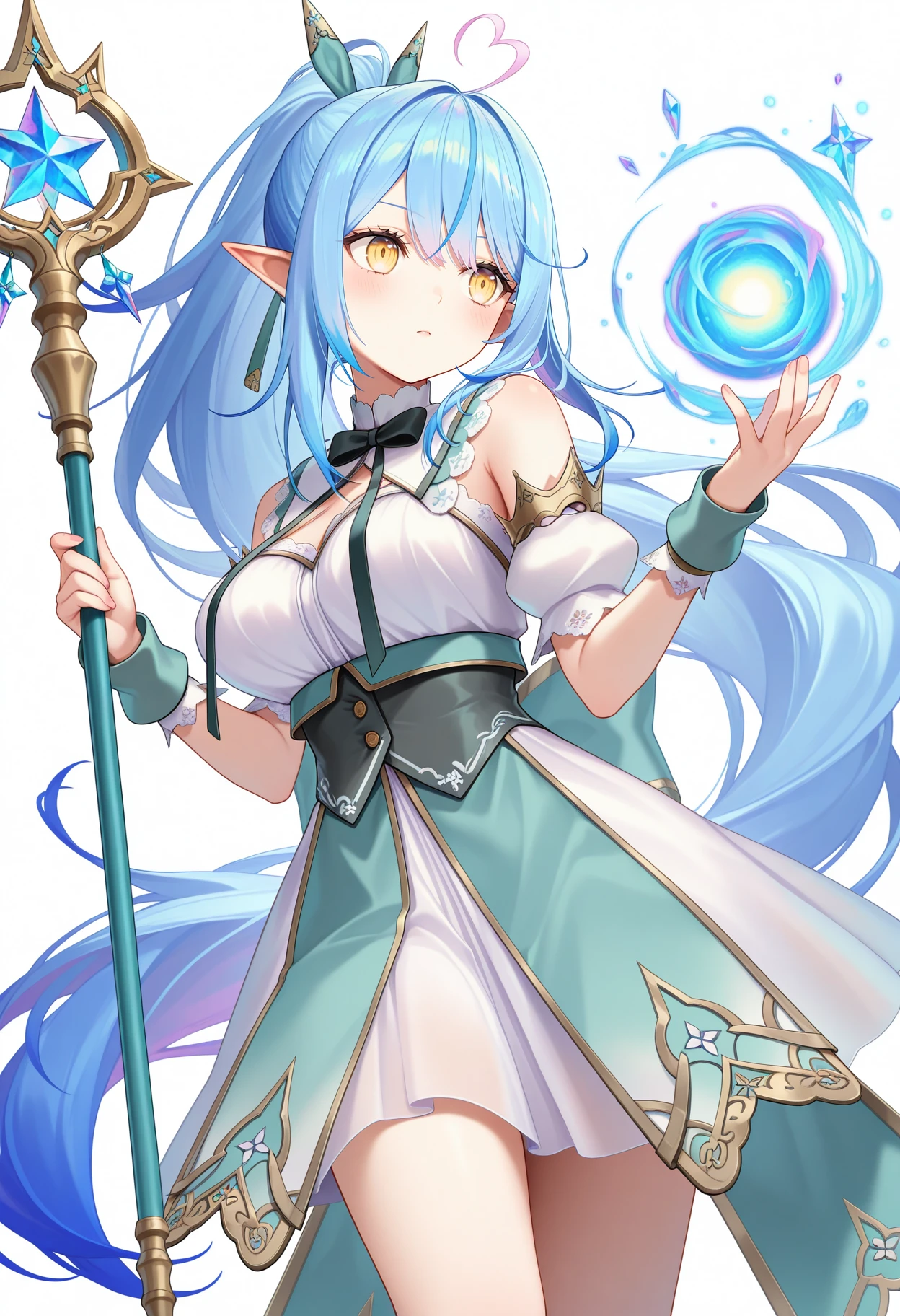 outfit6fflamy, long hair, blue hair, ponytail, ahoge, pointy ears, yellow eyes, bare shoulders, black bowtie, clothing cutout, white dress, sleeveless, detached sleeves, wrist cuffs, underbust, bustier