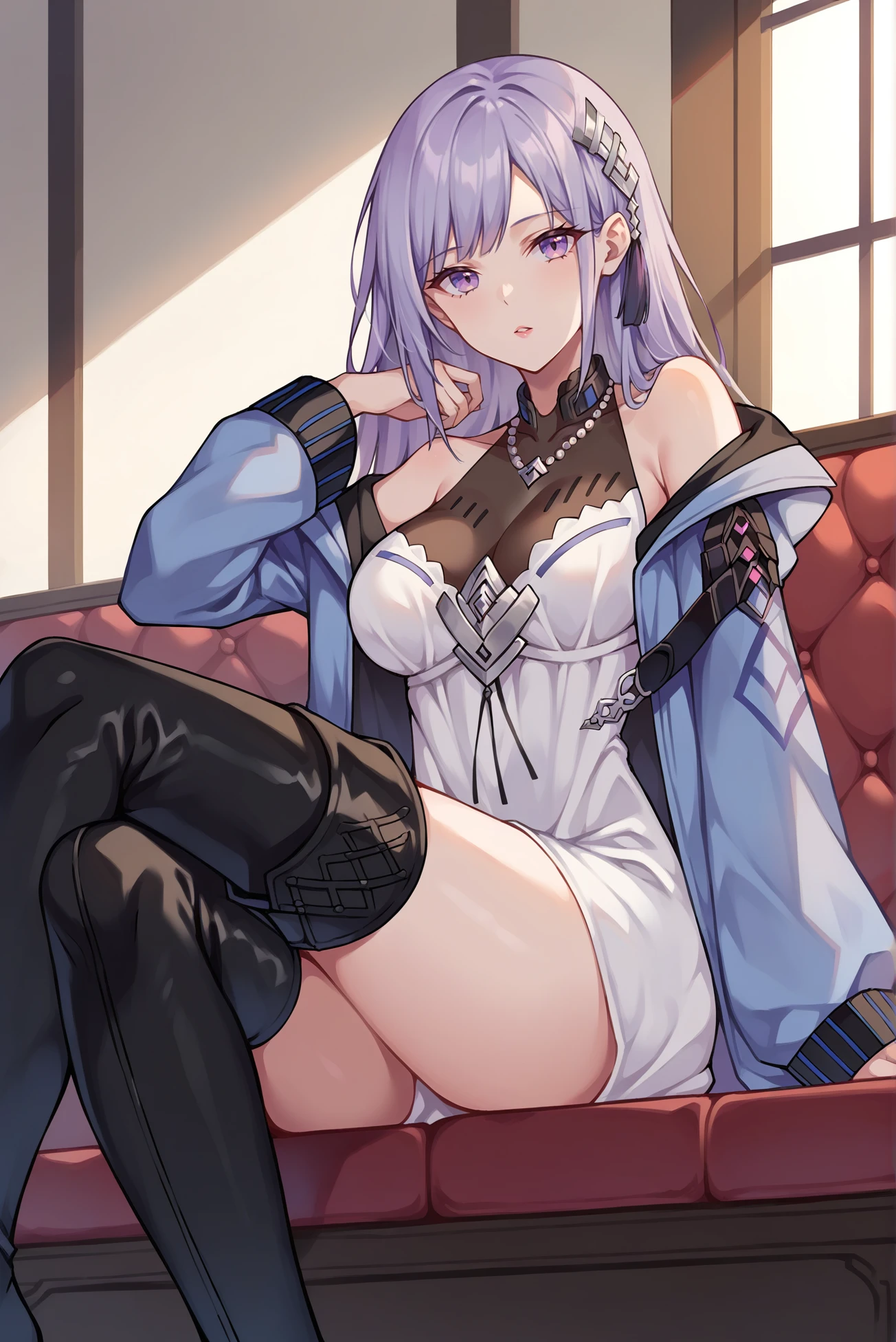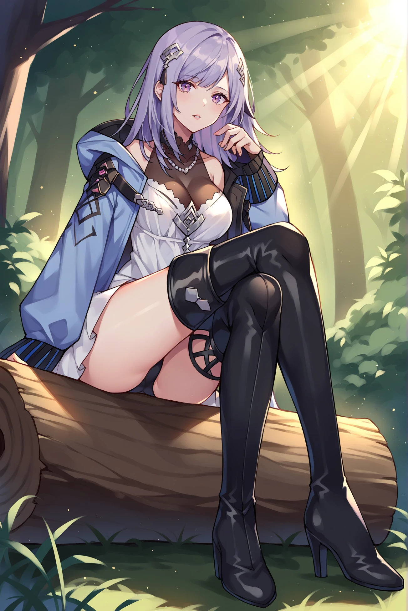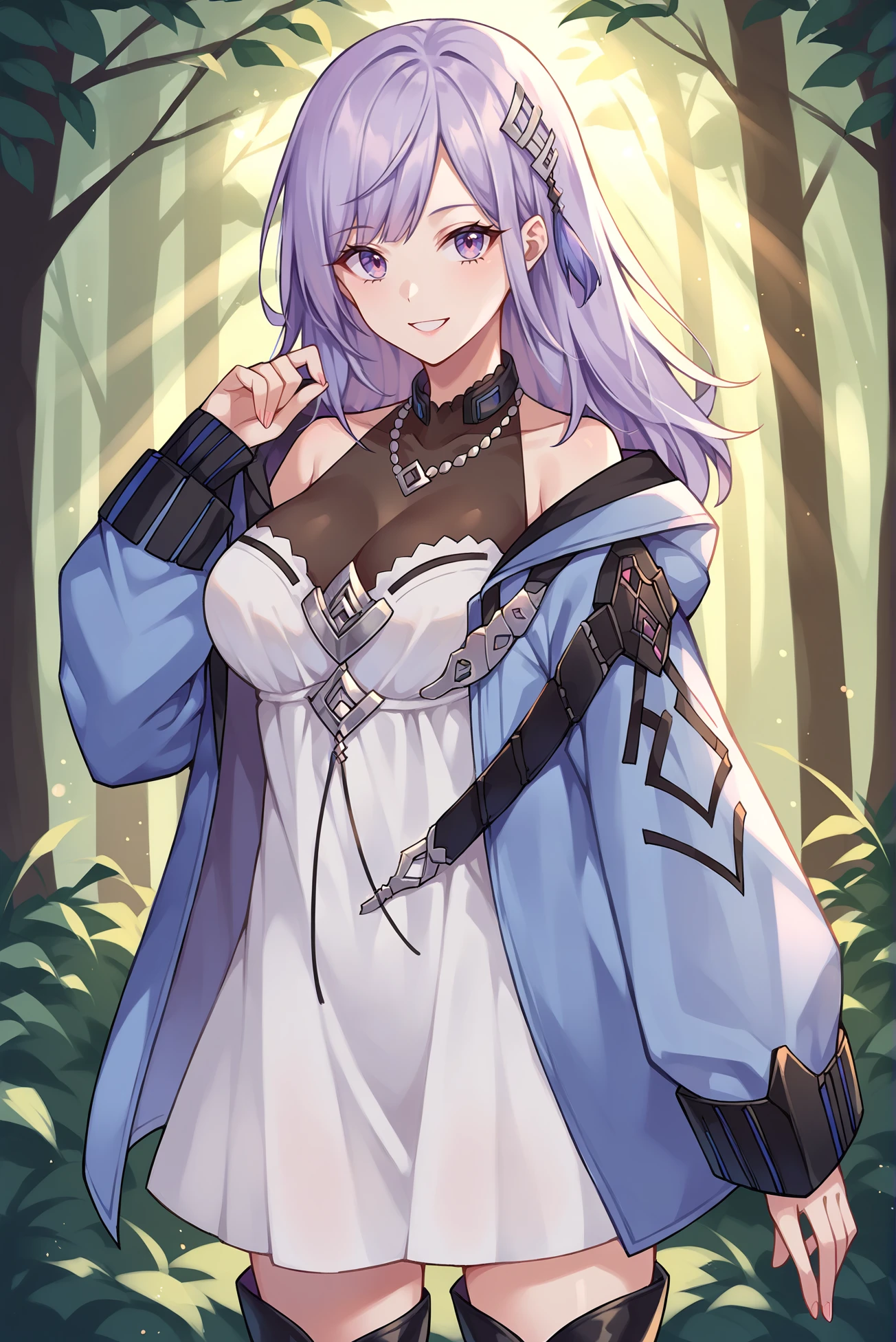 Tags: light purple hair, long hair, hair ornament, necklace, black thigh boots, white dress, dark blue jacket