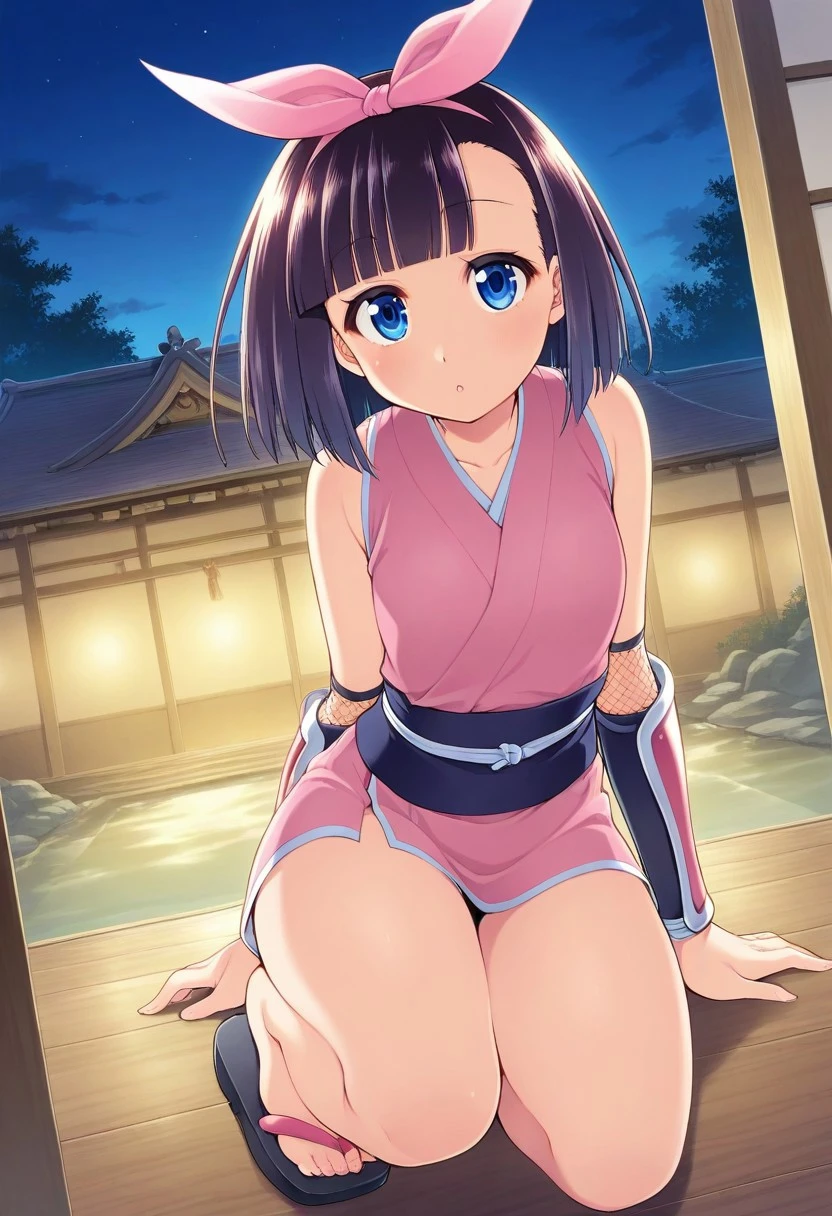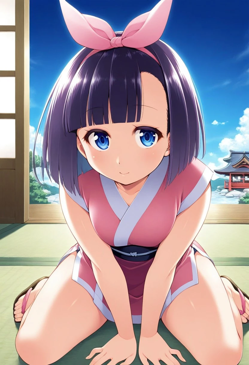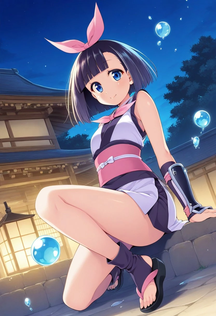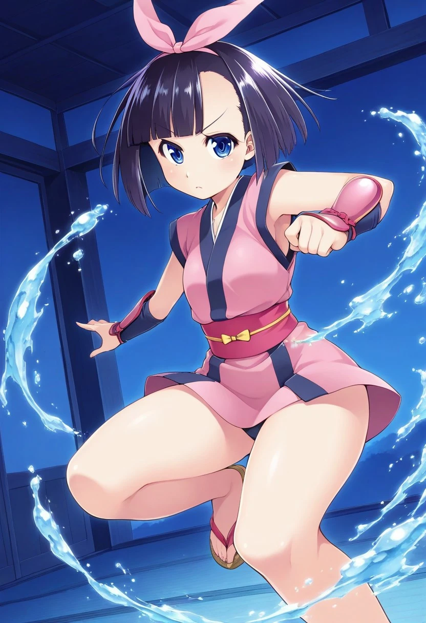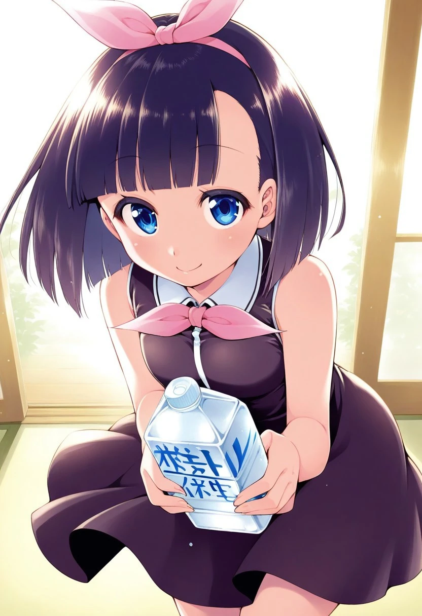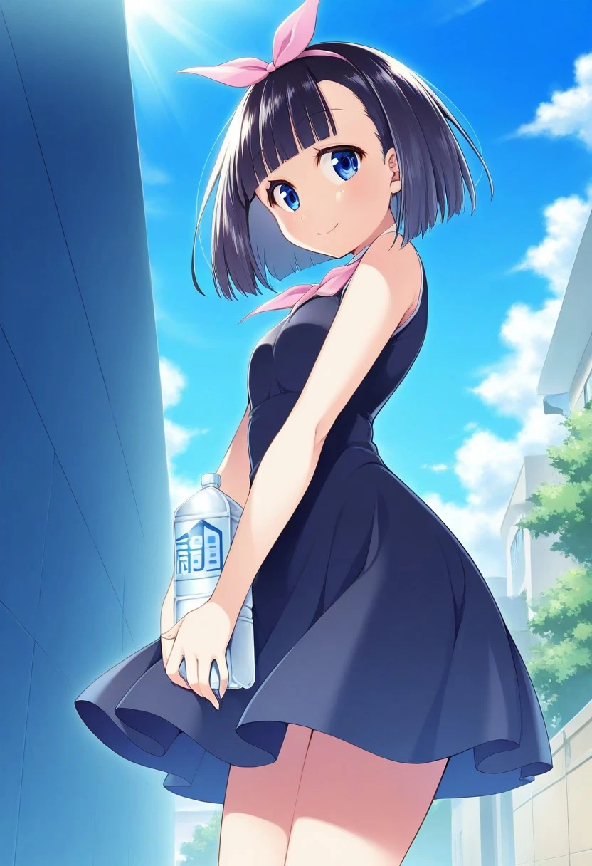 Nagarekawa Mion, bow, dress, black dress, blue neck scarf, solo, 1girl, blue_eyes, blunt_bangs, short_hair, pink_bow, bow, hair_bow, black_hair, small breasts, bottle, holding water bottle, light blue shoes, sleeveless_dress
