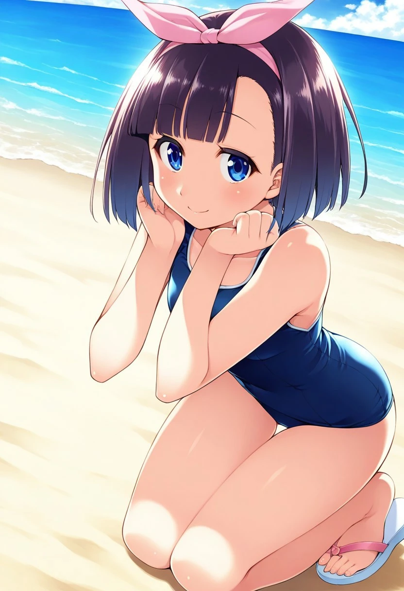 blue swimsuit, sandals