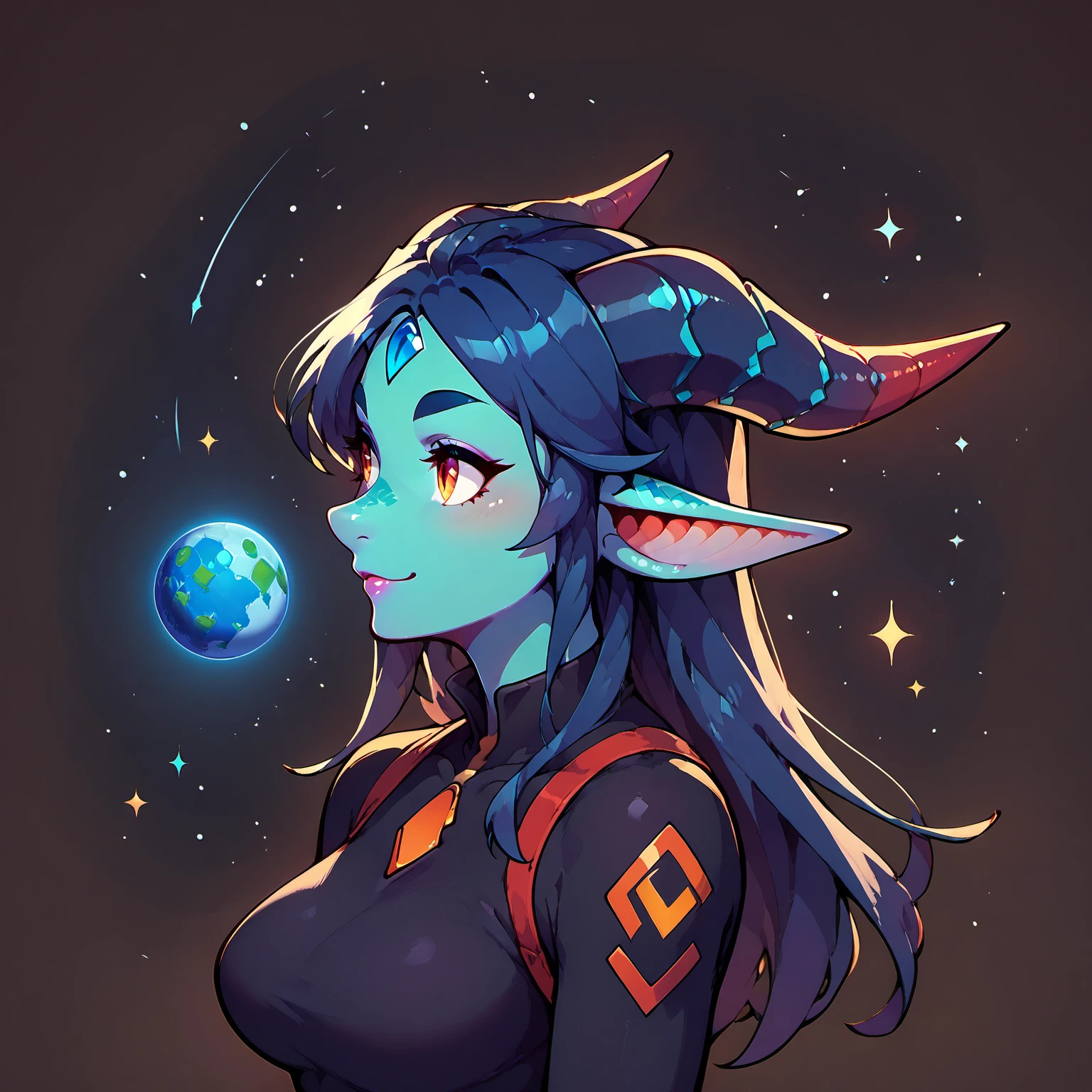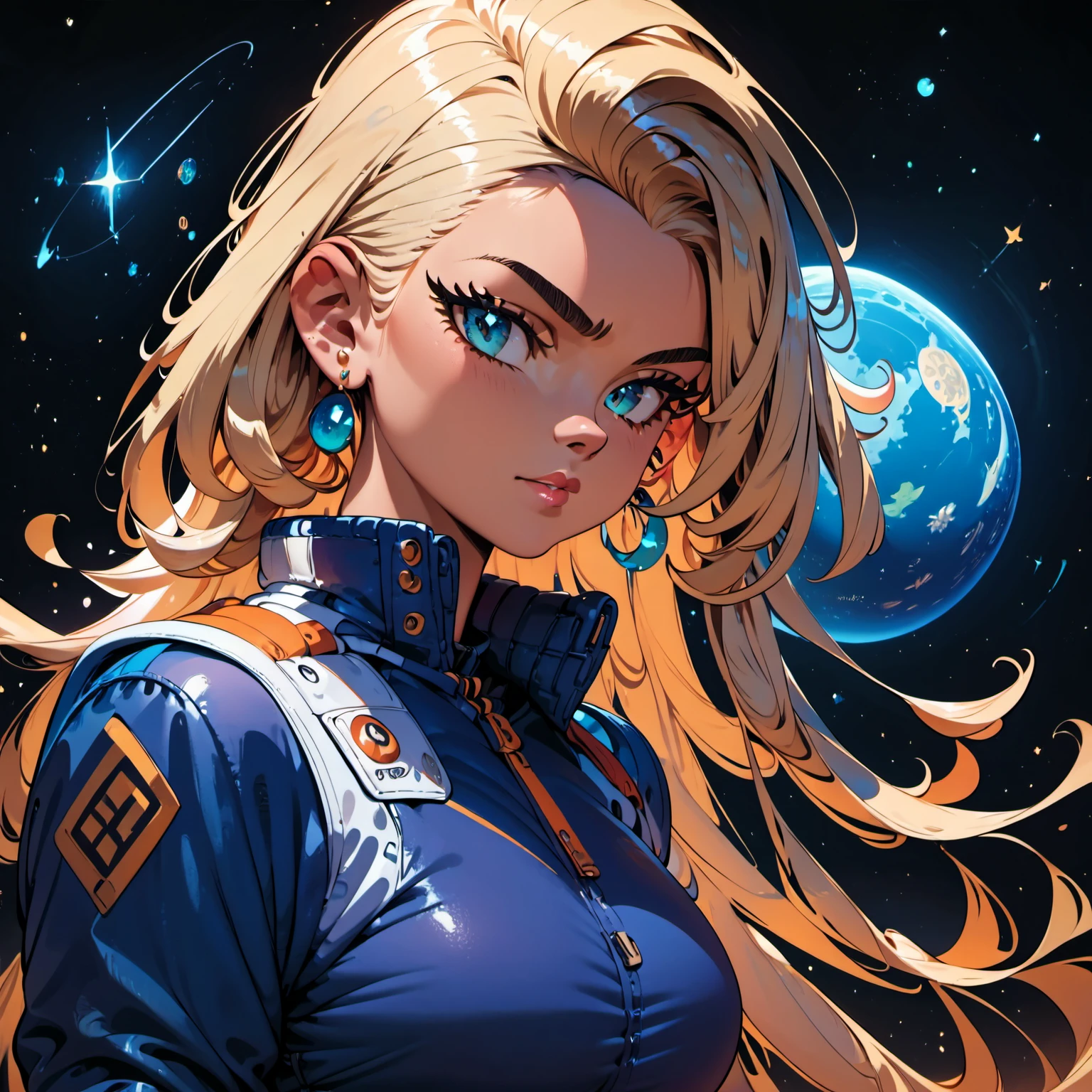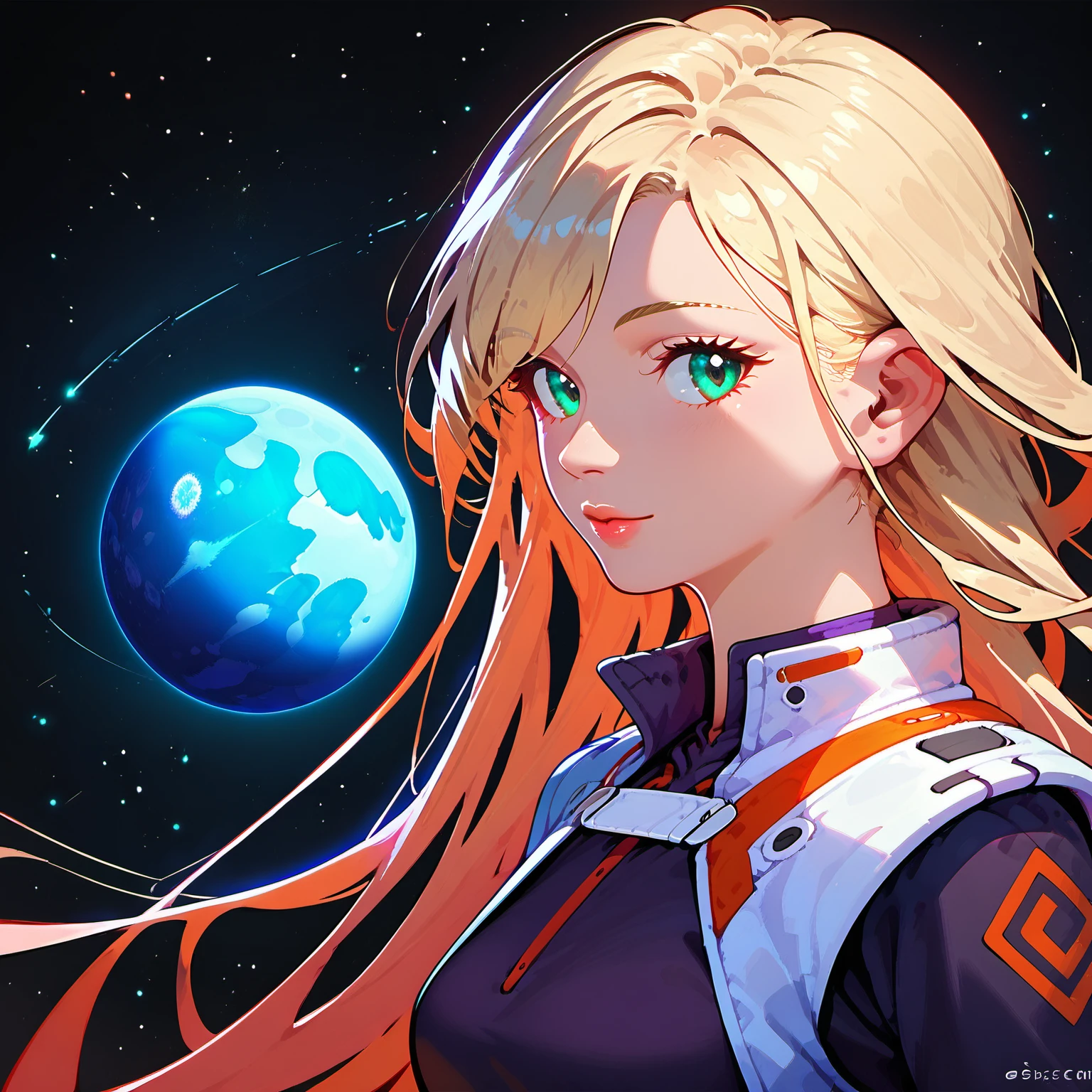 Long form captioning: woman, outer space, stars, medium breasts, from side, smile, long blonde hair, lips, green eyes, blue planet, looking at viewer, space uniform