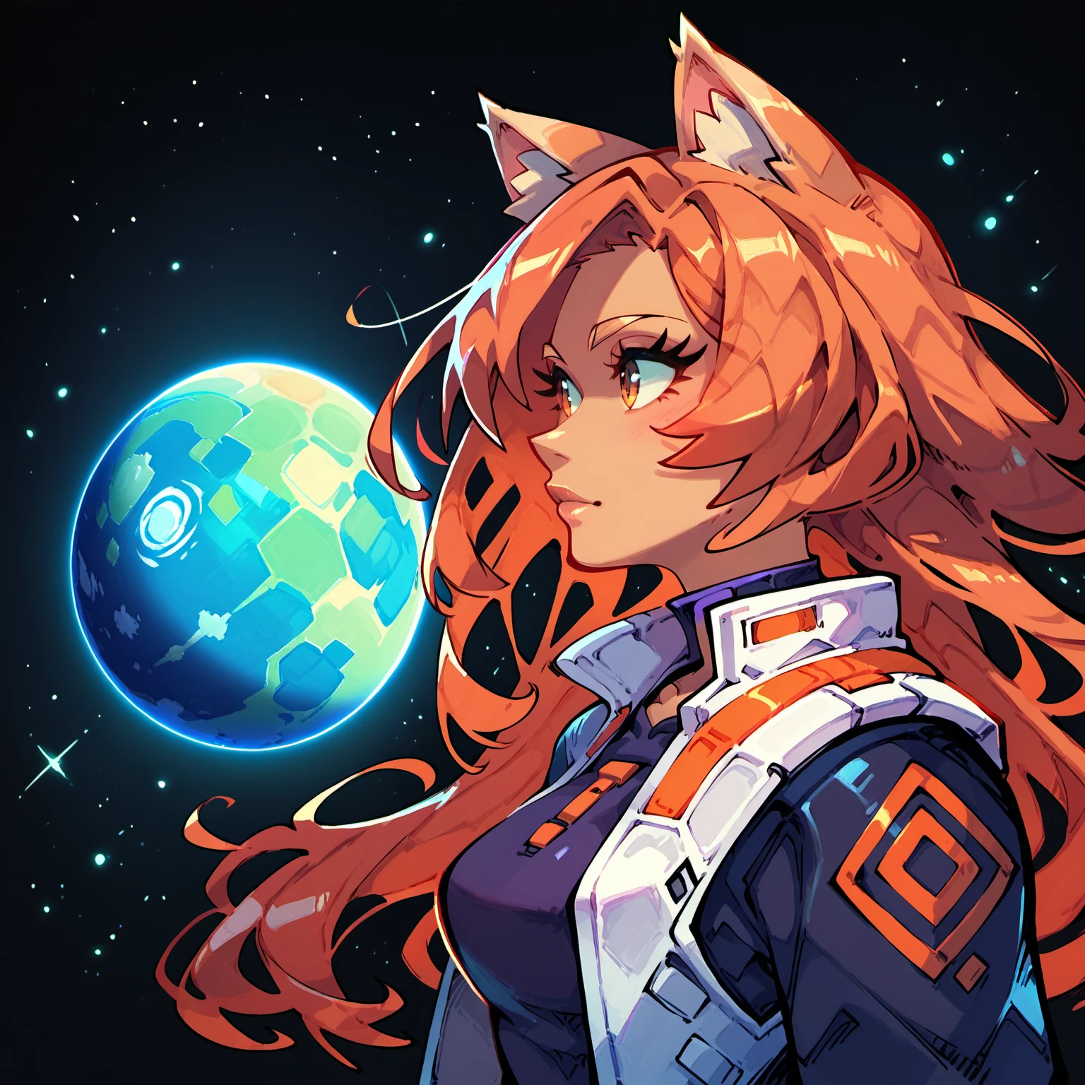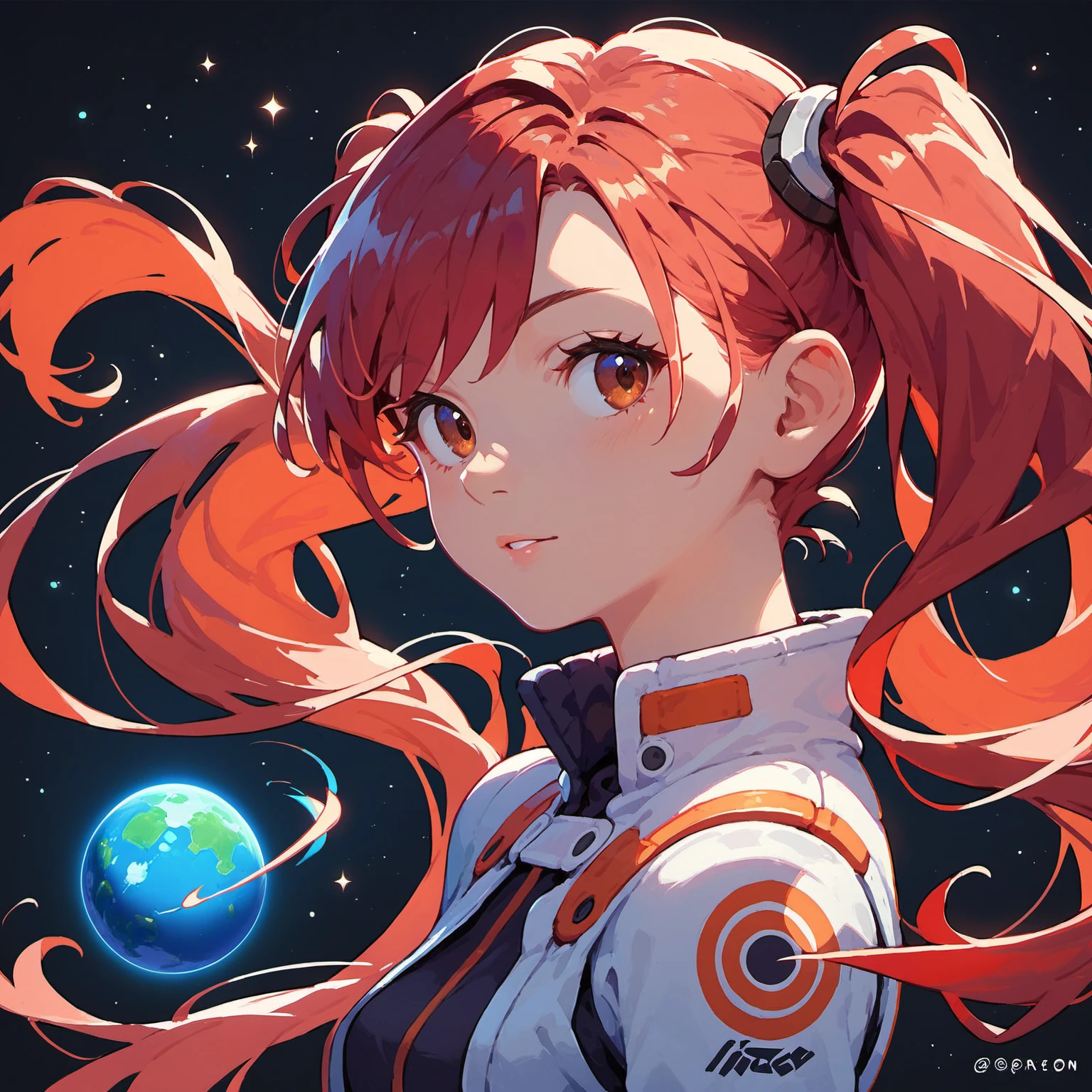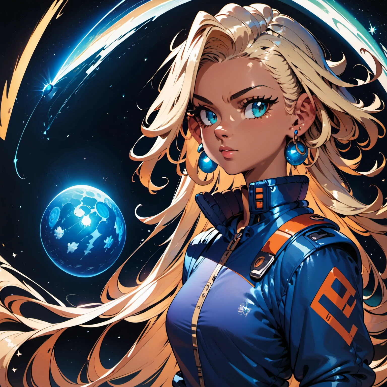 Medium form captioning: woman, outer space, from side, space uniform, planet
